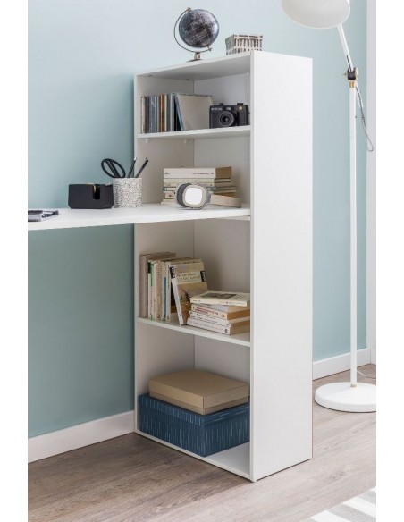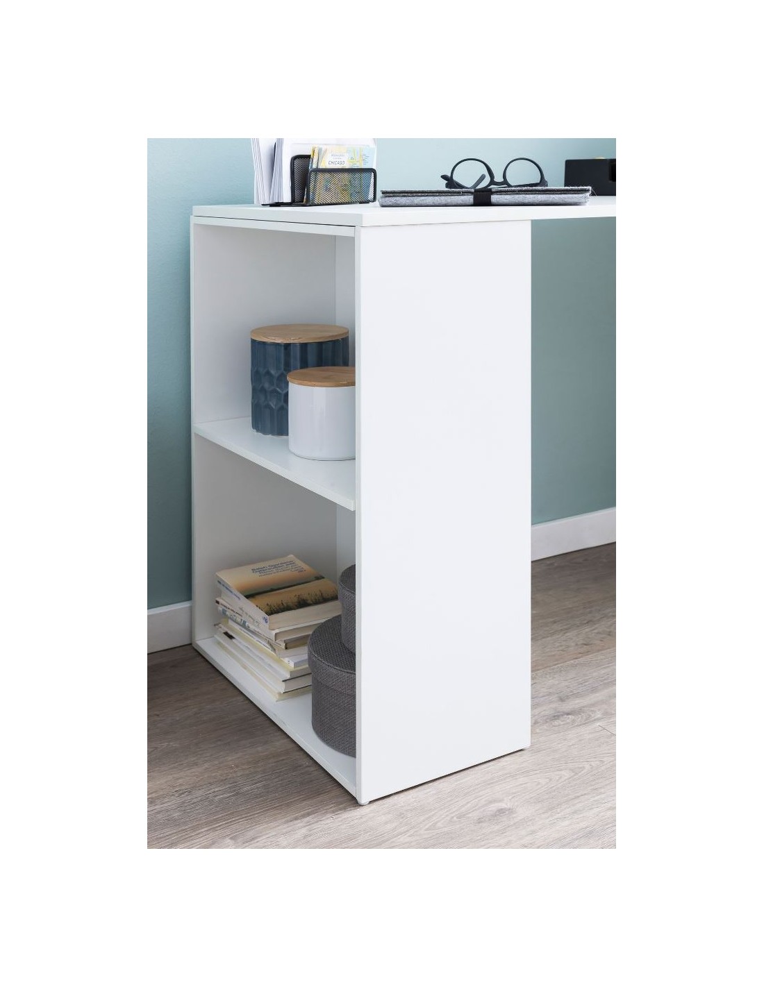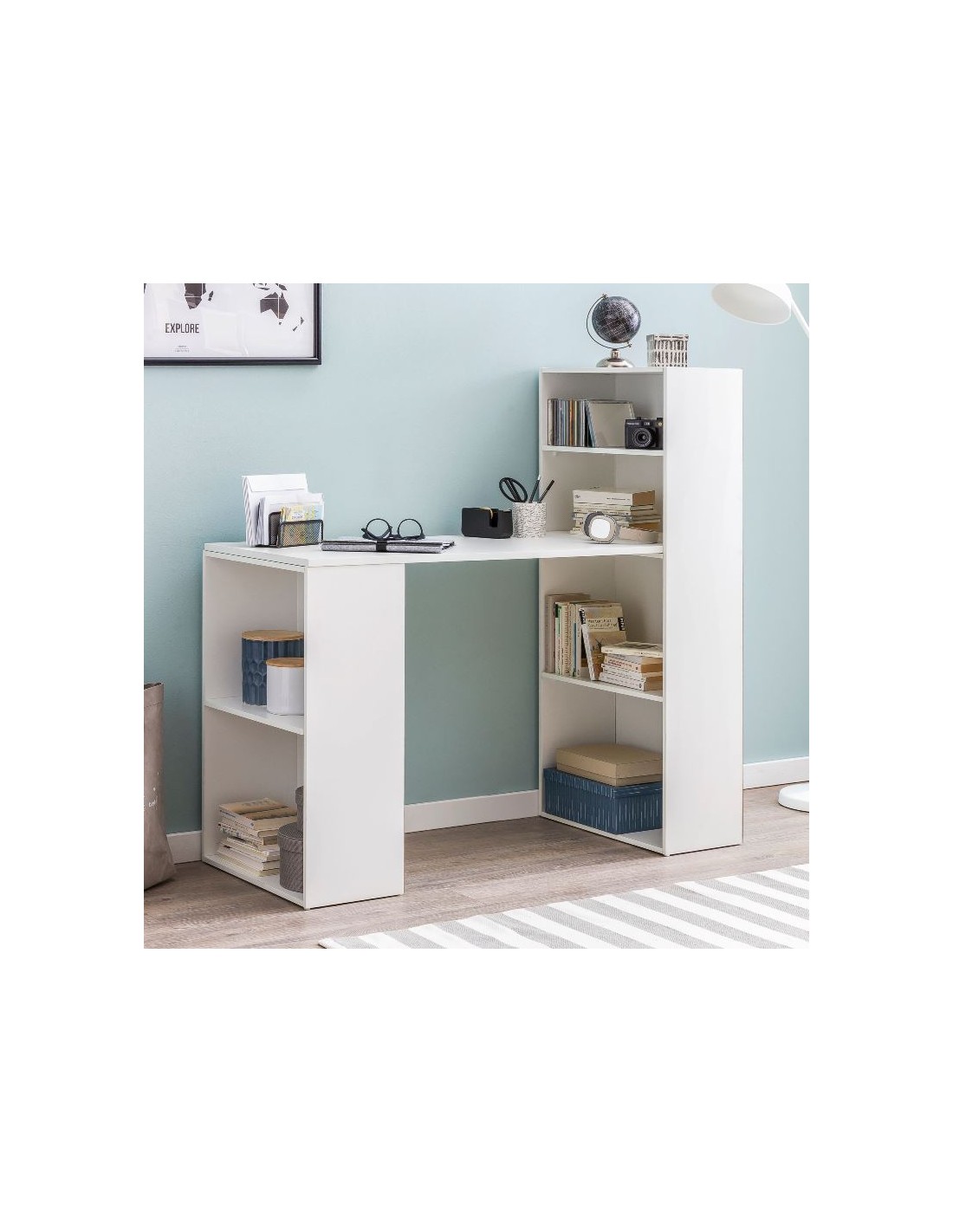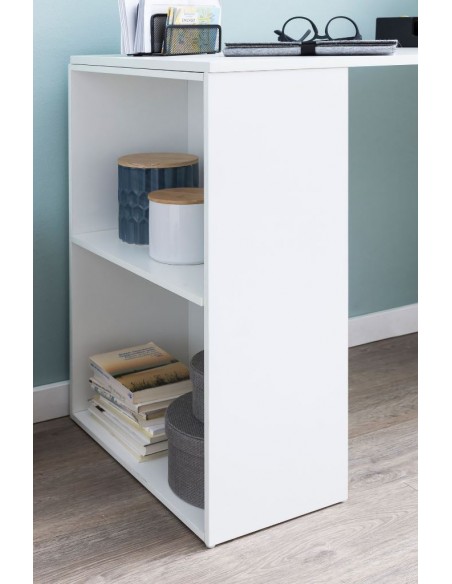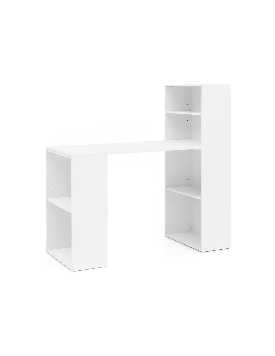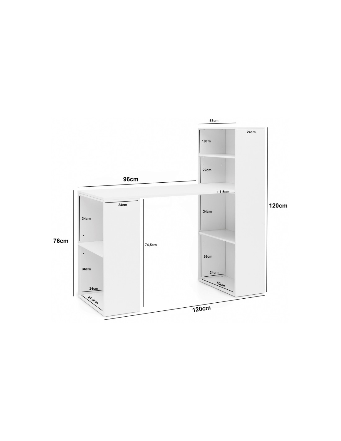 Skrivebord fremstillet i et design af hvid møbelplade. Bordet måler 76 - 120 cm i højden og 120 x 53 cm i bredde og dybde.