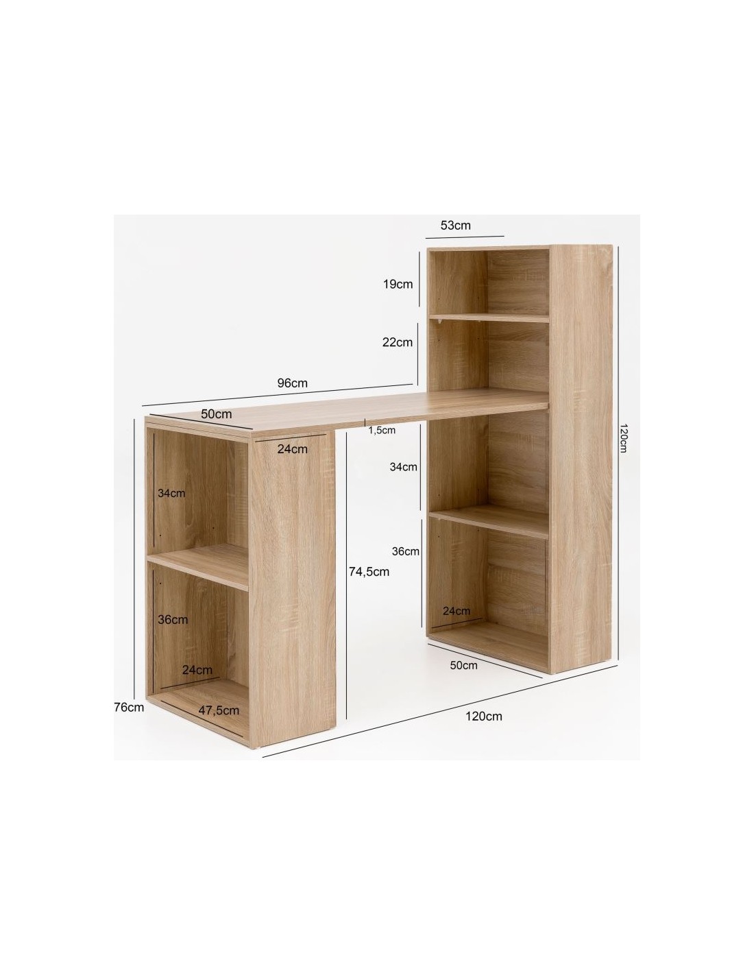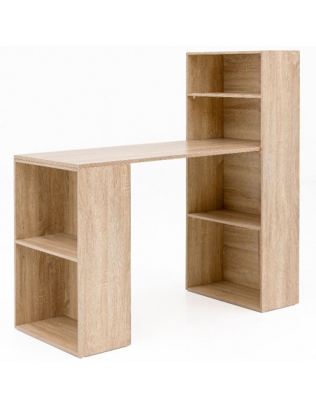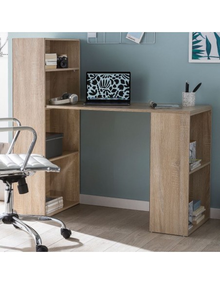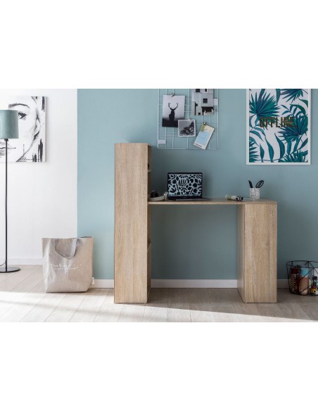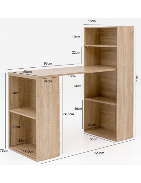 Skrivebord fremstillet i et design af sonoma egetræsfarvet møbelplade. Bordet måler 76 - 120 cm i højden og 120 x 53 cm i bredde og dybde.