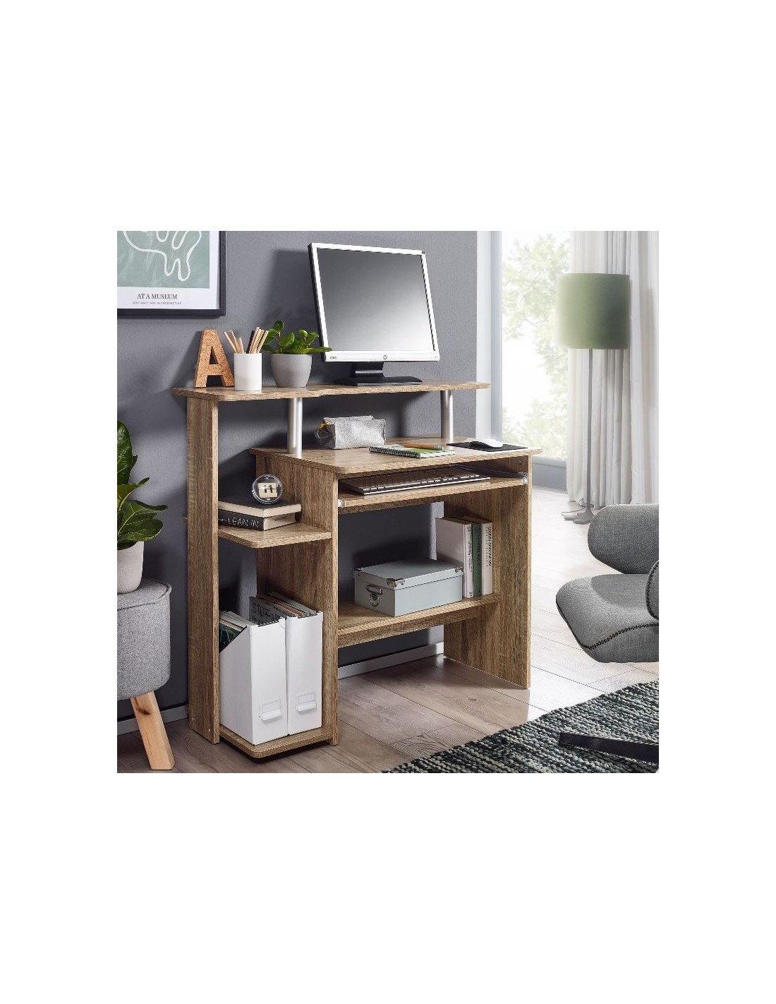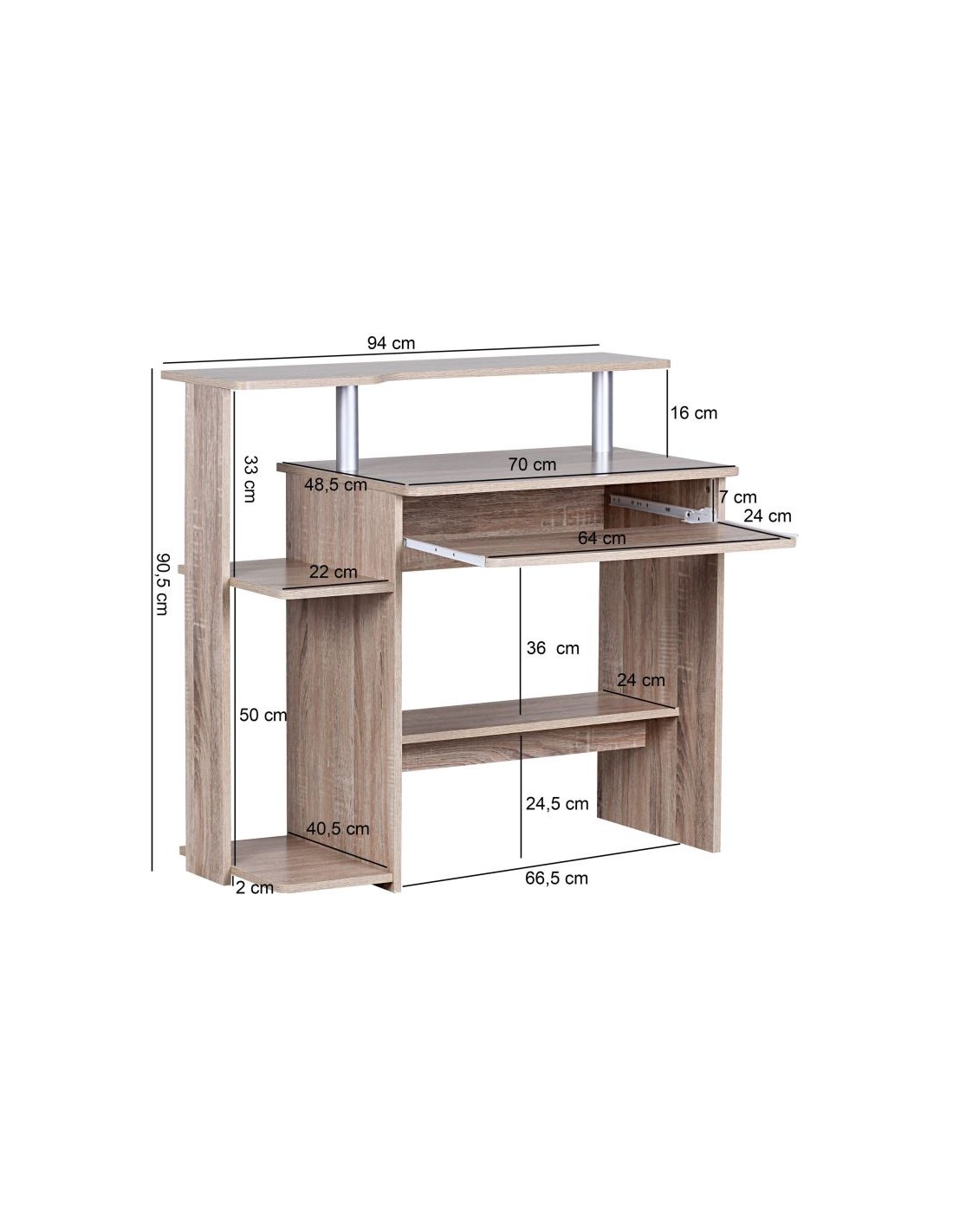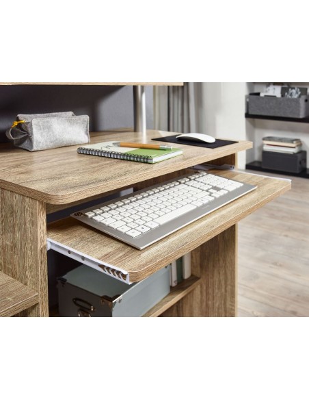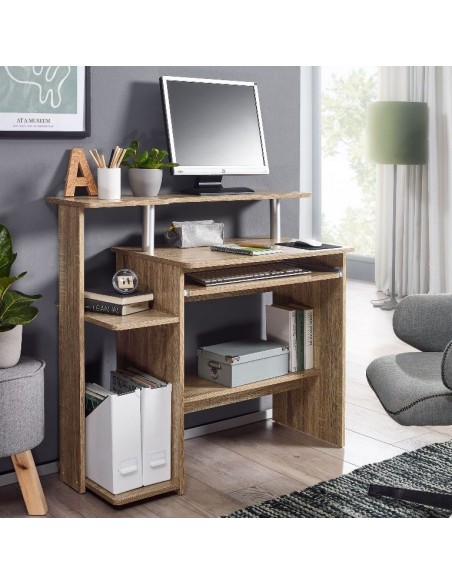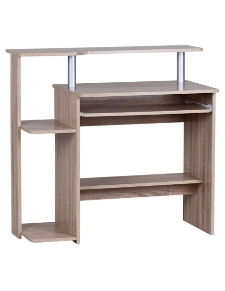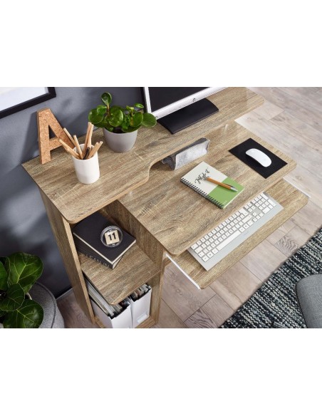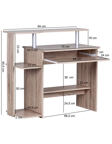 Computerbord fremstillet i et design af sonoma egetræsfarvet møbelplade. Bordet måler 67,5 - 90,5 cm i højden og 94 x 48,5 cm i bredde og dybde.
