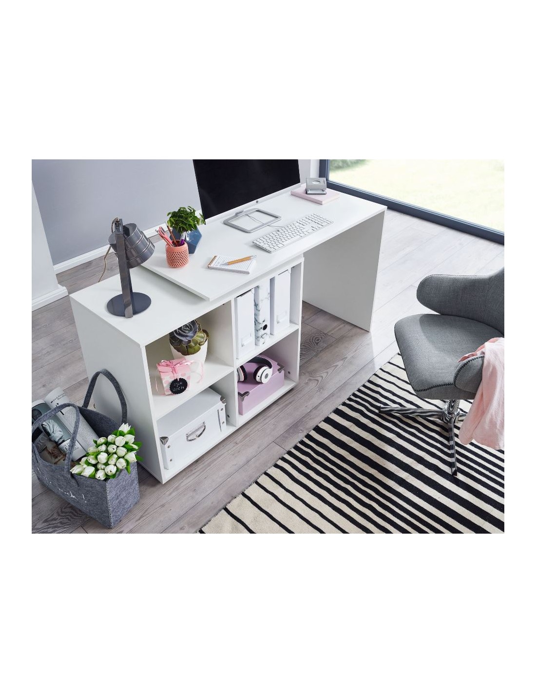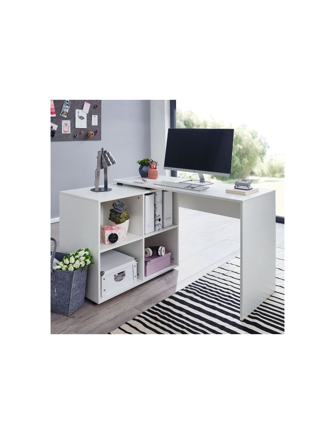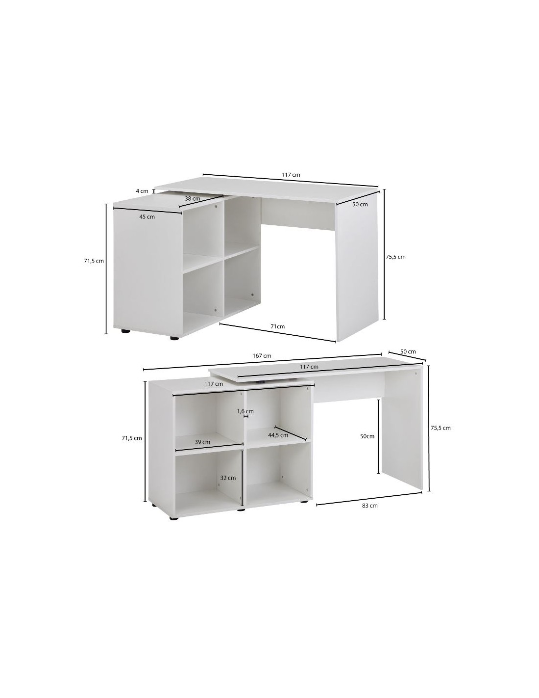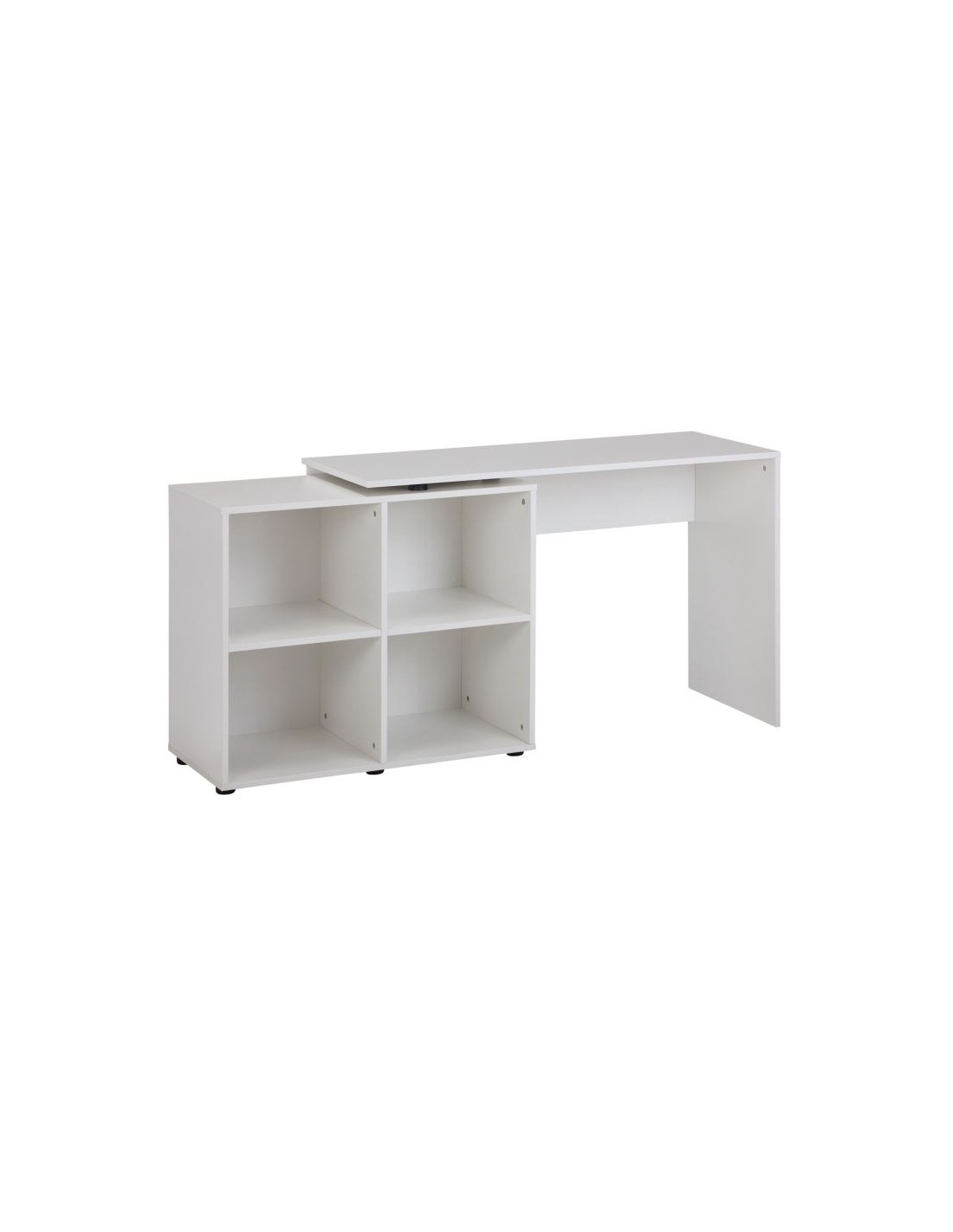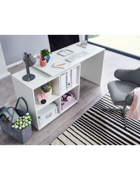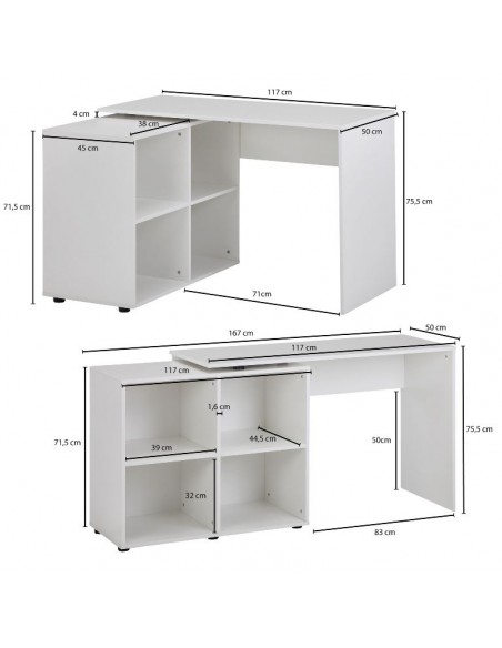 Skrivebord fremstillet i et design af hvid møbelplade. Bordet måler 71,5 - 75,5 cm i højden og 117 x 88 cm i bredde og dybde. Skrivebordet kan opstilles i vinkel eller som ret version.