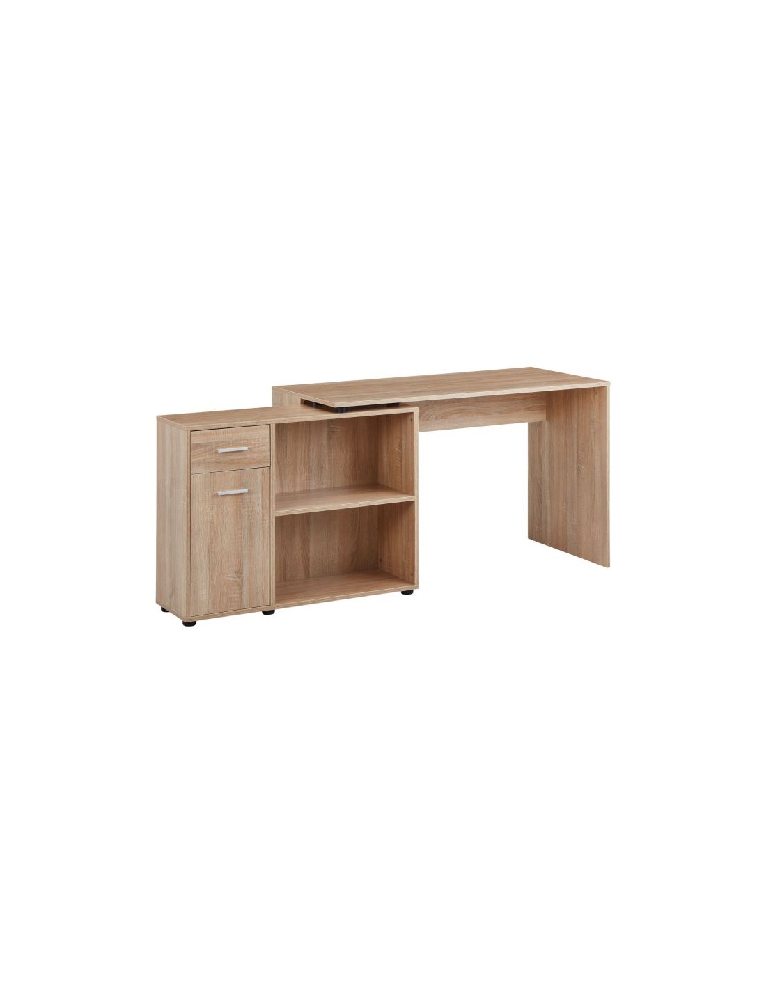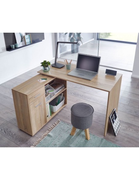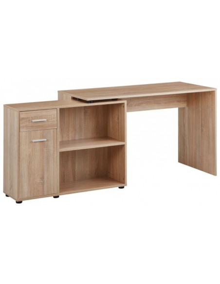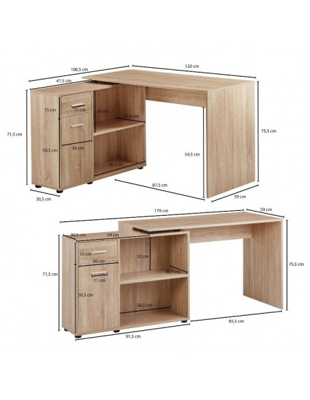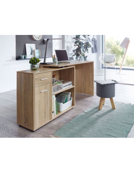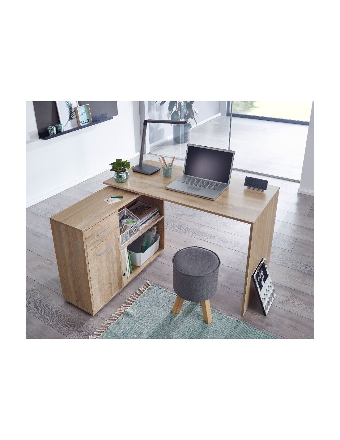 Skrivebord fremstillet i et design af sonoma egetræsfarvet møbelplade. Bordet måler 71,5 - 75,5 cm i højden og 120 x 106,5 cm i bredde og dybde. Skrivebordet kan opstilles i vinkel eller som ret version.