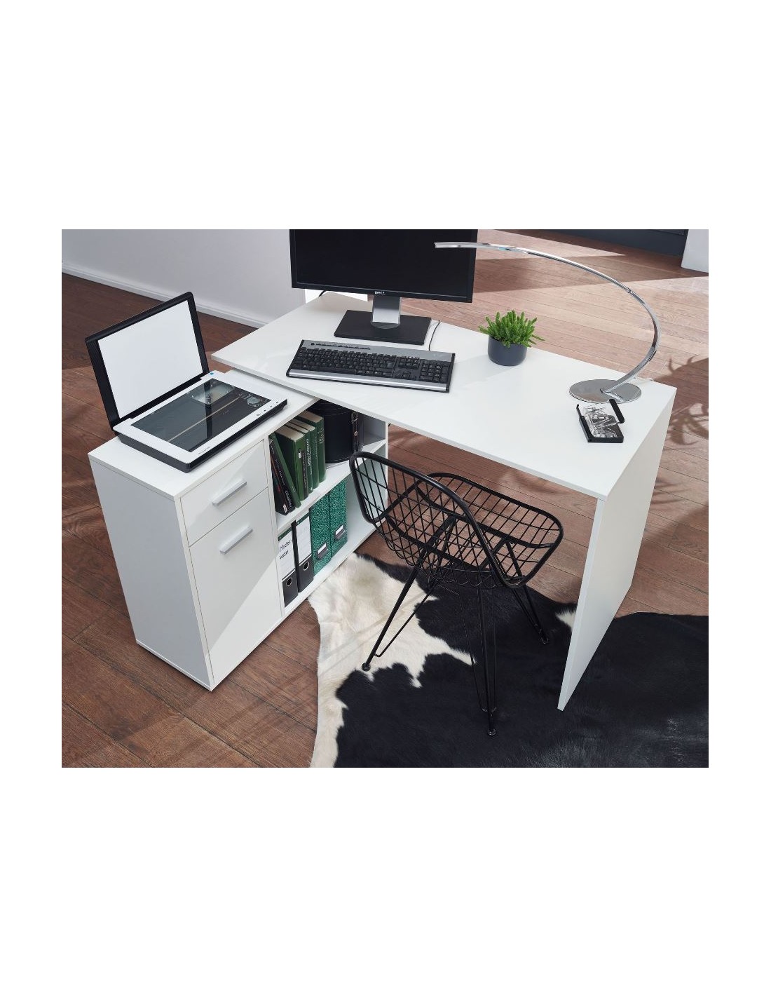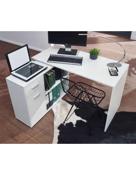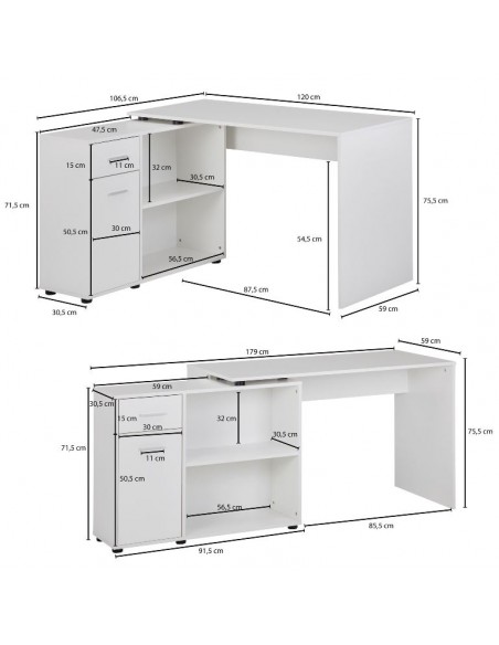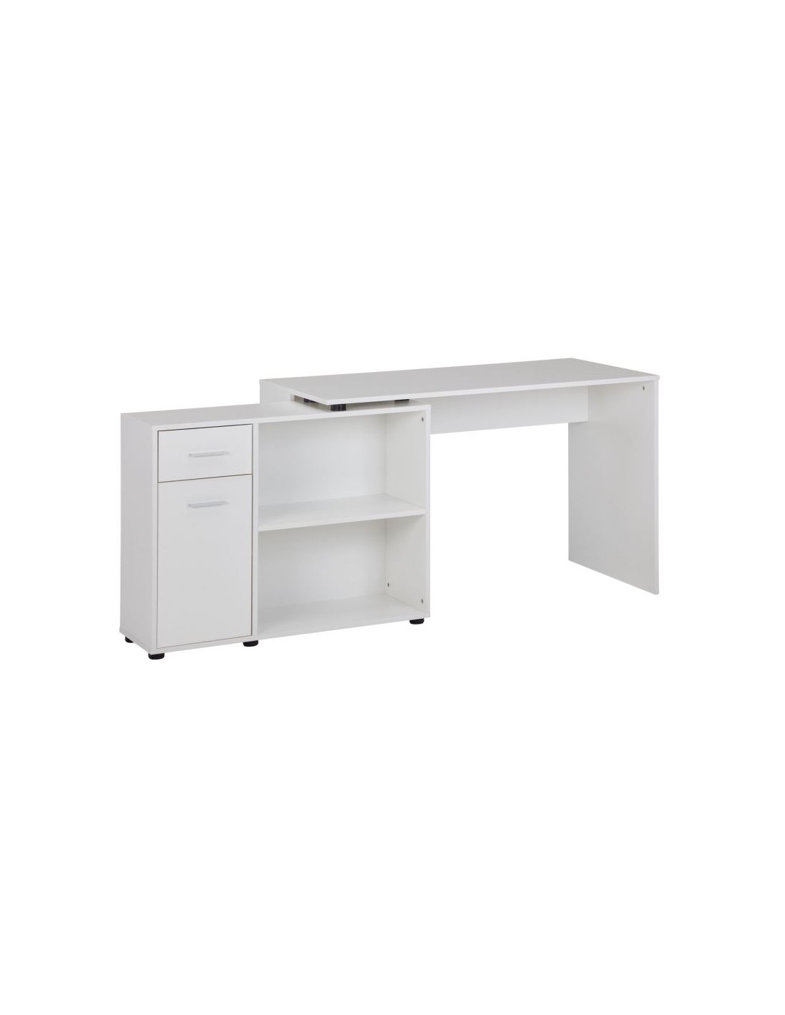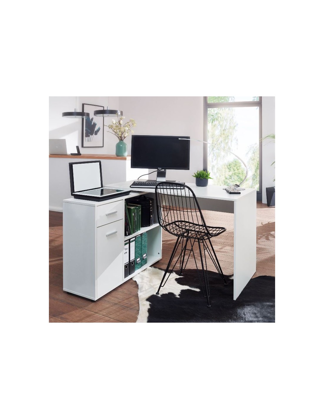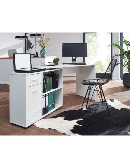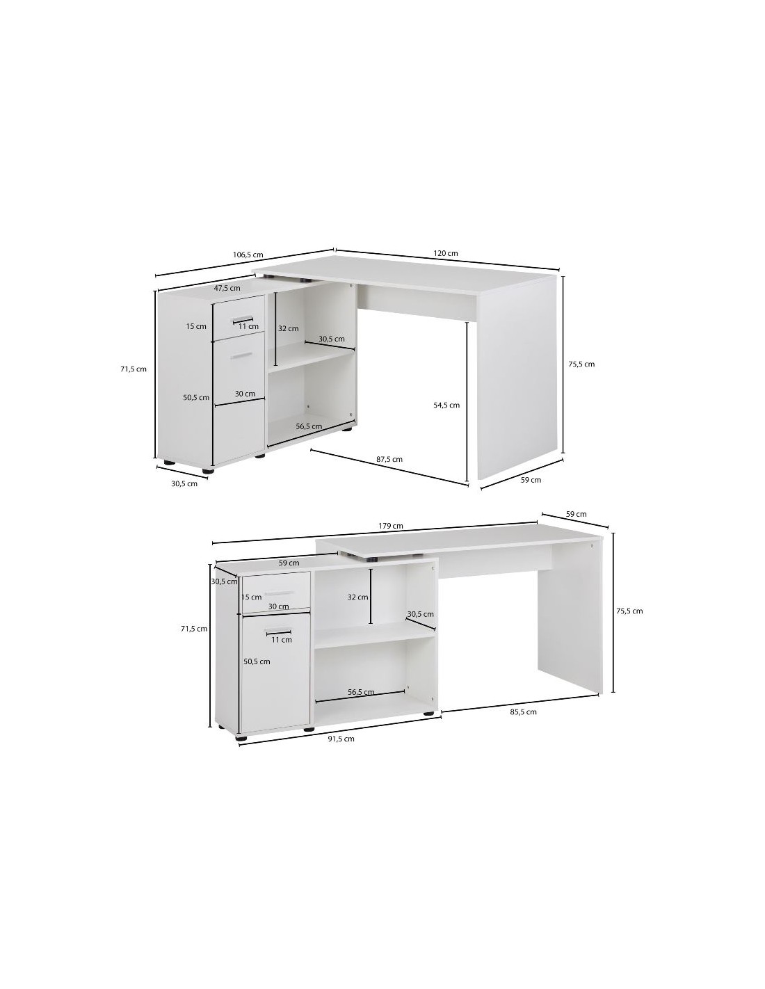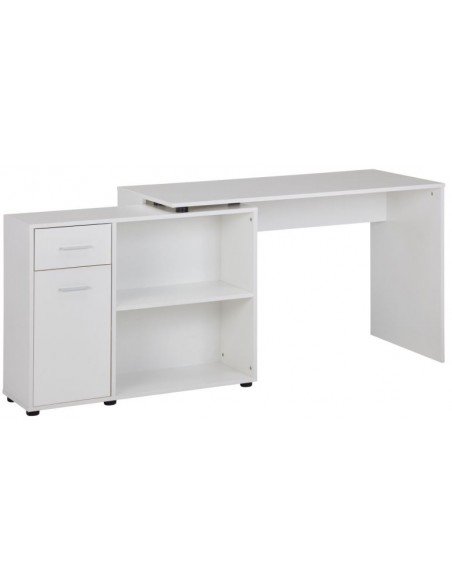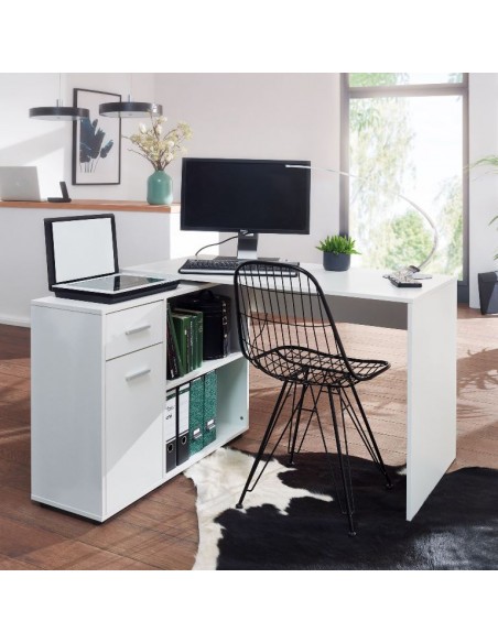 Skrivebord fremstillet i et design af hvid møbelplade. Bordet måler 71,5 - 75,5 cm i højden og 120 x 106,5 cm i bredde og dybde. Skrivebordet kan opstilles i vinkel eller som ret version.