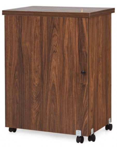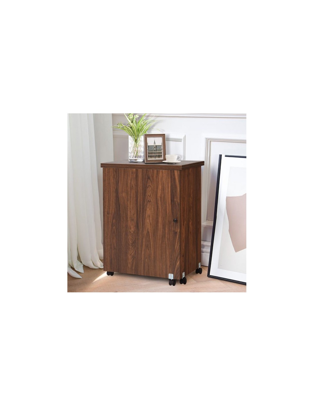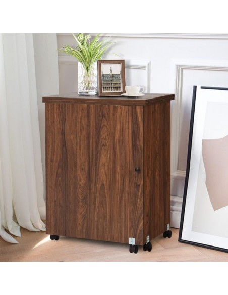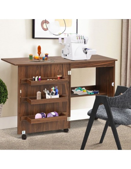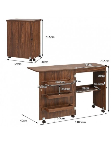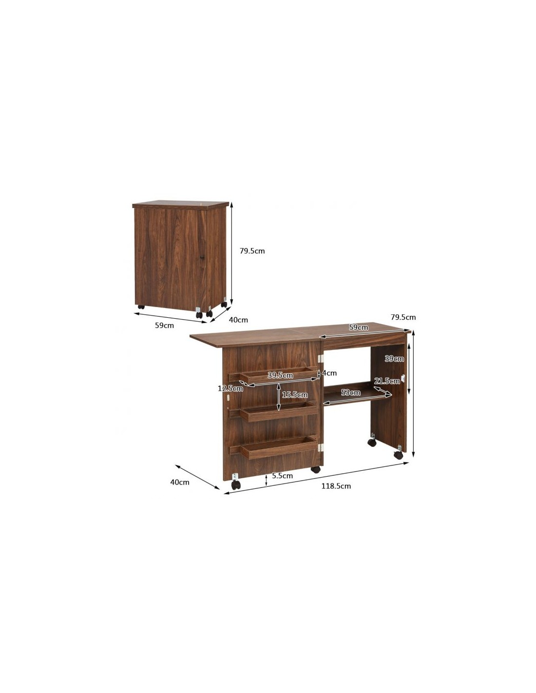 Symaskinebord eller computebord, udført i et design af brun møbelplade. Bordet måler 79,5 cm i højden og 118,5 x 40 cm i bredde og dybde.