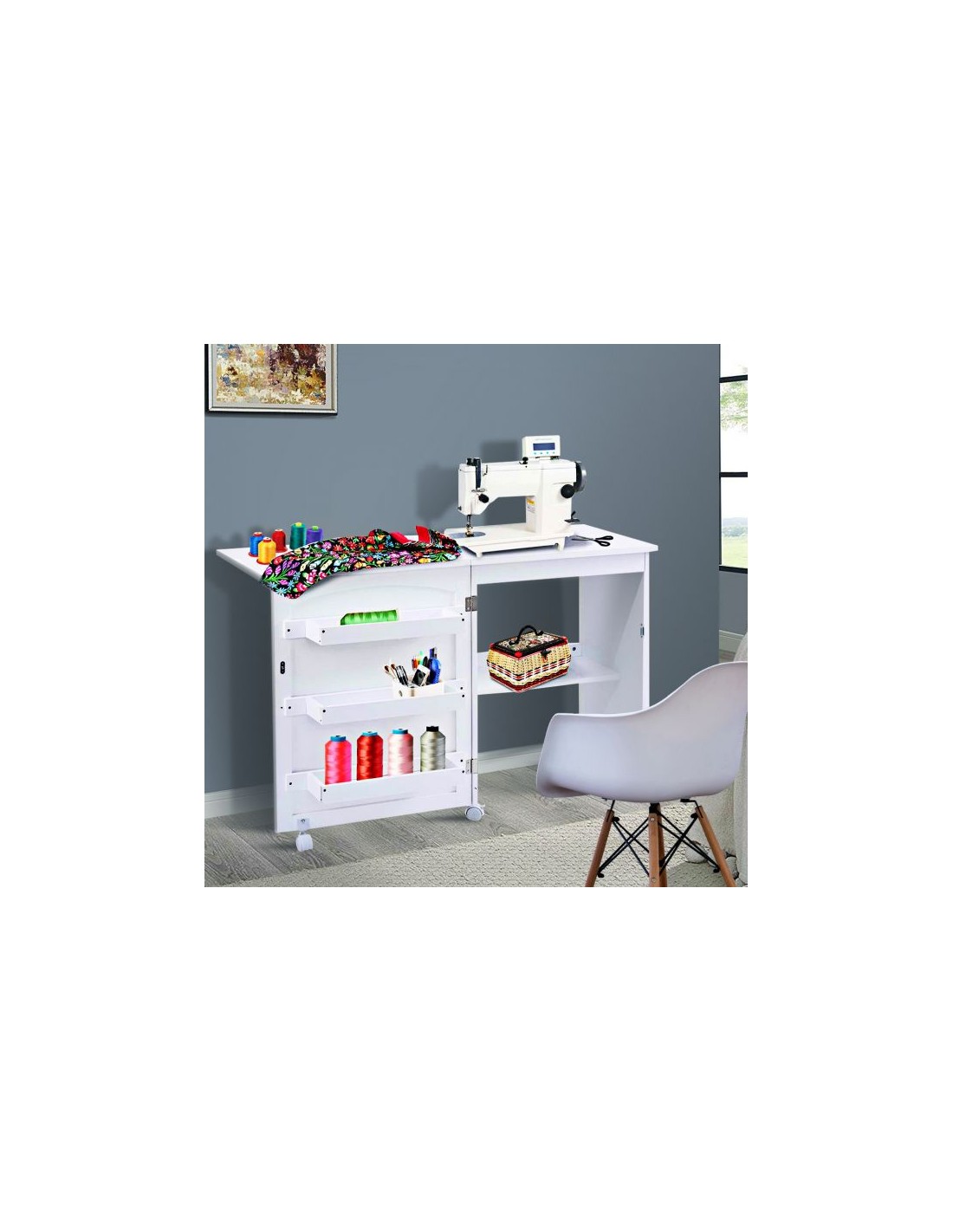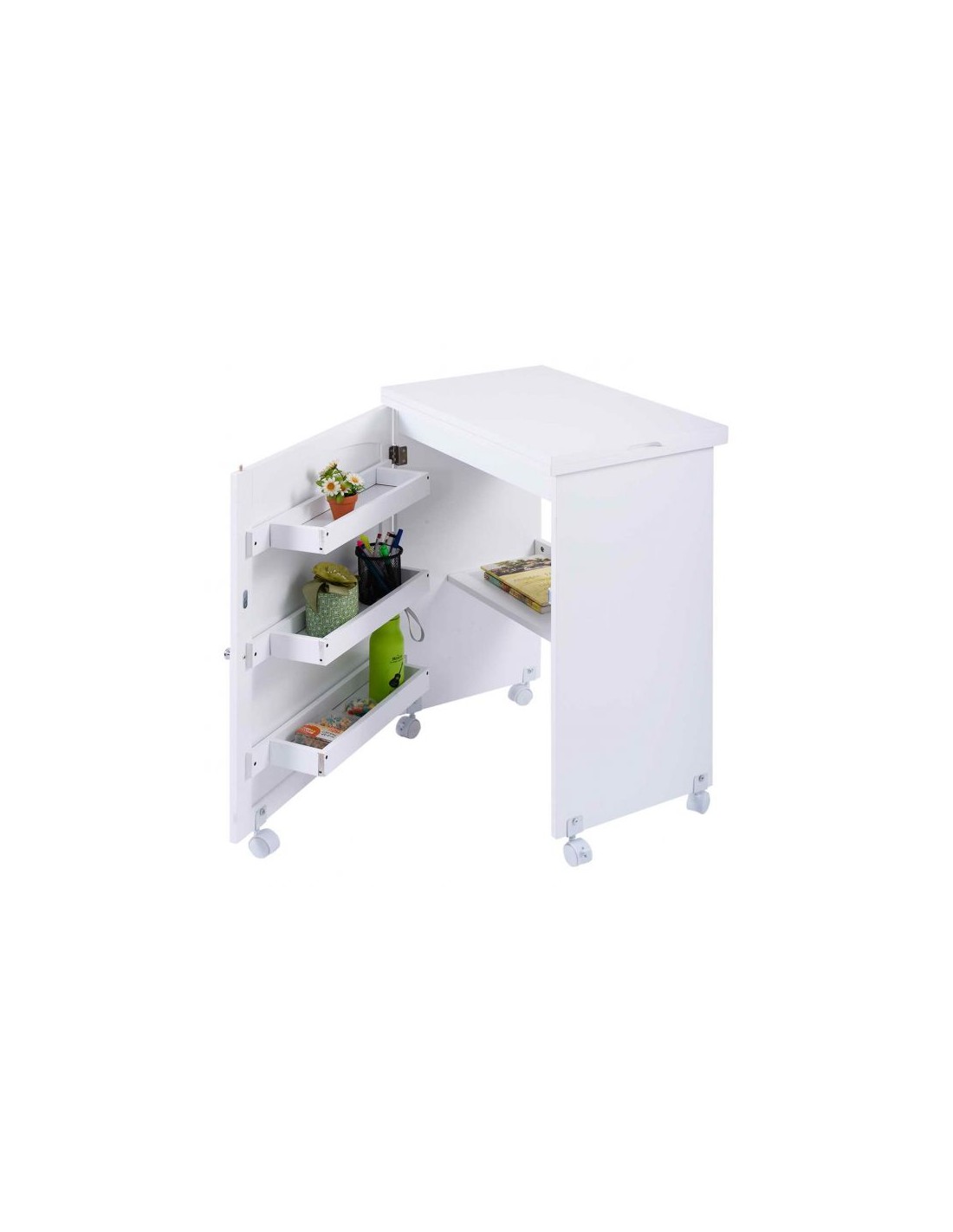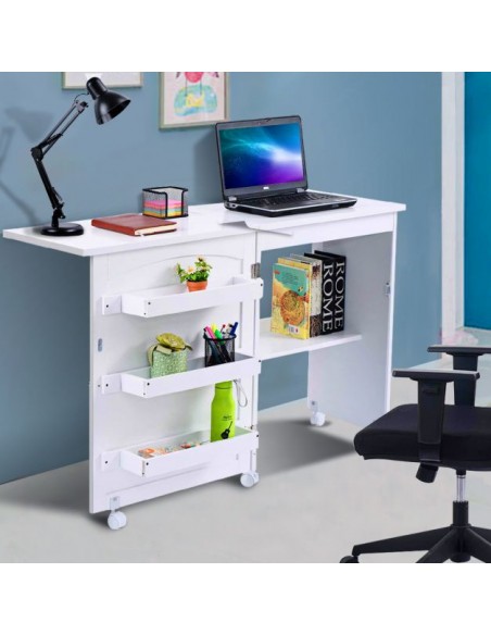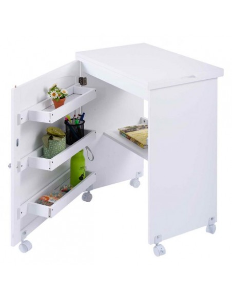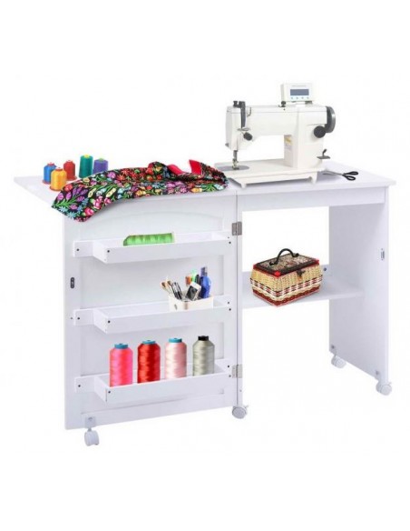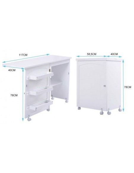 Symaskinebord eller computebord, udført i et design af hvid møbelplade. Bordet måler 79,5 cm i højden og 118,5 x 40 cm i bredde og dybde.