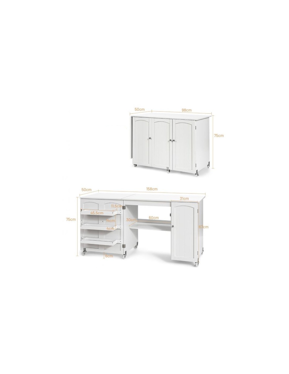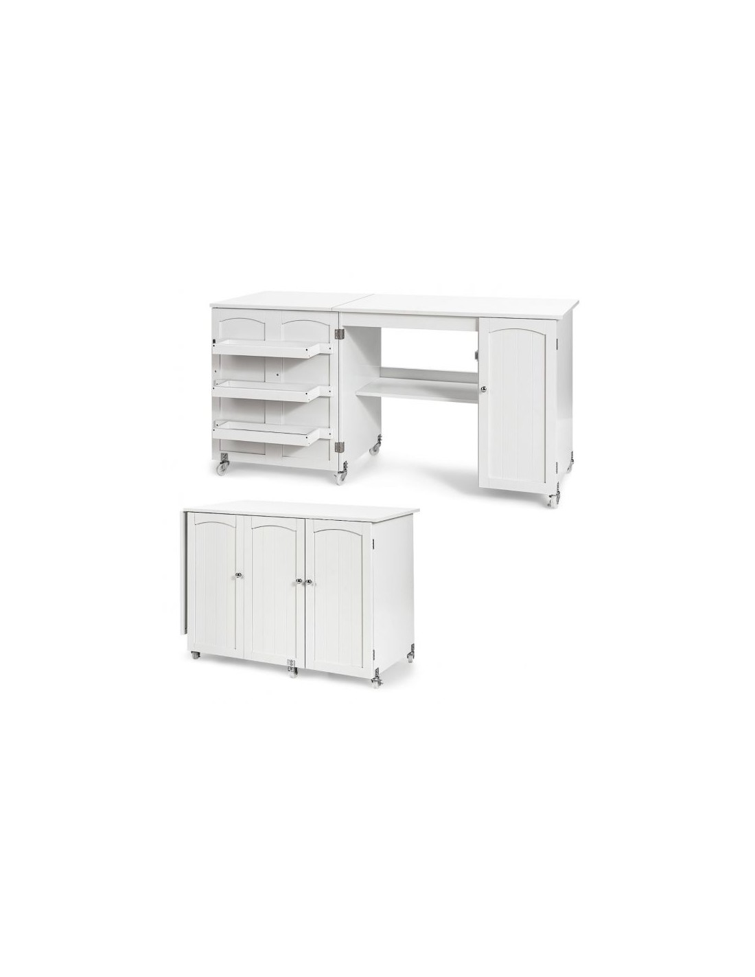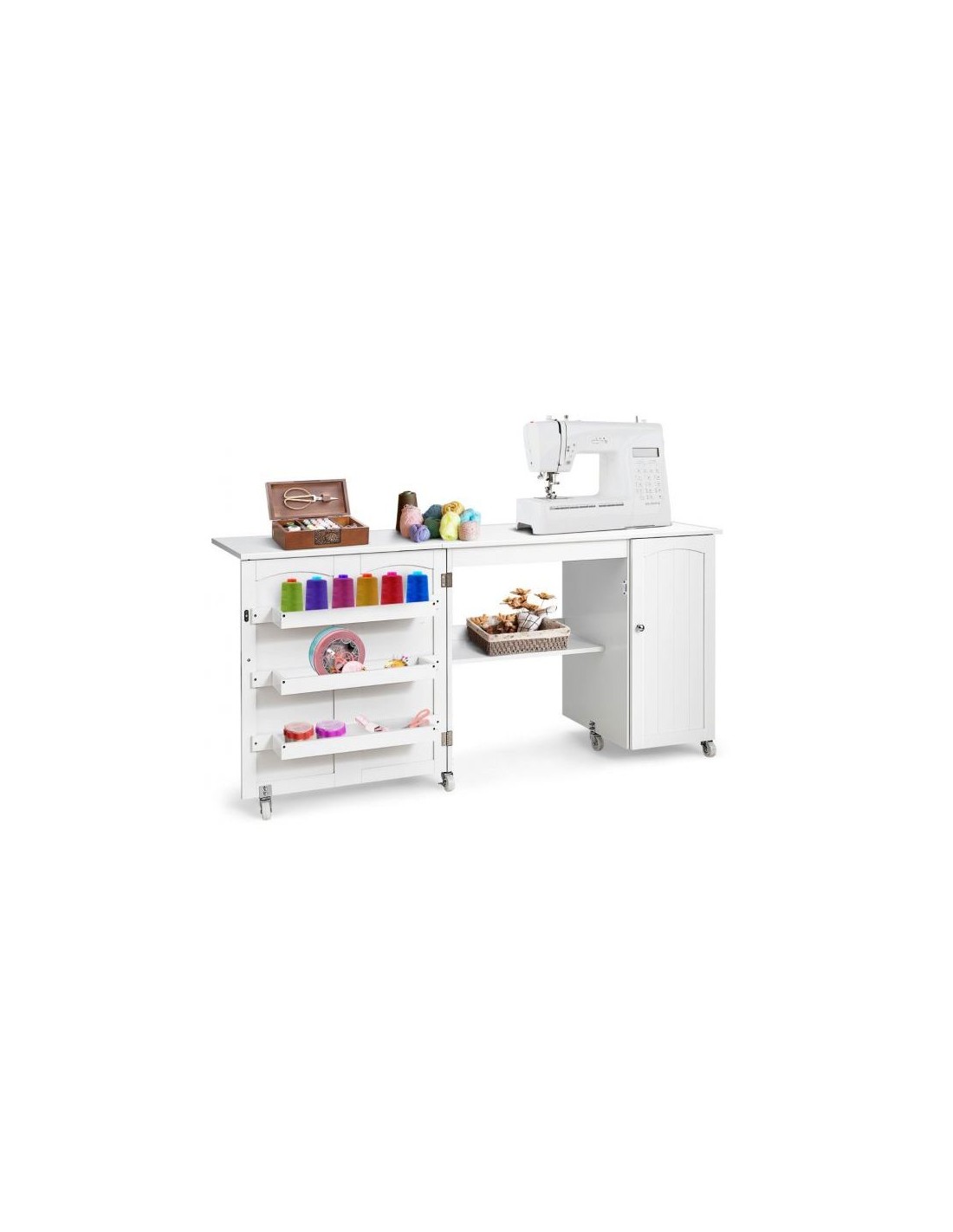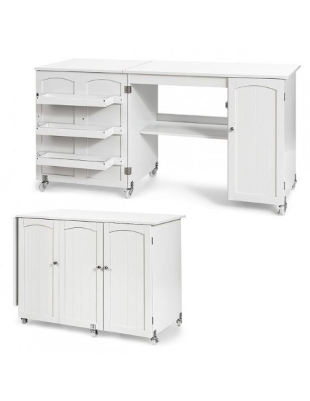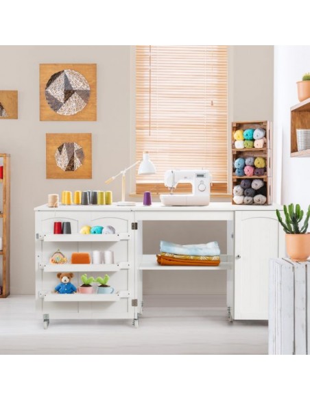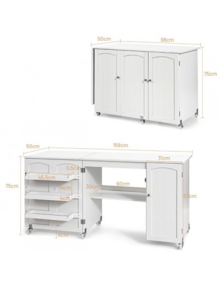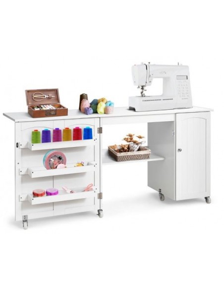 Symaskinebord eller computebord, udført i et design af hvid møbelplade. Bordet måler 75 cm i højden og 98 - 158 x 50 cm i bredde og dybde.