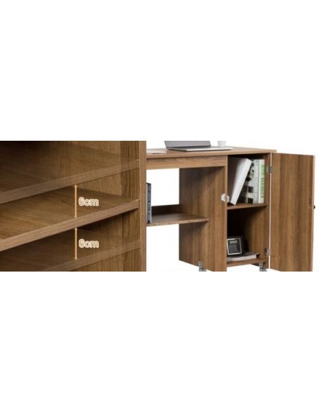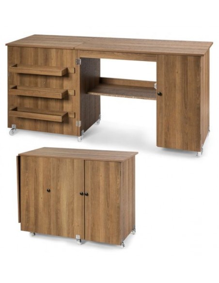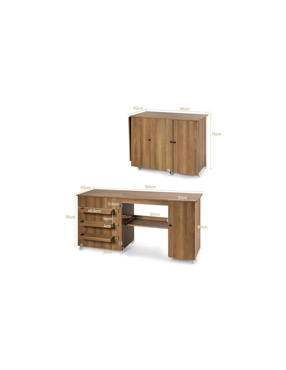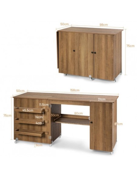 Symaskinebord eller computebord, udført i et design af brun møbelplade. Bordet måler 75 cm i højden og 98 - 158 x 50 cm i bredde og dybde.