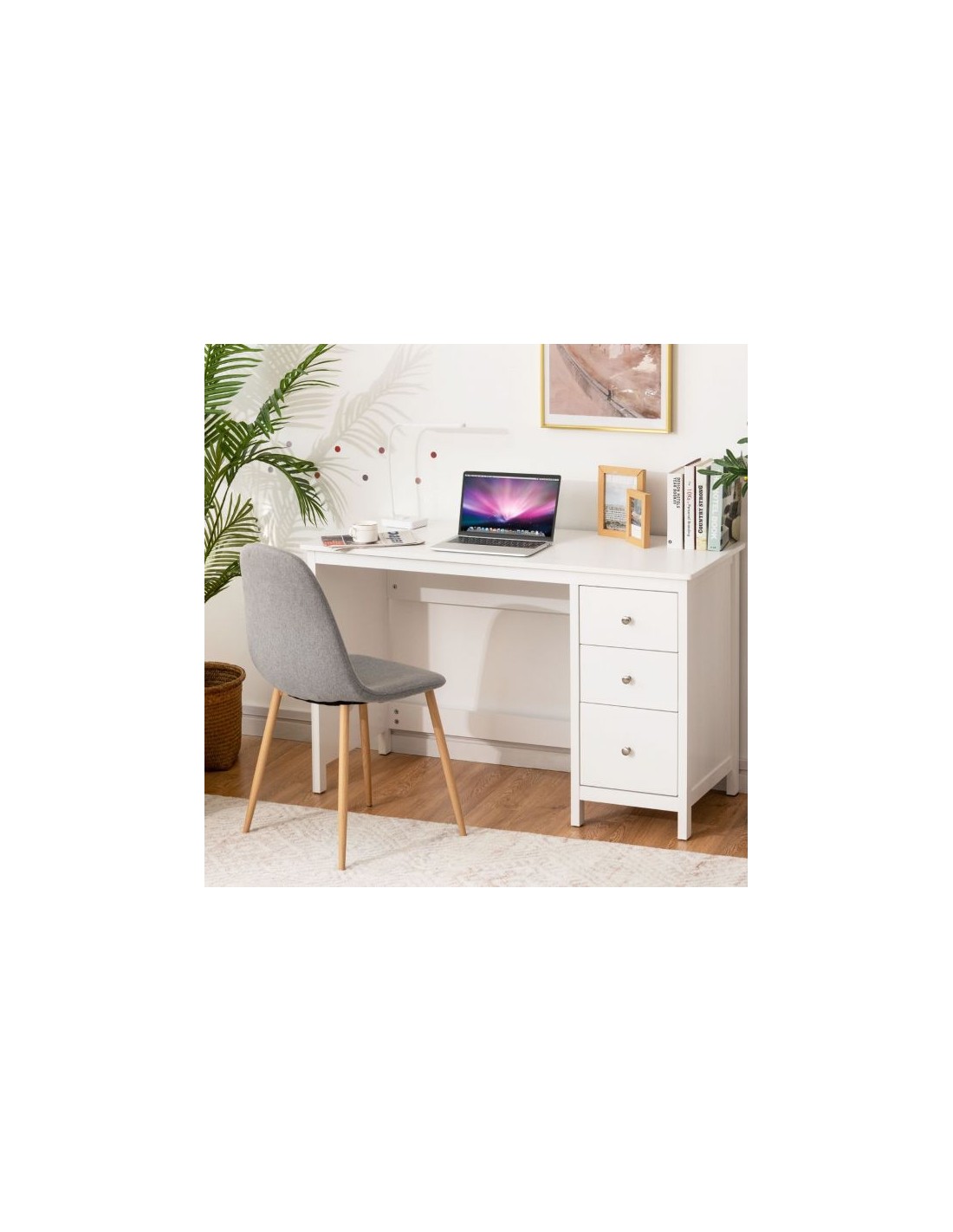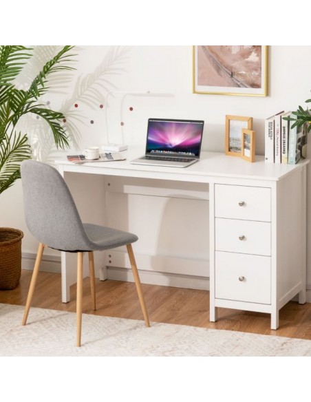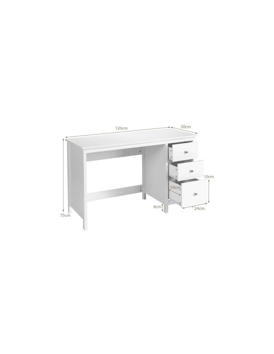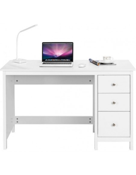 Skrivebord udført i et design af hvid mdf. Bordet måler 75 cm i højden og 120 x 50 cm i bredde og dybde.