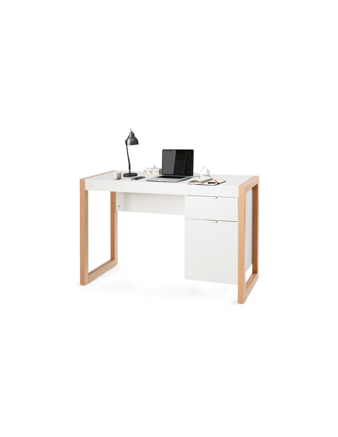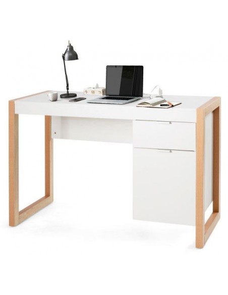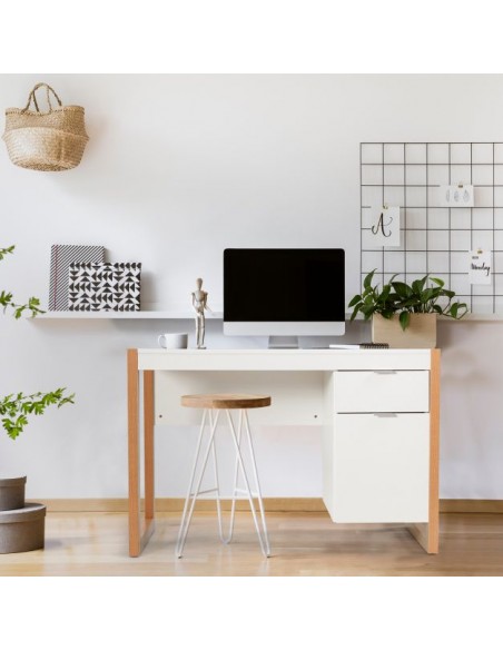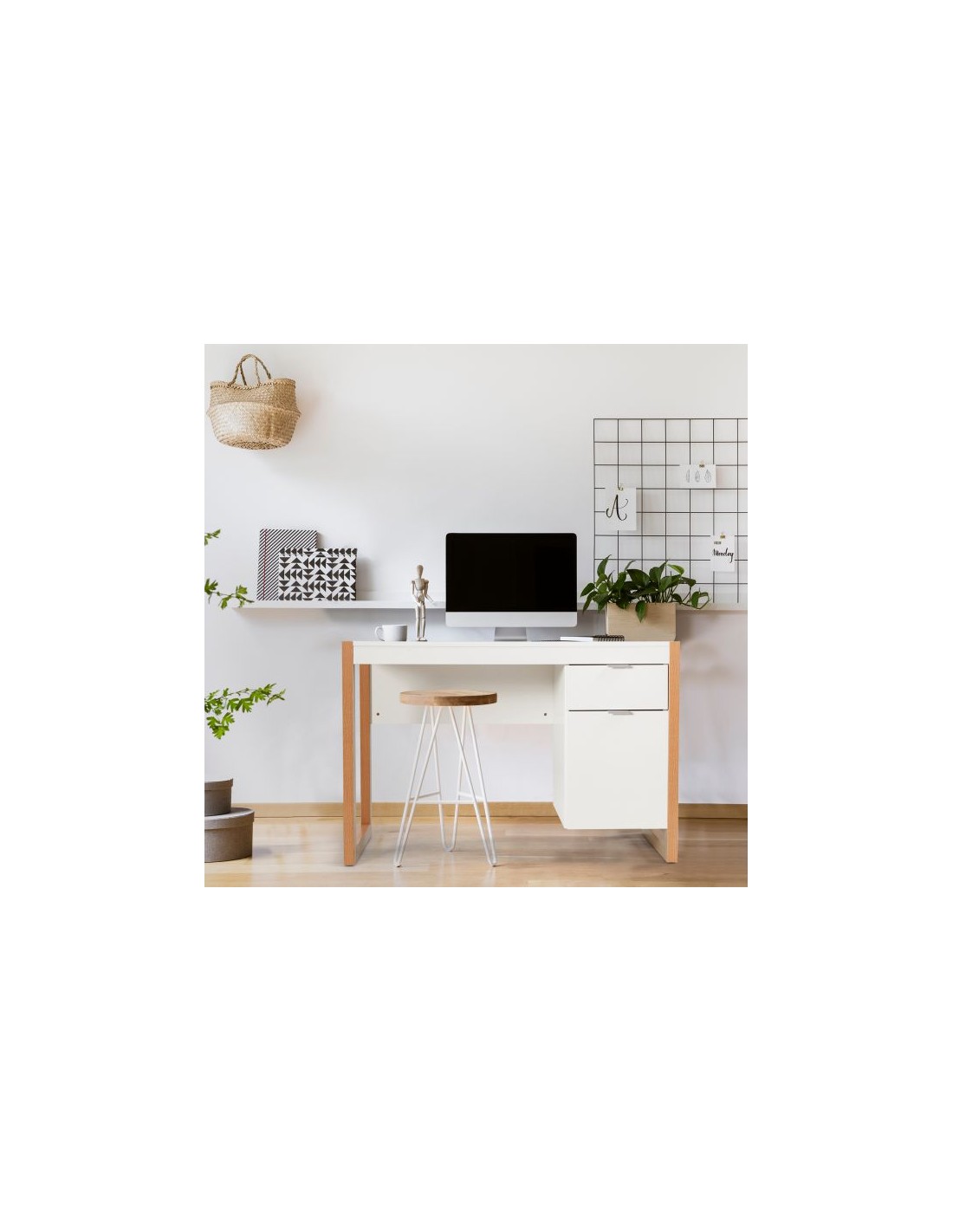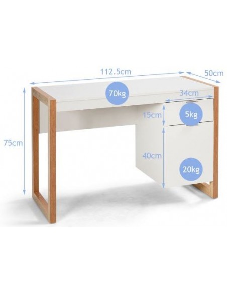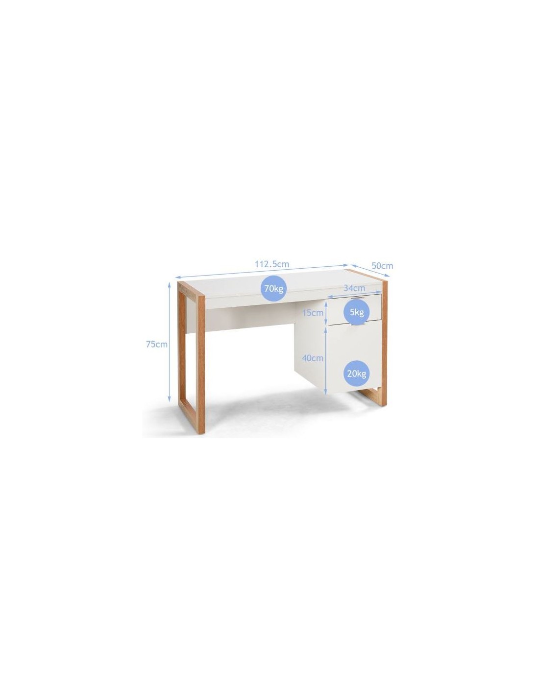 Skrivebord udført i et design af hvid og naturfarvet træ og mdf. Bordet måler 75 cm i højden og 112,5 x 50 cm i bredde og dybde.