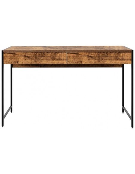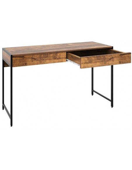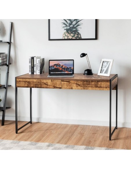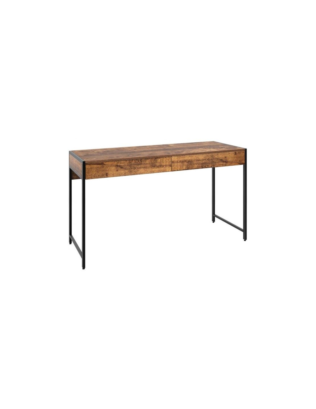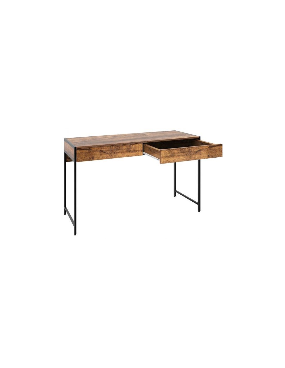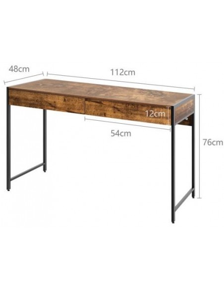 Skrivebord udført i et design af sortlakeret metal og brun møbelplade. Bordet måler 76 cm i højden og 112 x 48 cm i bredde og dybde.