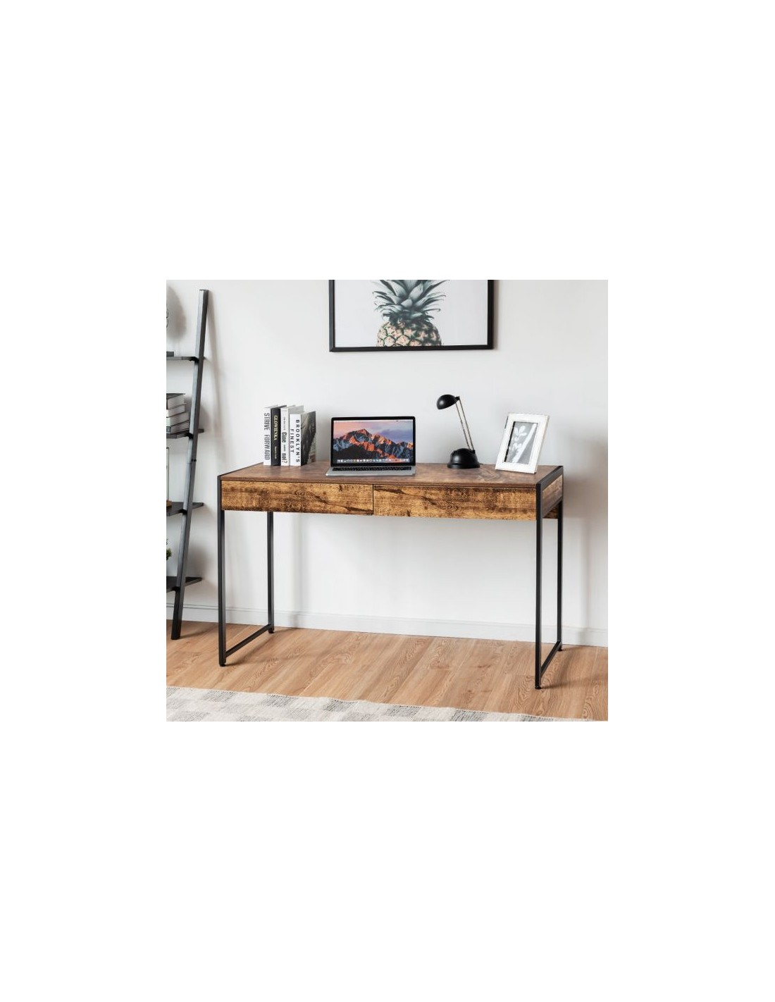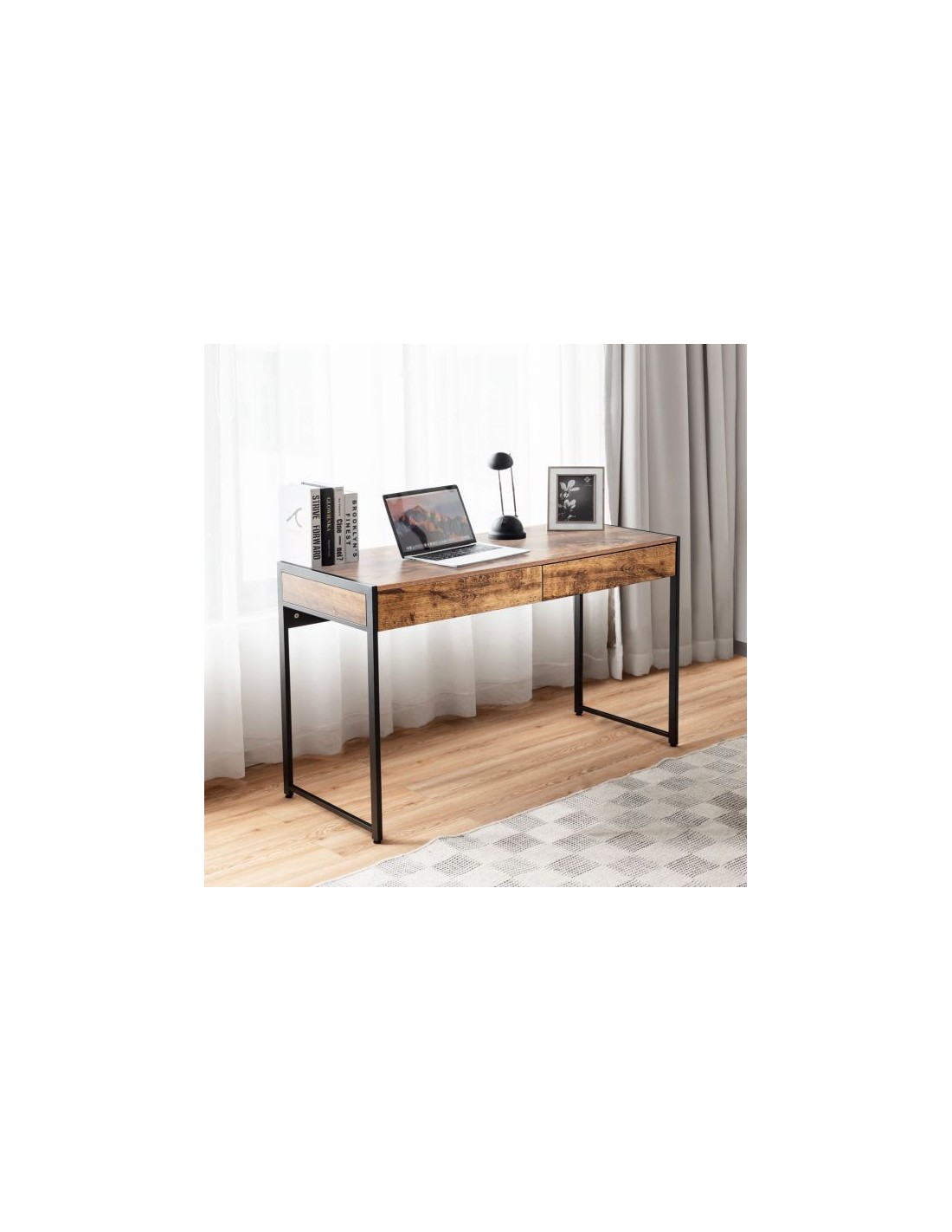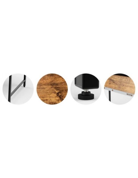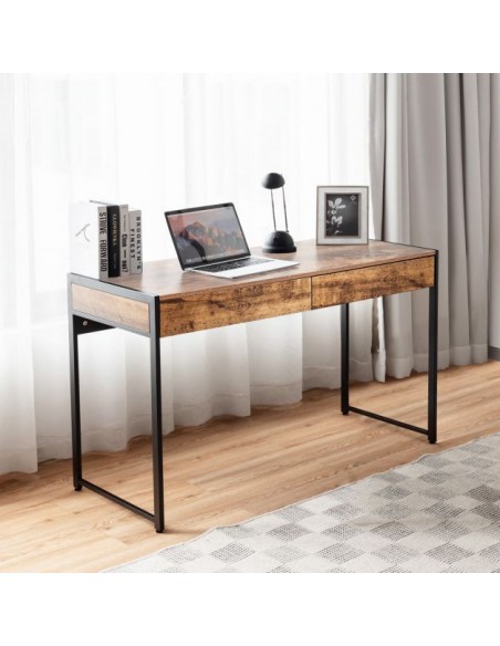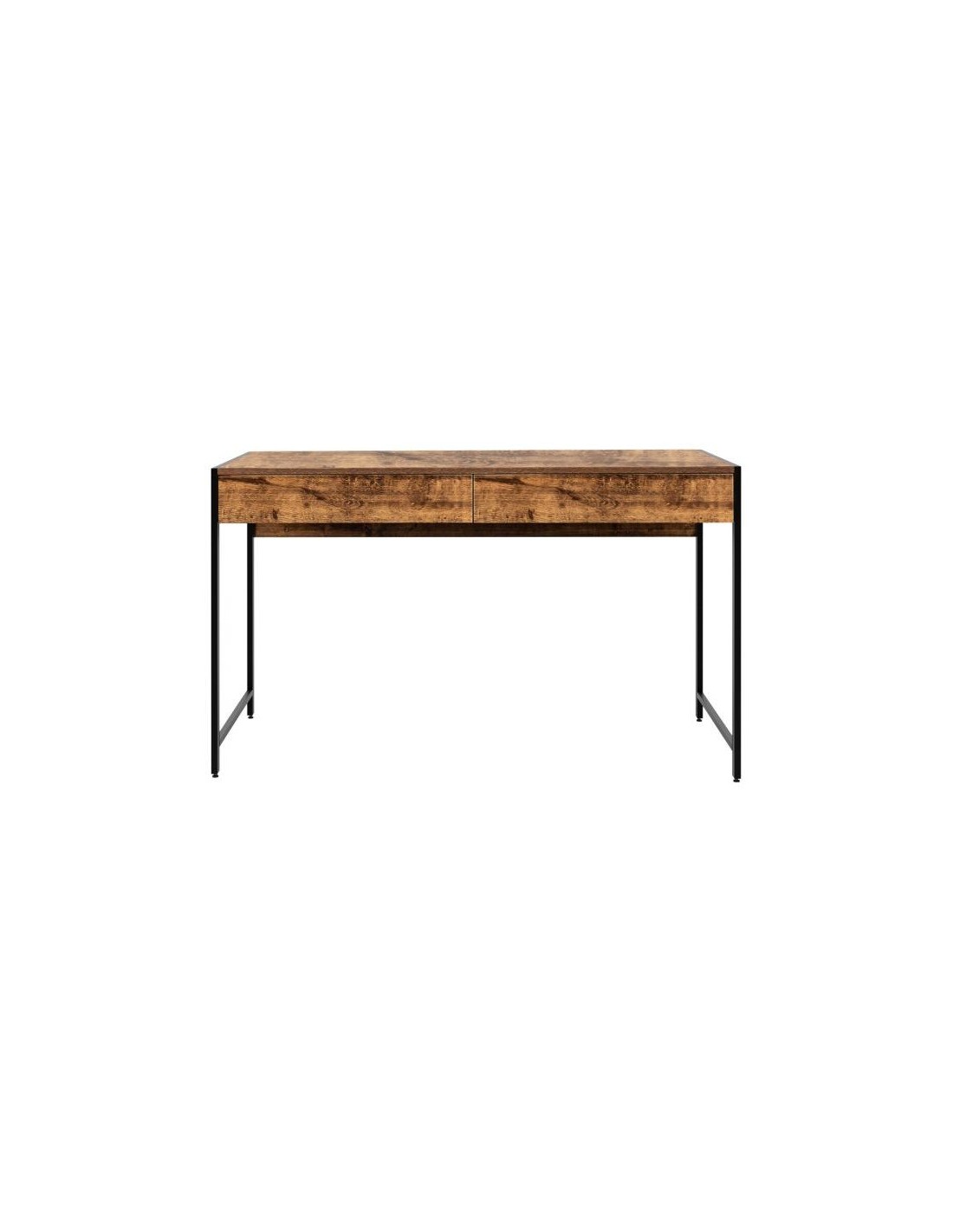 Skrivebord udført i et design af sortlakeret metal og brun møbelplade. Bordet måler 76 cm i højden og 112 x 48 cm i bredde og dybde.