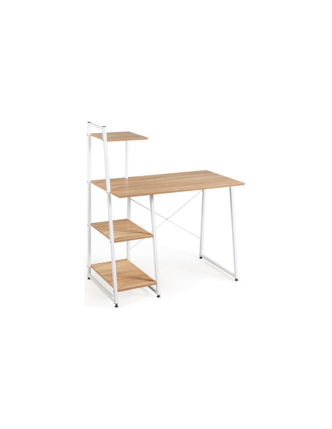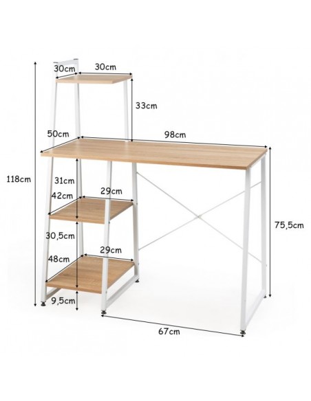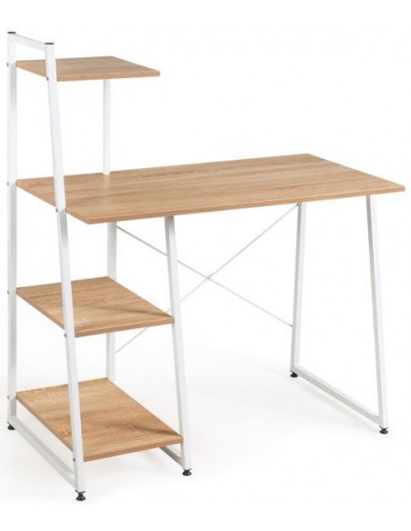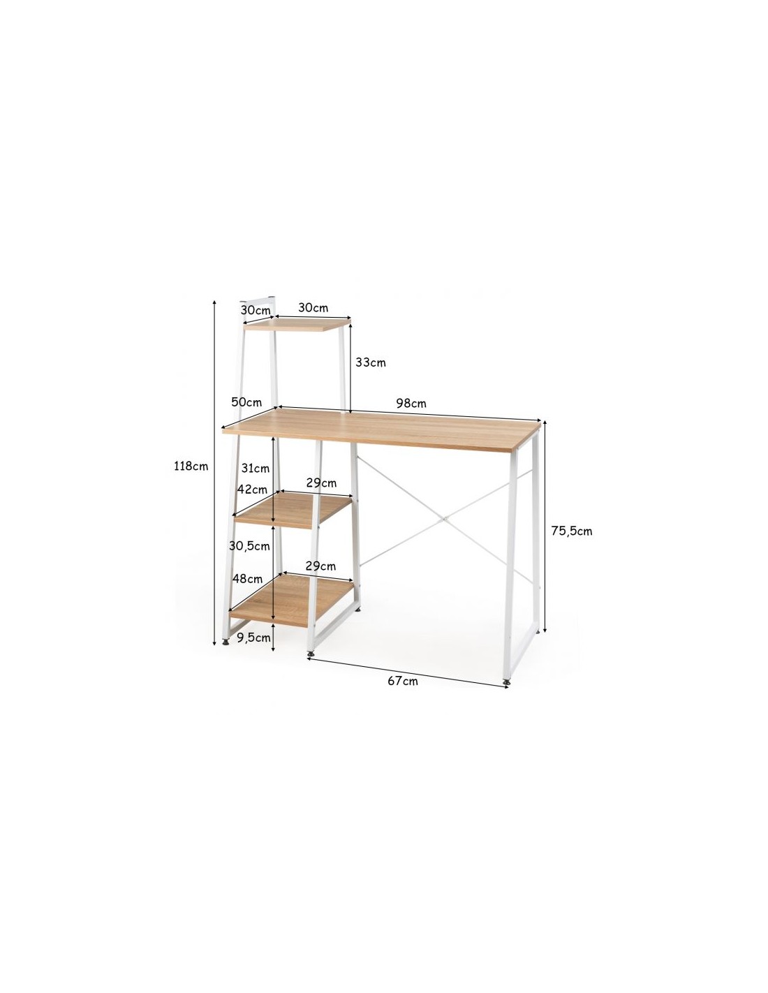 Skrivebord udført i et design af hvidlakeret metal og naturfarvet møbelplade. Bordet måler 75,5 - 118 cm i højden og 98 x 48 cm i bredde og dybde.