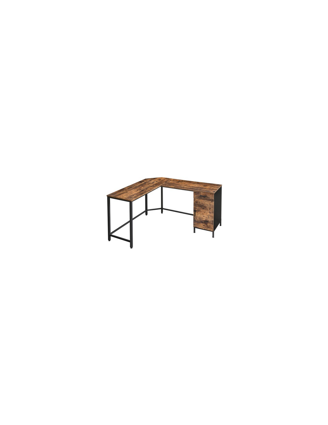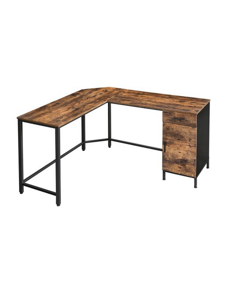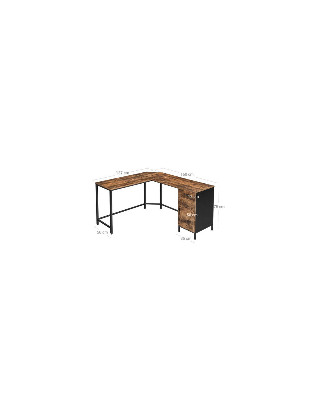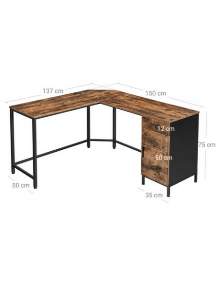 Hjørneskrivebord udført i et design af sortlakeret metal og brun møbelplade. Bordet måler 75 cm i højden og 137 x 150 cm i bredde og dybde. Bordplade dybden er 50 cm.