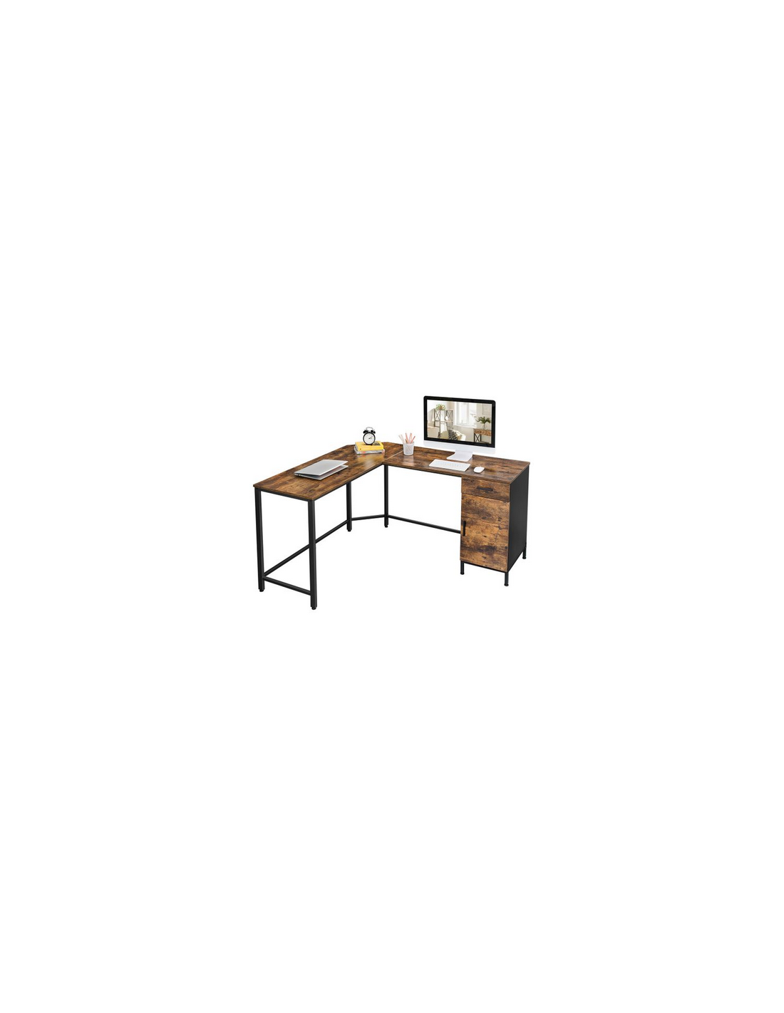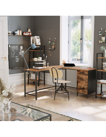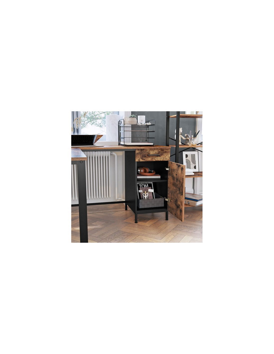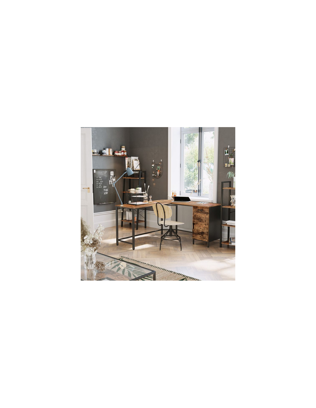 Hjørneskrivebord udført i et design af sortlakeret metal og brun møbelplade. Bordet måler 75 cm i højden og 137 x 150 cm i bredde og dybde. Bordplade dybden er 50 cm.