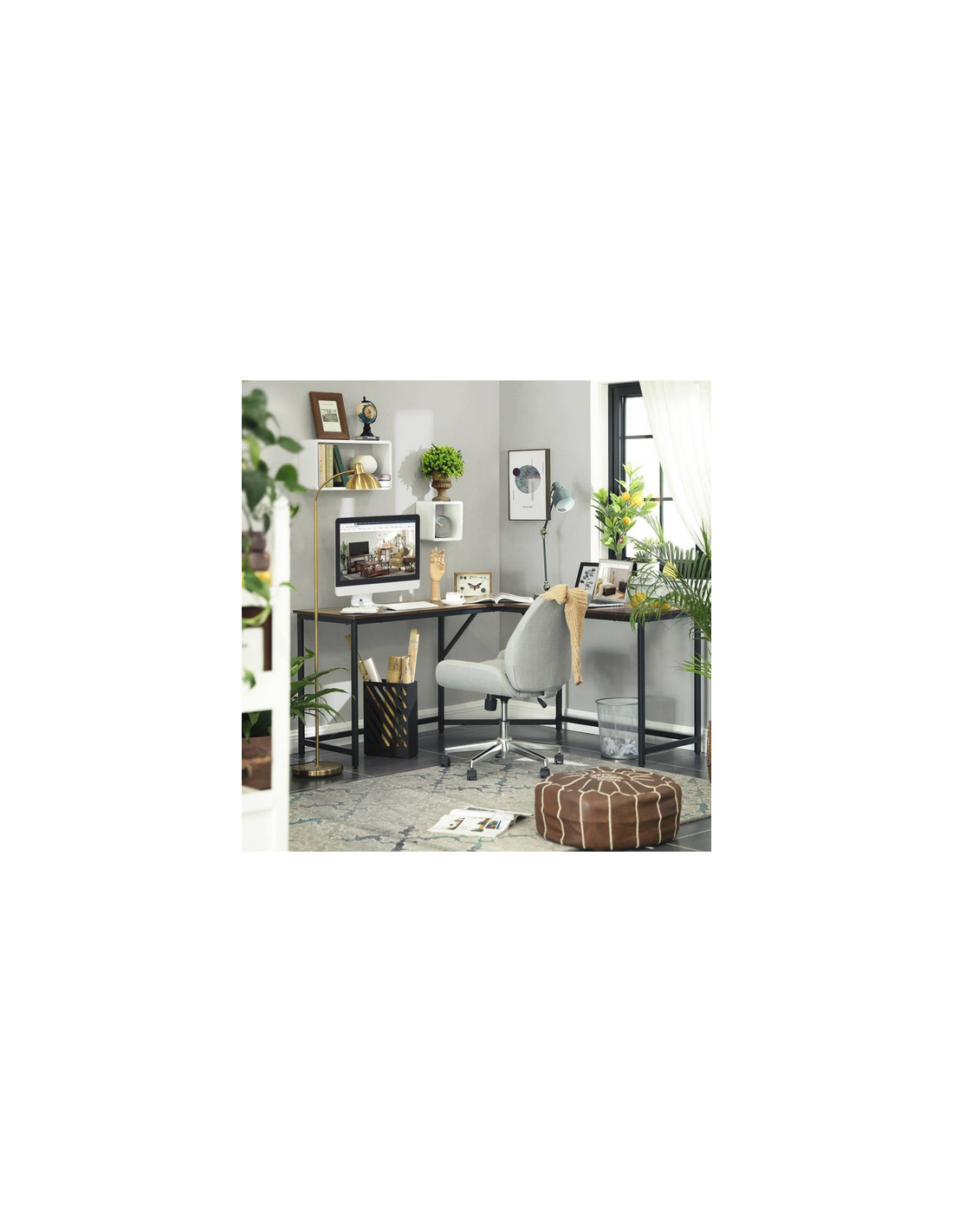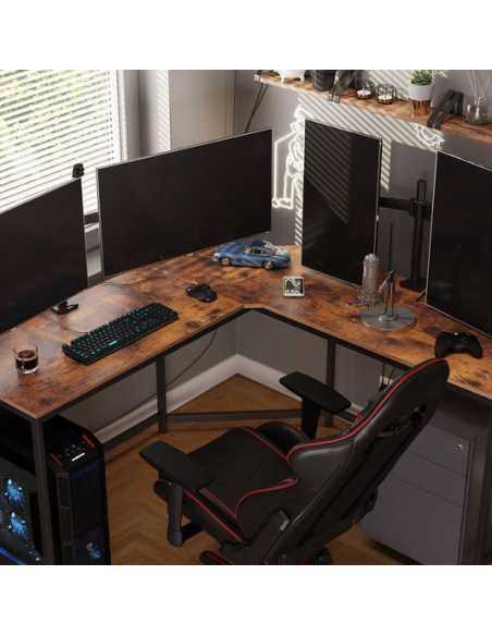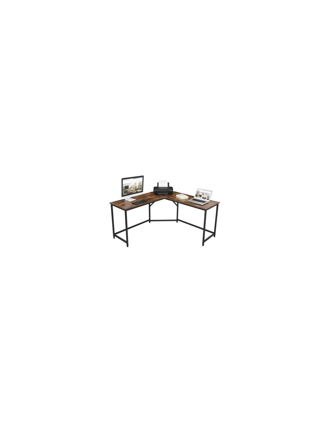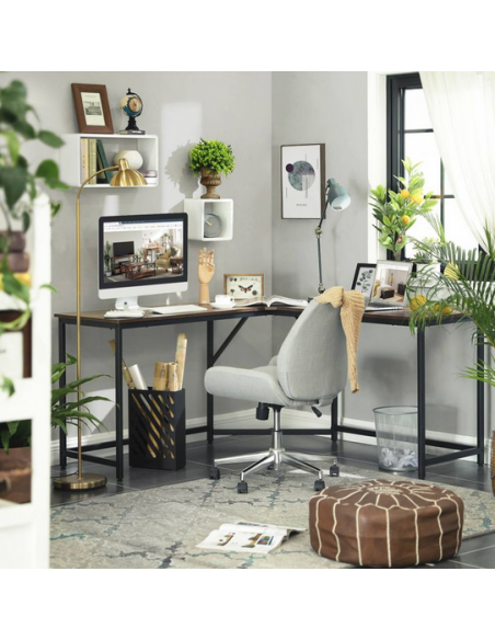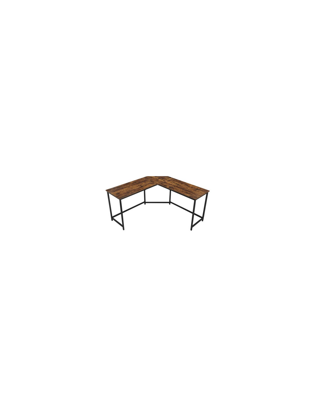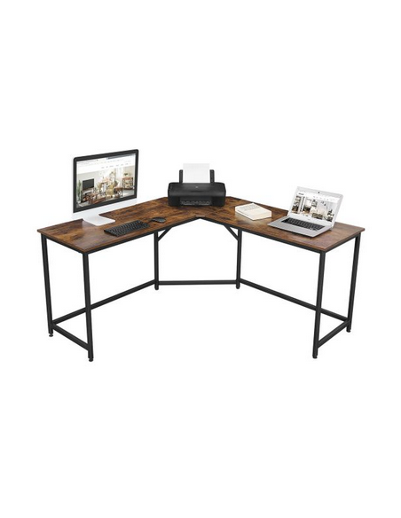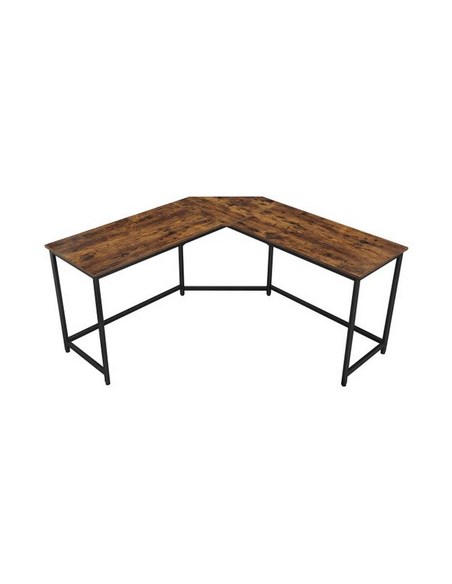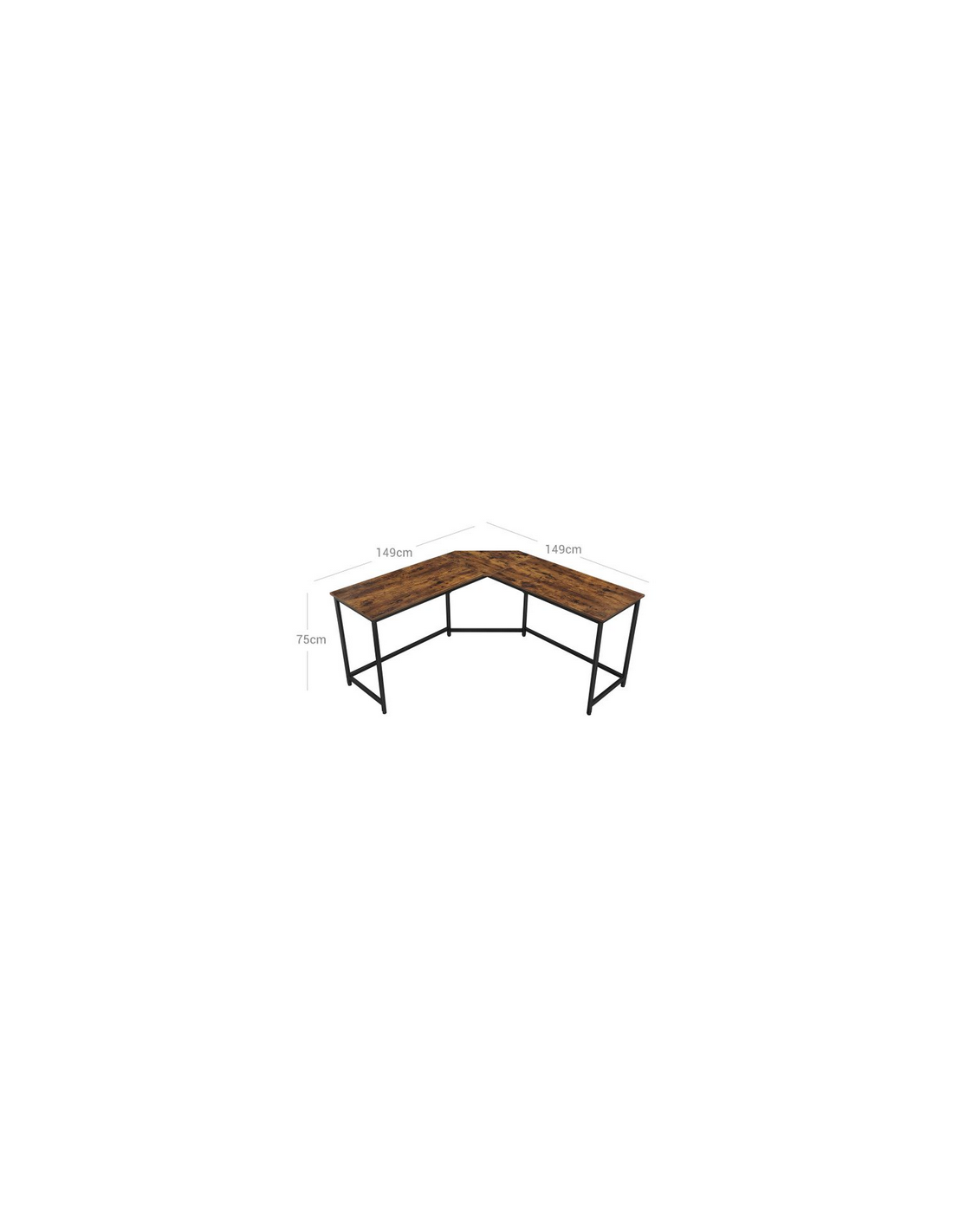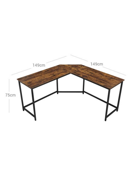 Hjørneskrivebord udført i et design af sortlakeret metal og brun møbelplade. Bordet måler 75 cm i højden og 149 x 149 cm i bredde og dybde. Bordplade dybden er 48 cm.