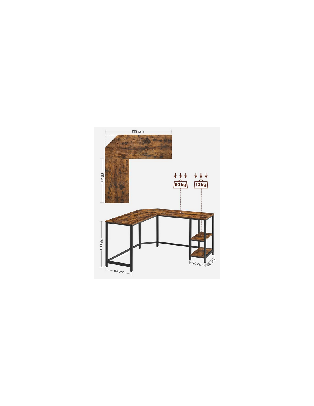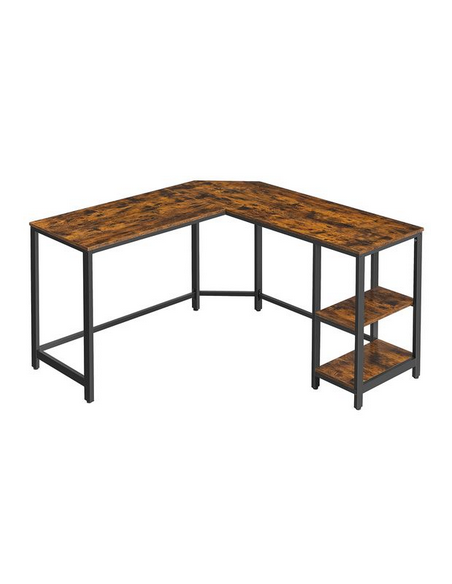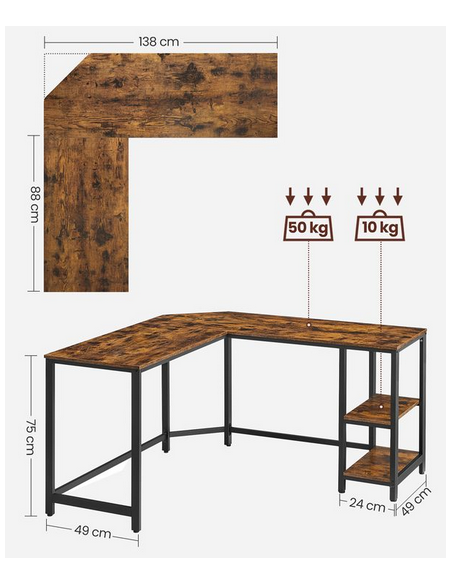 Hjørneskrivebord udført i et design af sortlakeret metal og brun møbelplade. Bordet måler 75 cm i højden og 138 x 138 cm i bredde og dybde. Bordplade dybden er 49 cm.