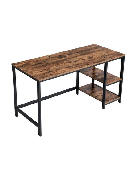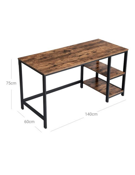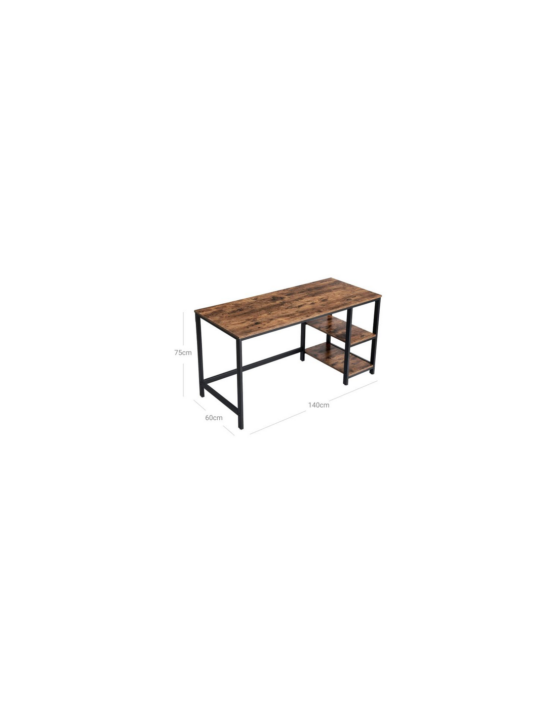 Skrivebord udført i et design af sortlakeret metal og brun møbelplade. Bordet måler 75 cm i højden og 140 x 60 cm i bredde og dybde.