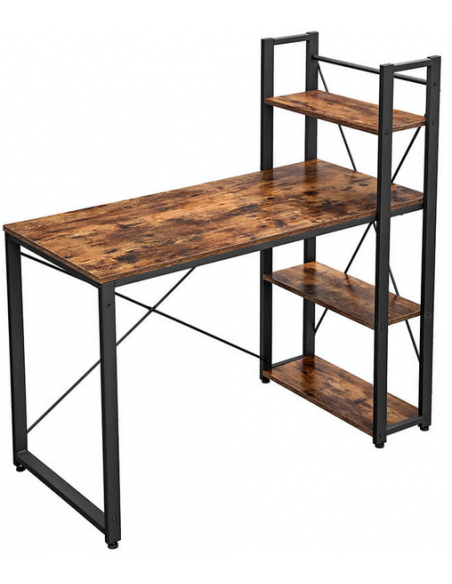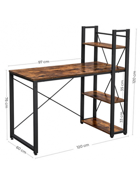 Skrivebord udført i et design af sortlakeret metal og brun møbelplade. Bordet måler 75 - 120 cm i højden og 120 x 60 cm i bredde og dybde.