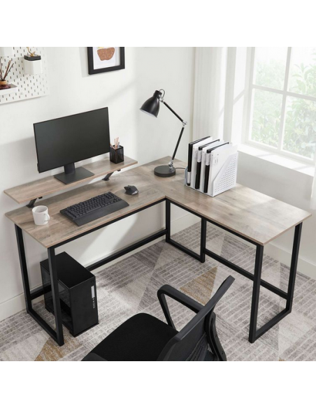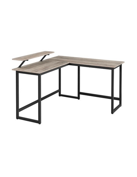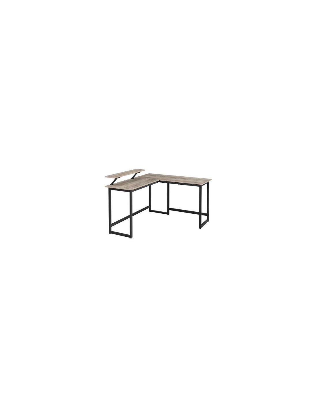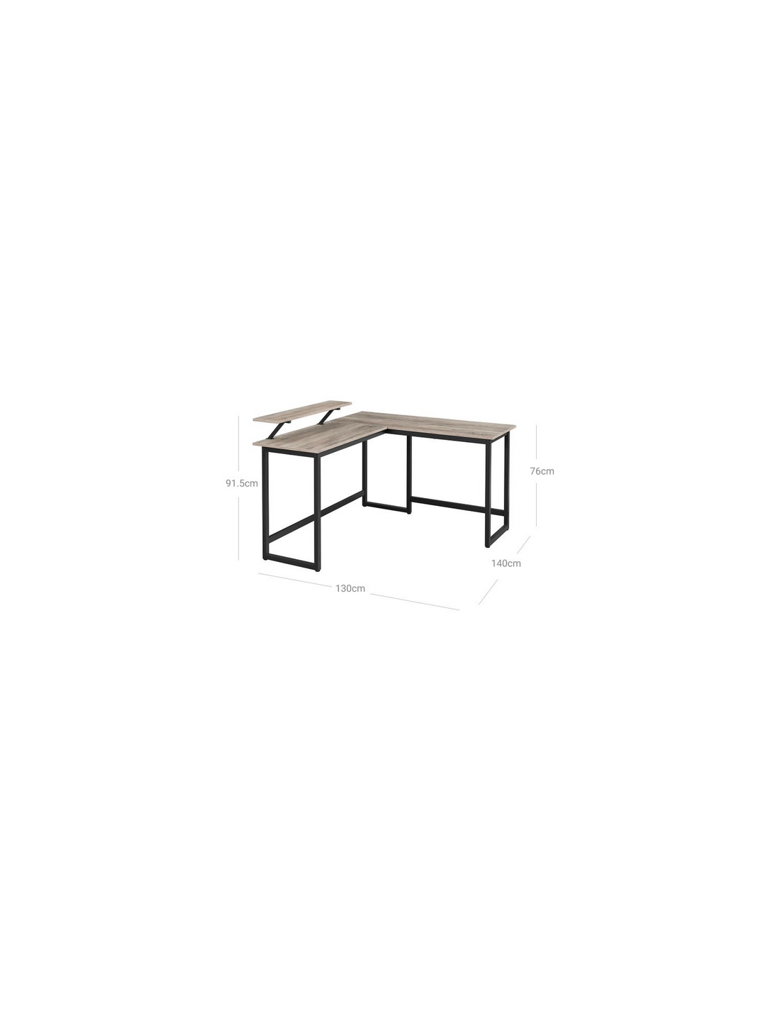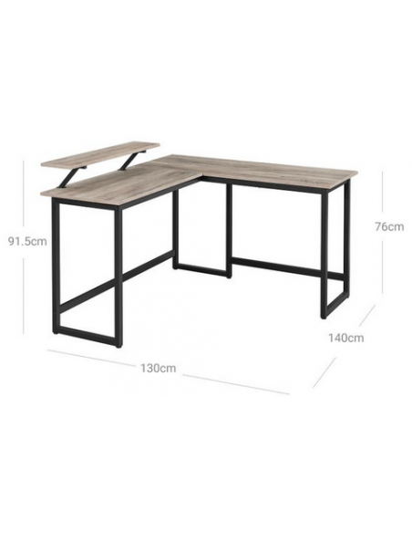Hjørneskrivebord udført i et design af sortlakeret metal og grå møbelplade. Bordet måler 76 cm i højden og 140 x 130 cm i bredde og dybde. Bordplade dybden er 50 cm.