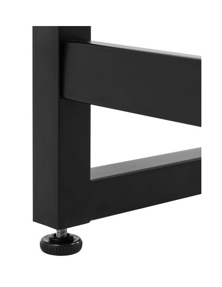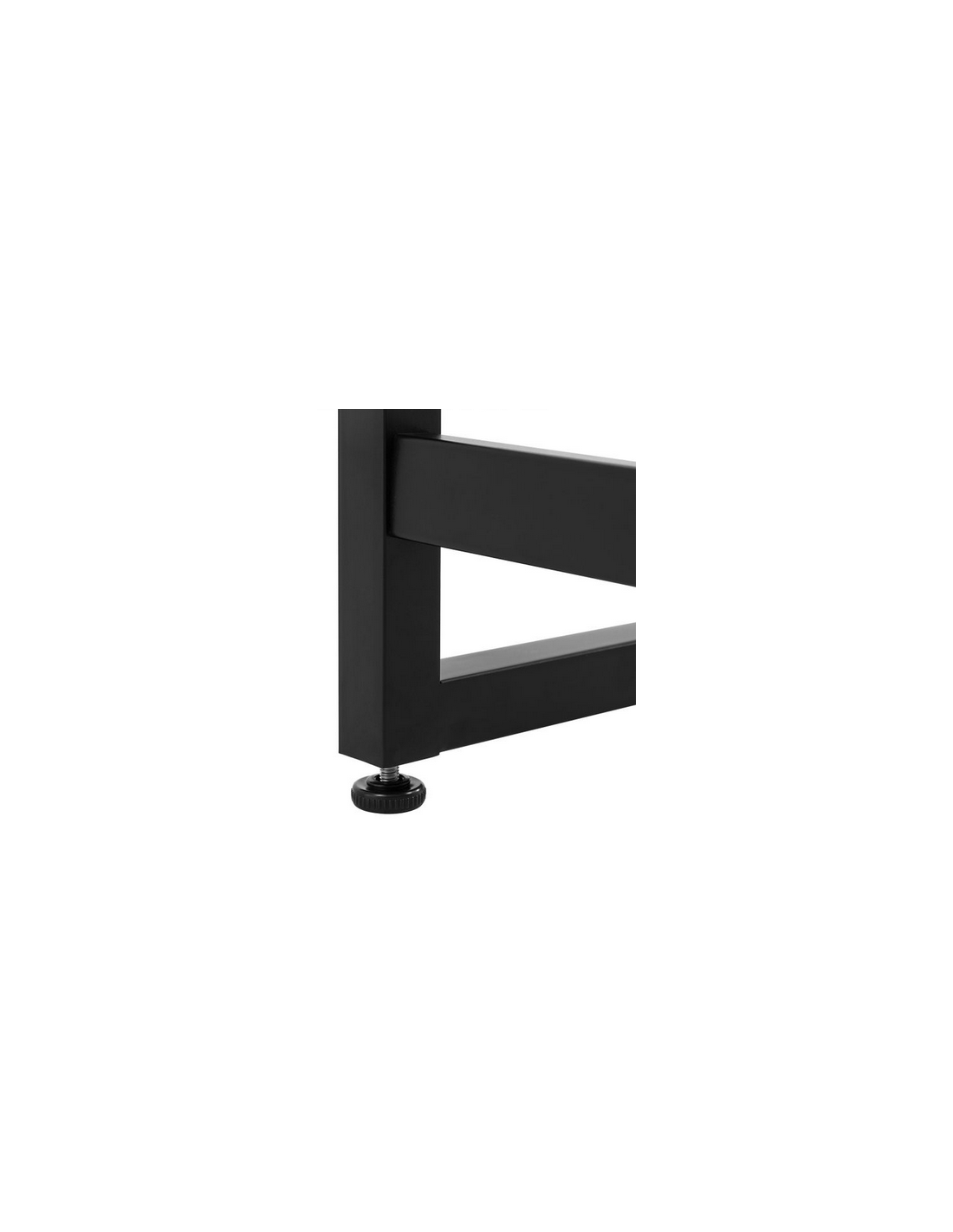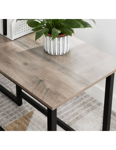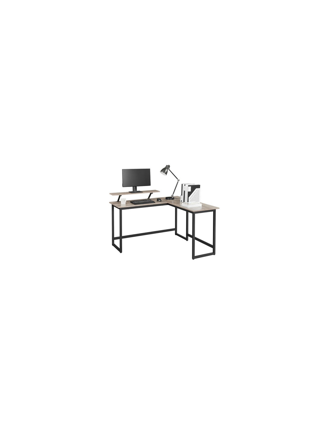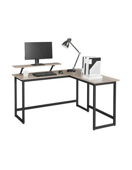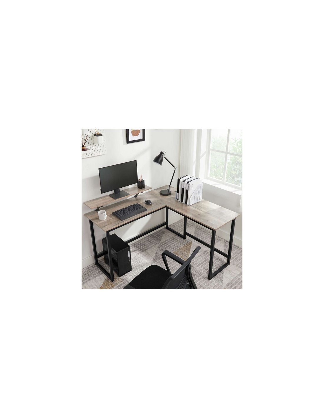 Hjørneskrivebord udført i et design af sortlakeret metal og grå møbelplade. Bordet måler 76 cm i højden og 140 x 130 cm i bredde og dybde. Bordplade dybden er 50 cm.