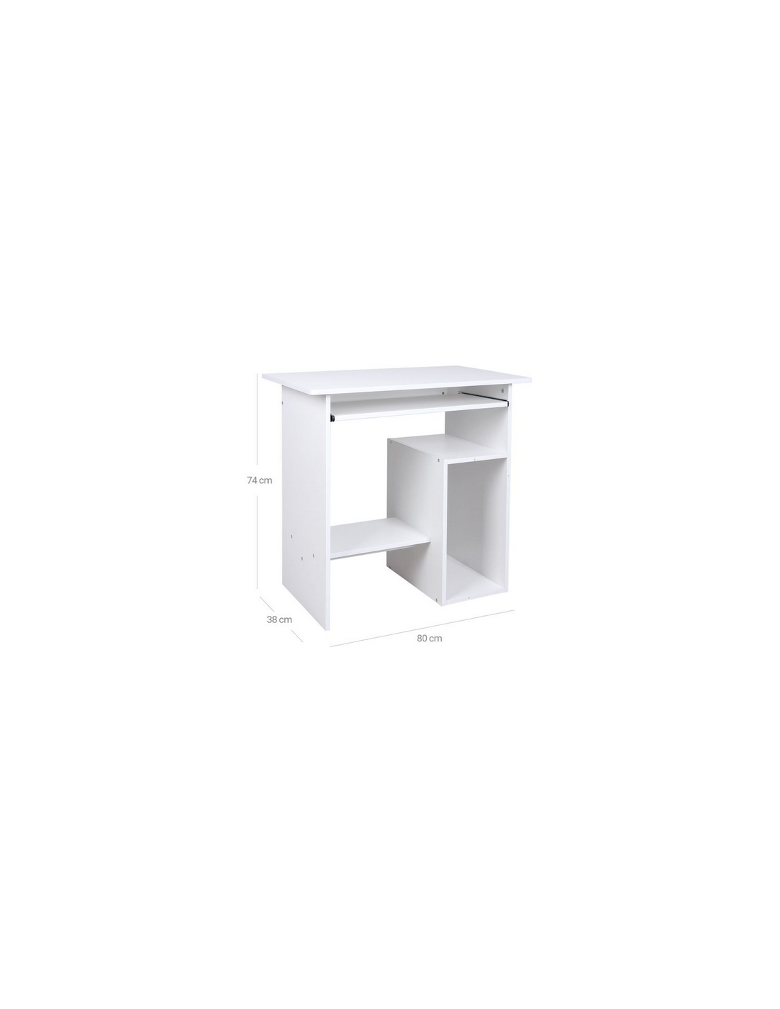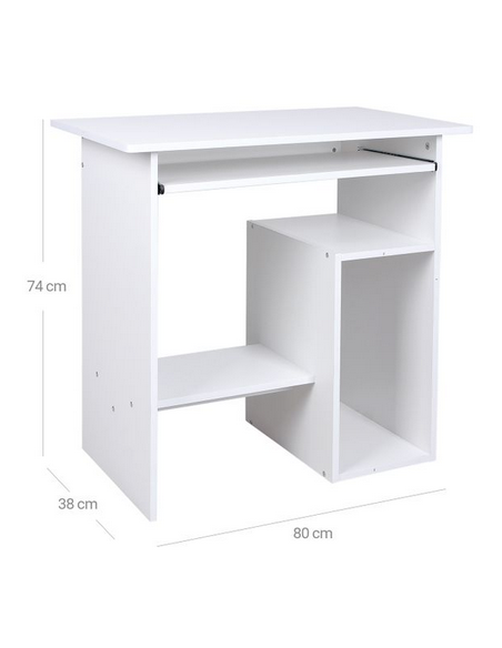 Computerbord udført i et design af hvid møbelplade. Bordet måler 74 cm i højden og 80 x 38 cm i bredde og dybde.