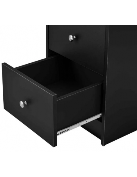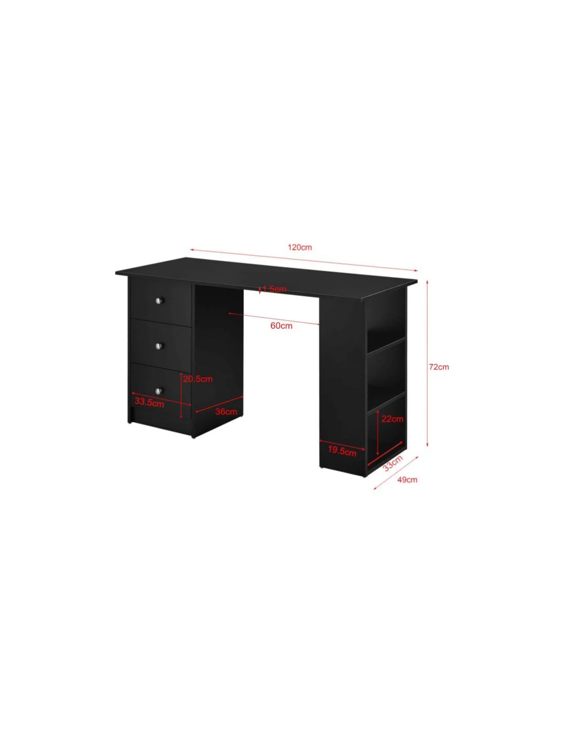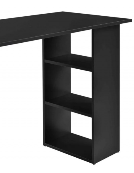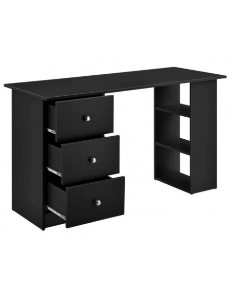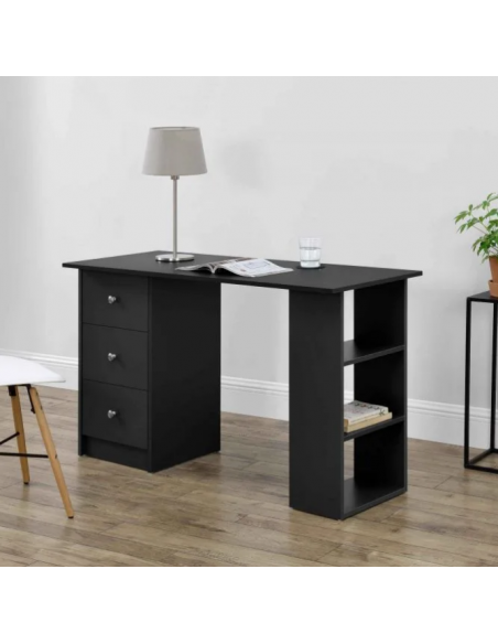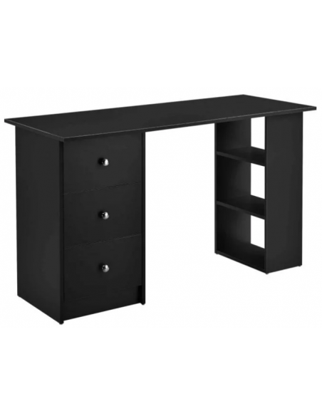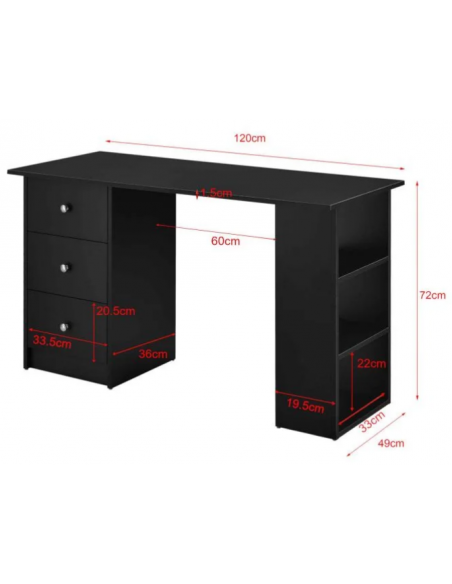 Skrivebord udført i et design af sort møbelplade. Skrivebordet måler 72 cm i højden og 120 x 49 cm i bredde og dybde.