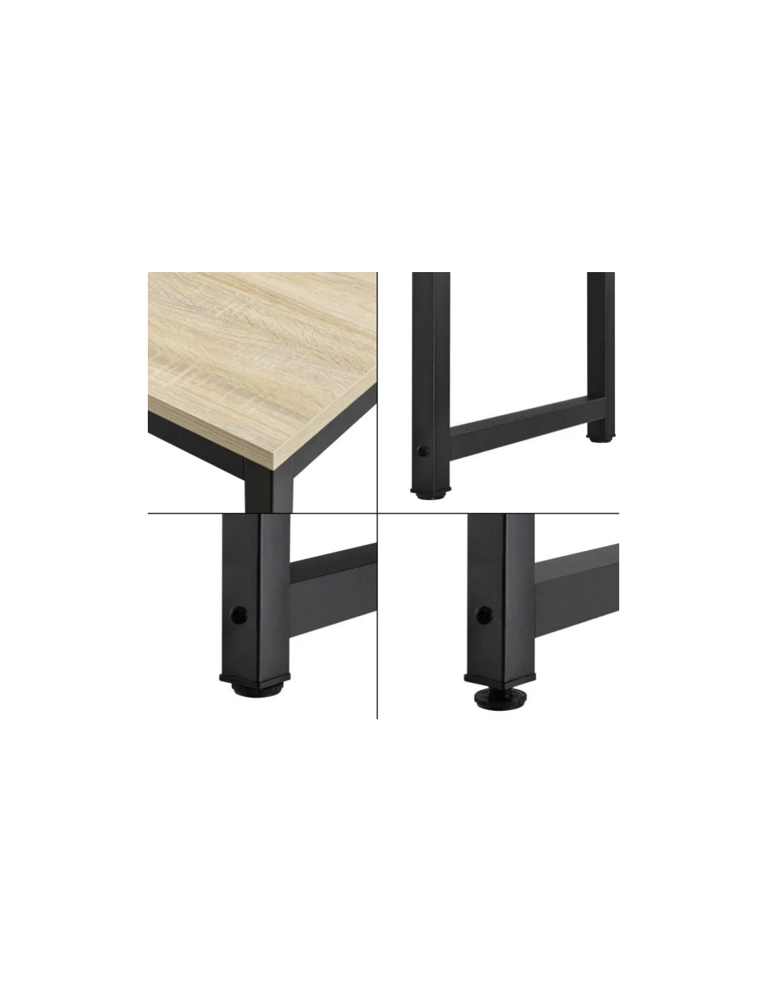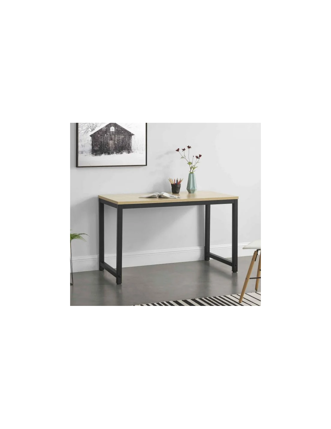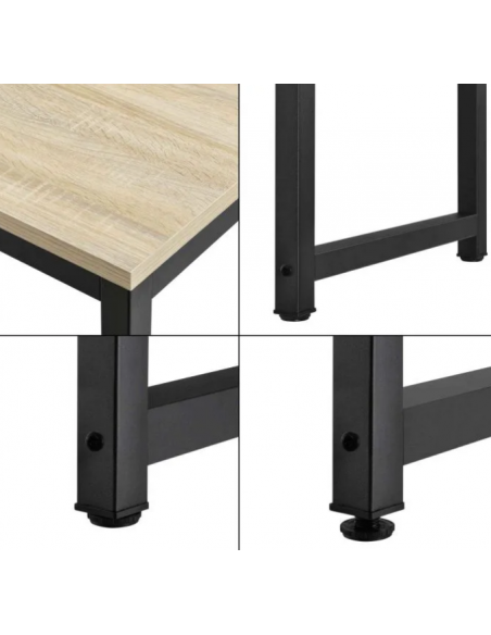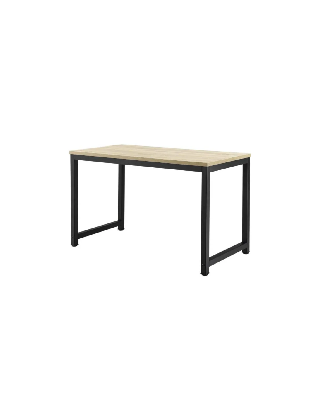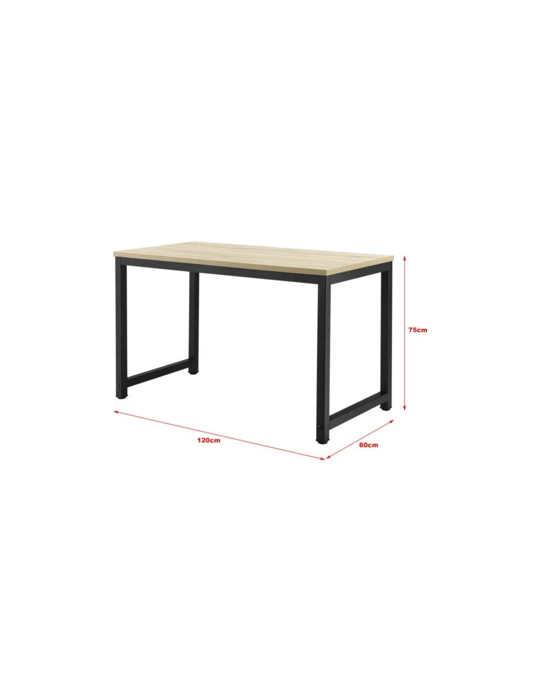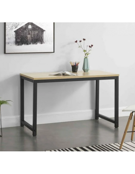Skrivebord udført i et design af sortlakeret metal og naturfarvet møbelplade. Skrivebordet måler 75 cm i højden og 120 x 60 cm i bredde og dybde.