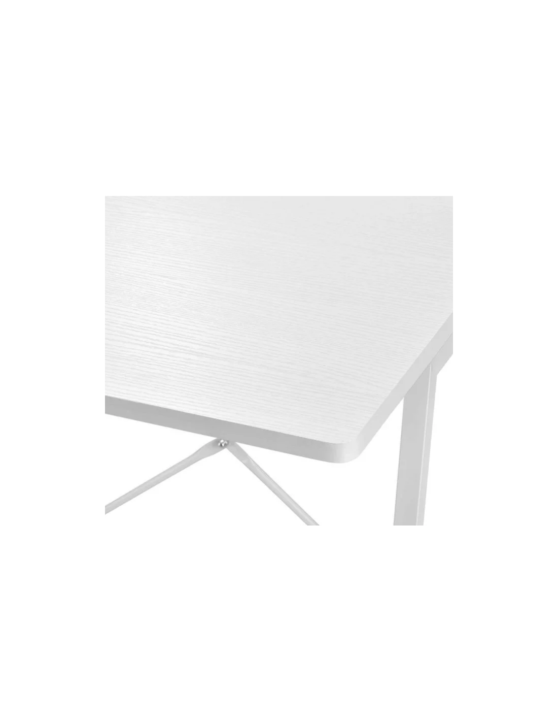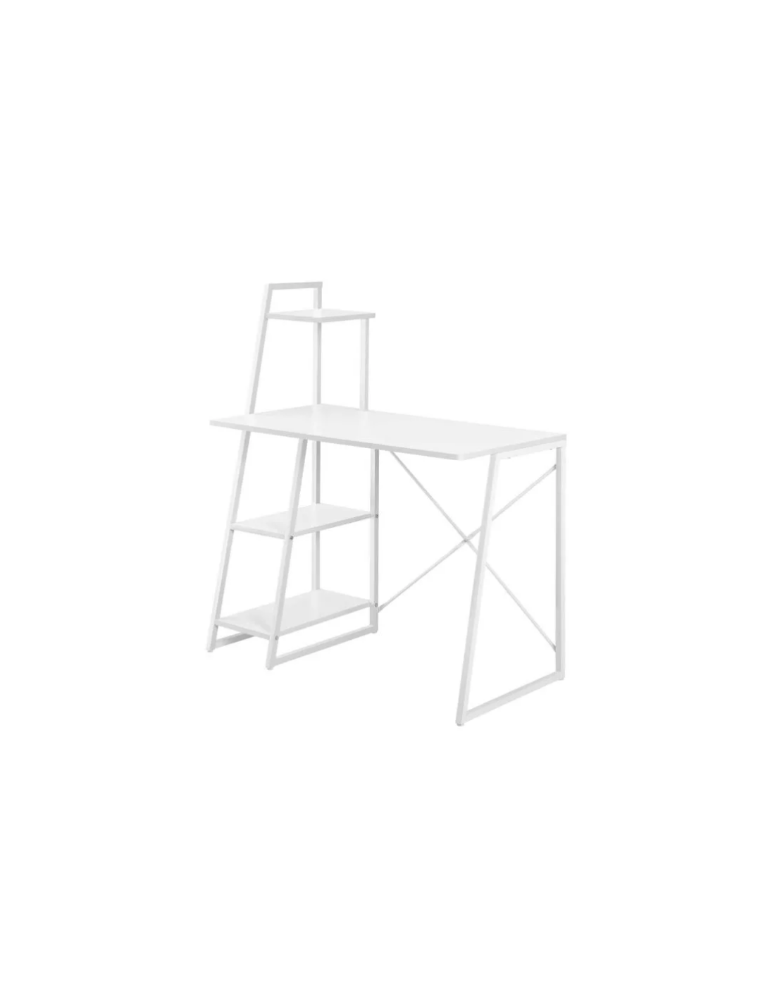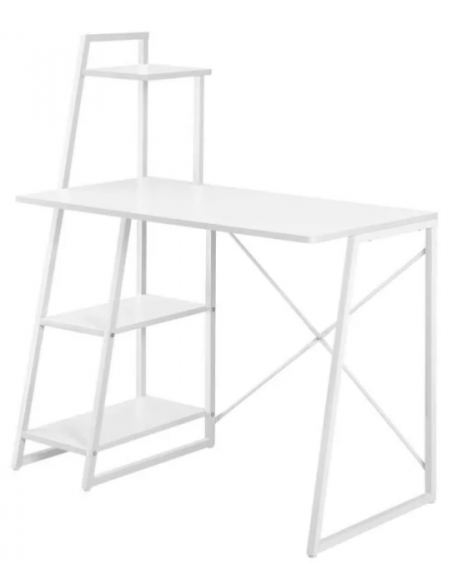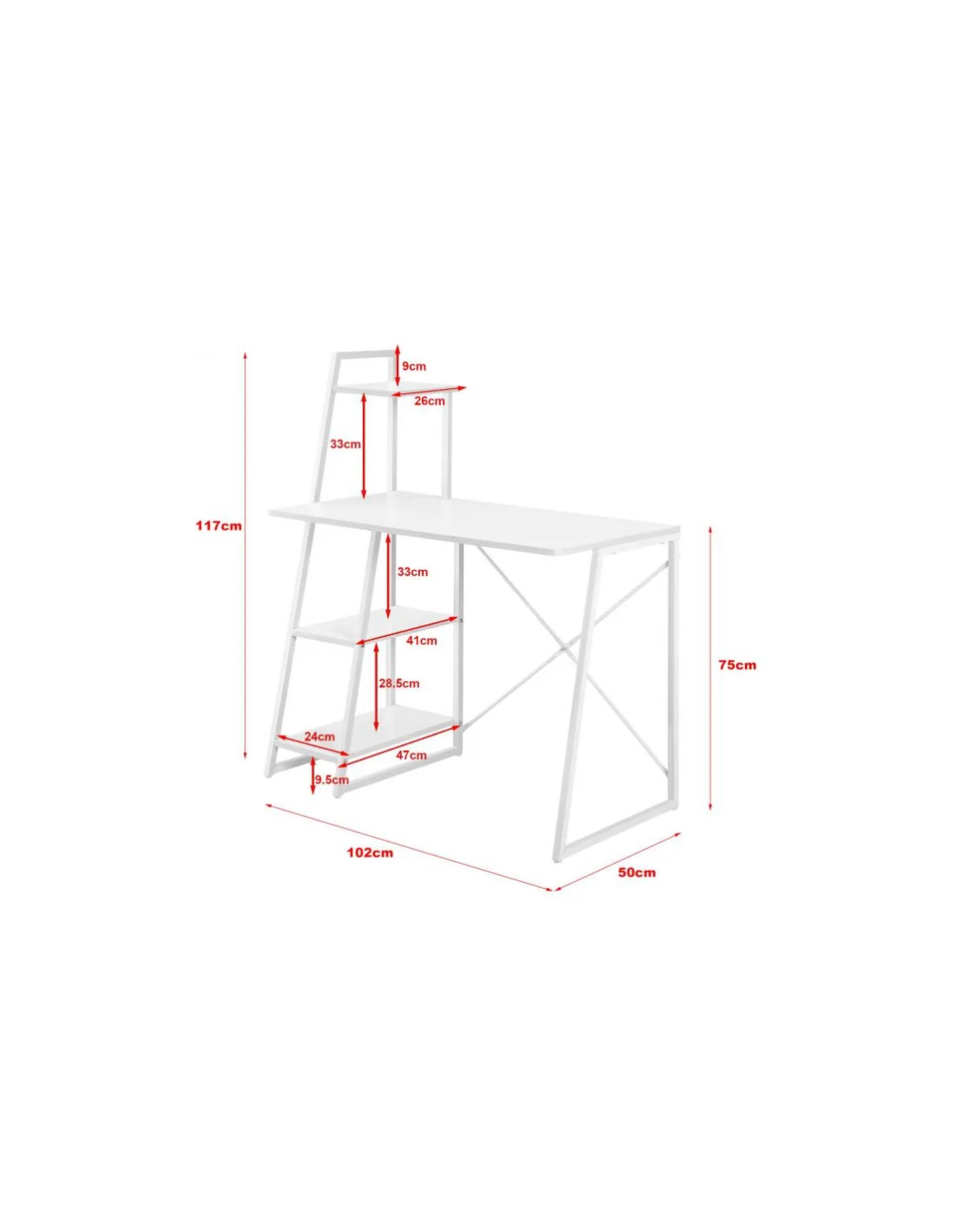 Skrivebord udført i et design af hvidlakeret metal og møbelplade. Skrivebordet måler 75 - 117 cm i højden og 102 x 50 cm i bredde og dybde.