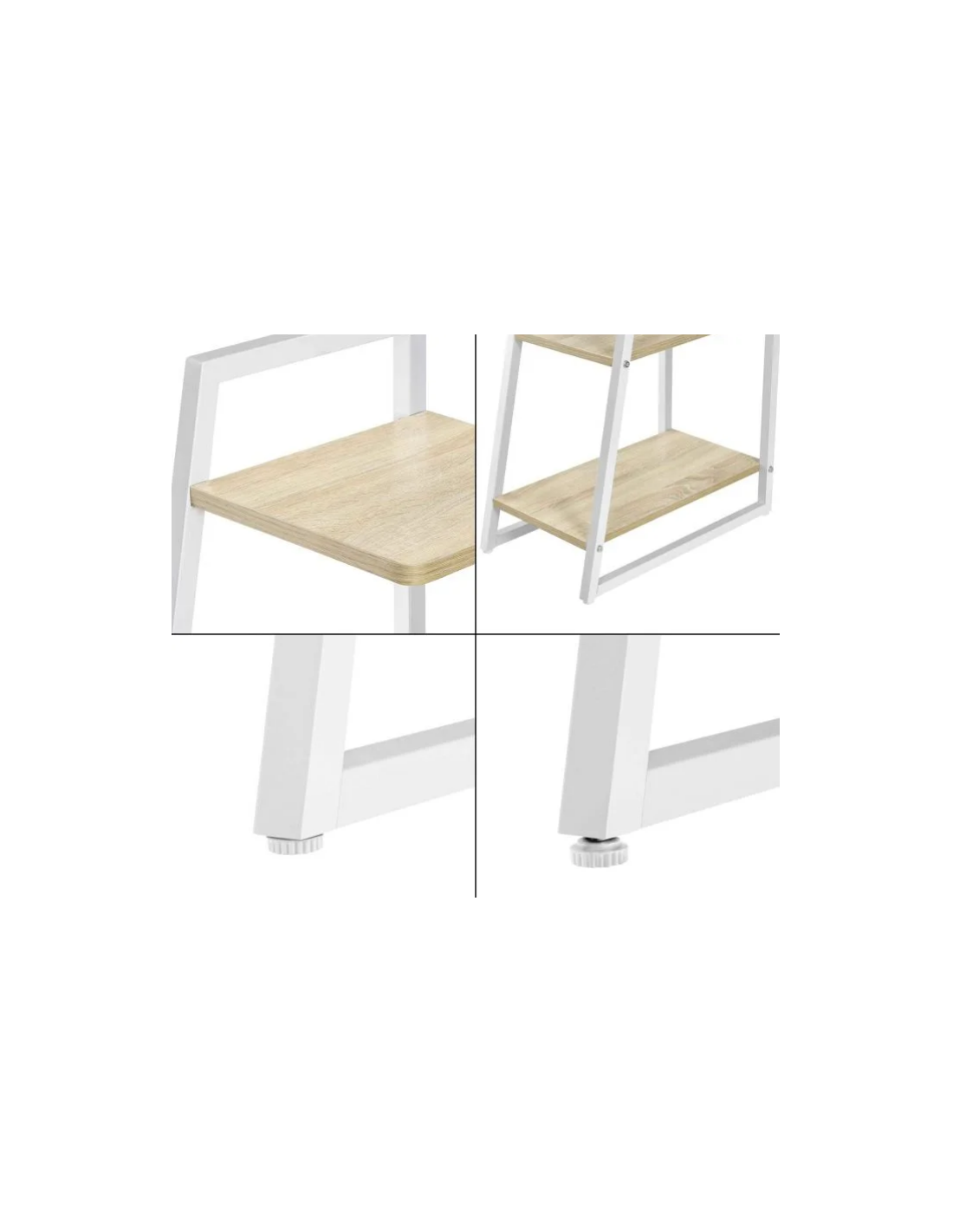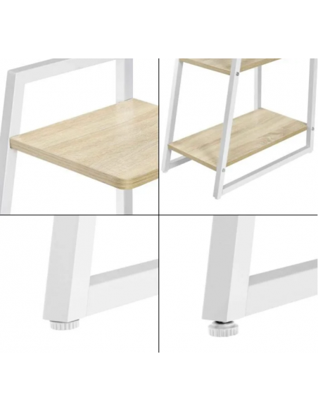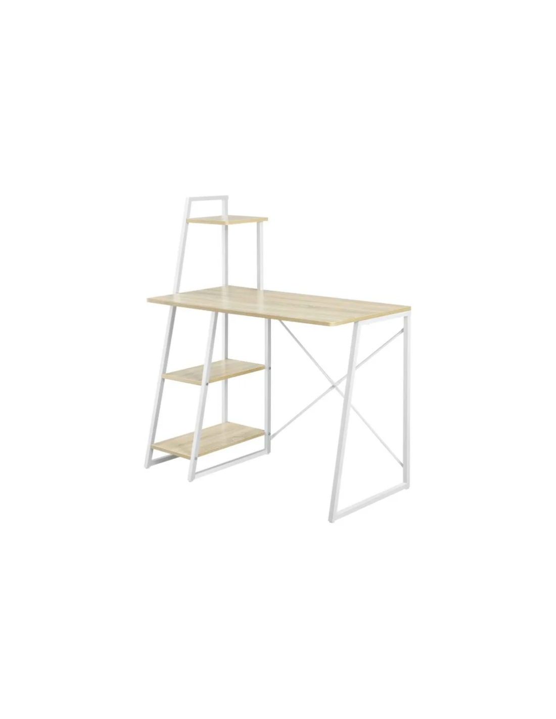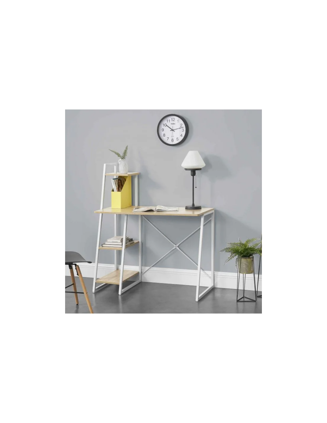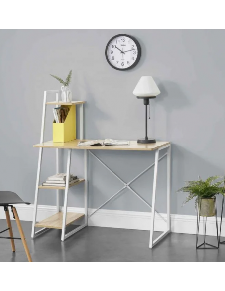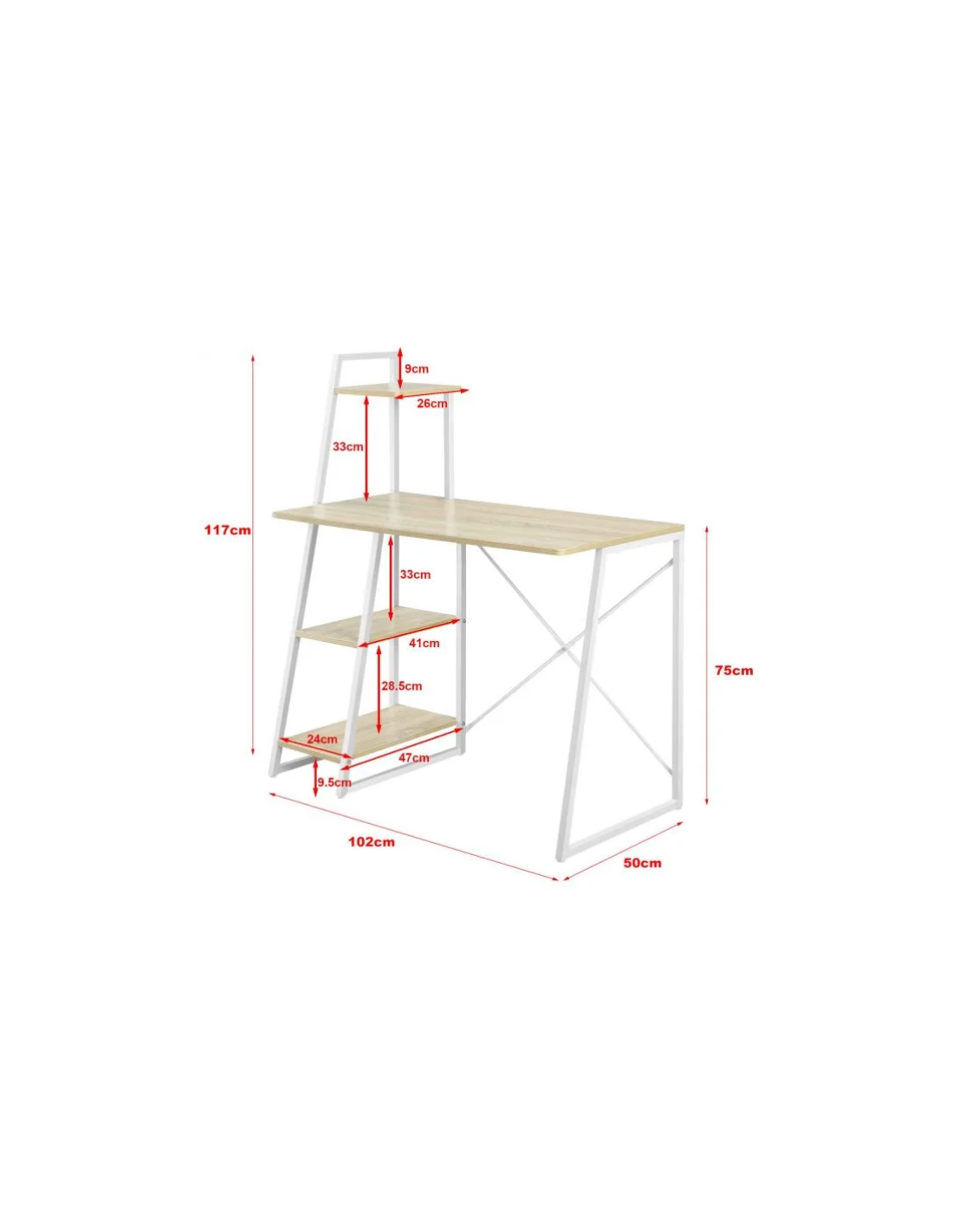 Skrivebord udført i et design af hvidlakeret metal og naturfarvet møbelplade. Skrivebordet måler 75 - 117 cm i højden og 102 x 50 cm i bredde og dybde.