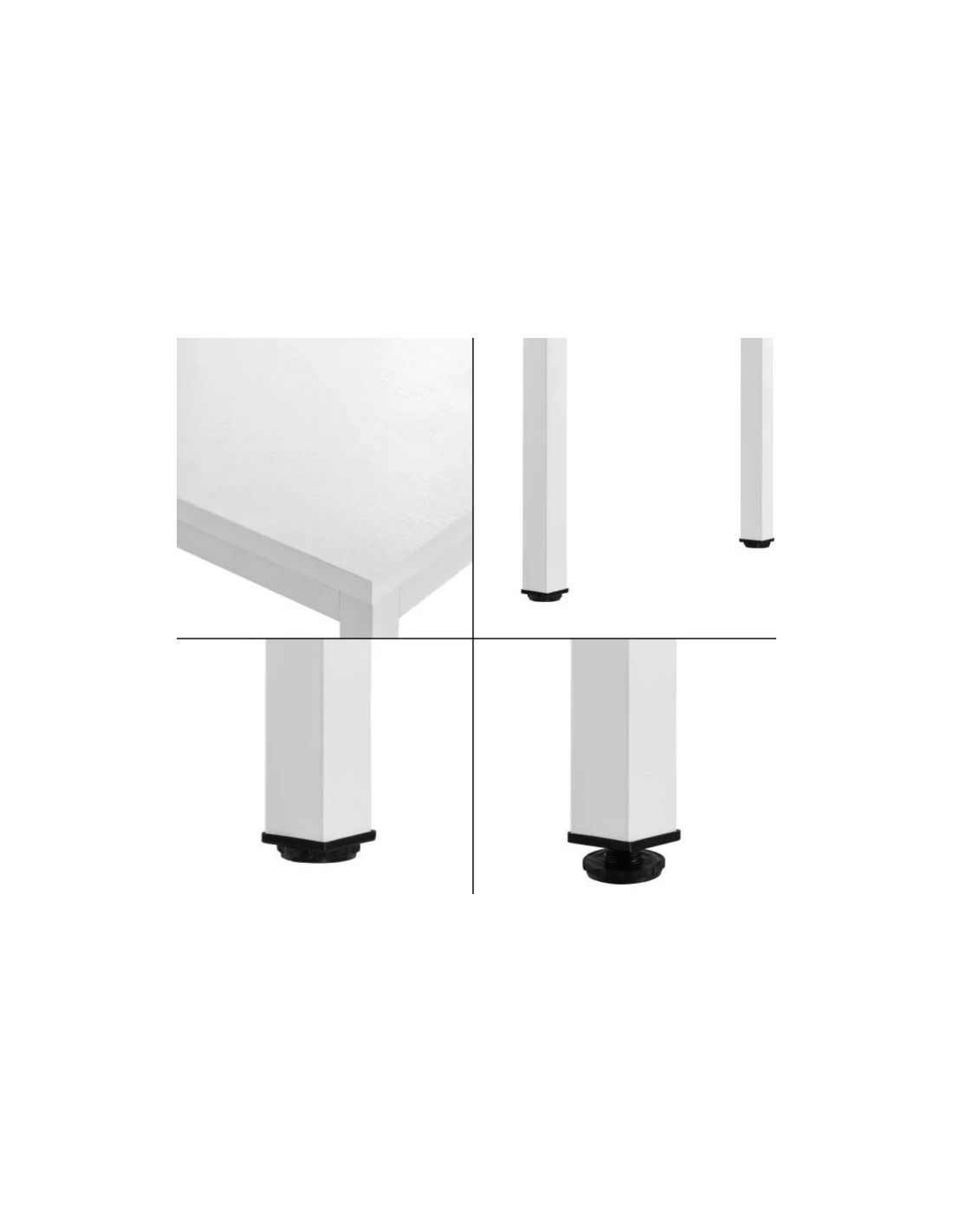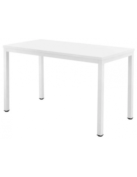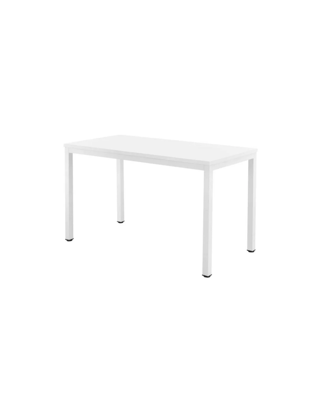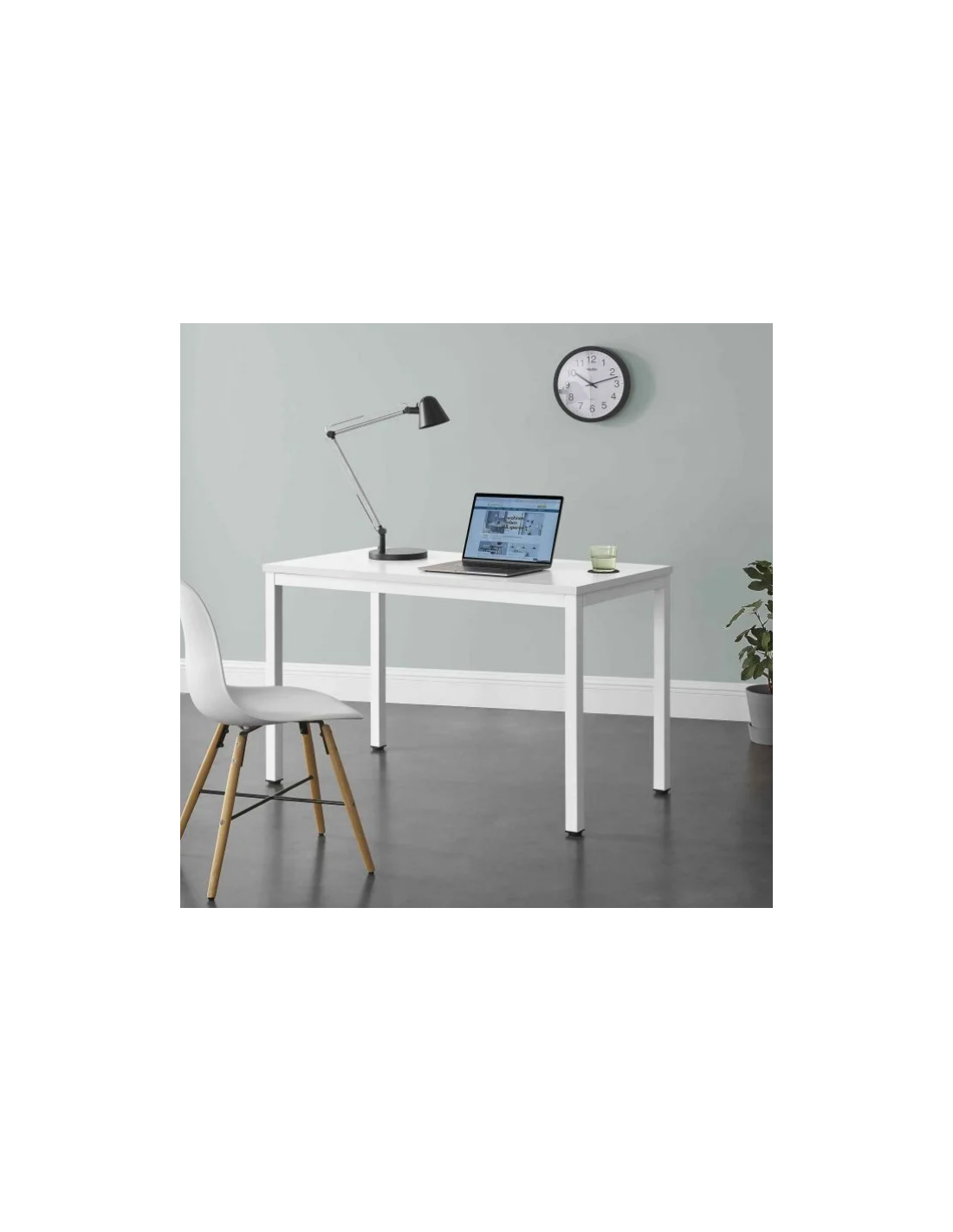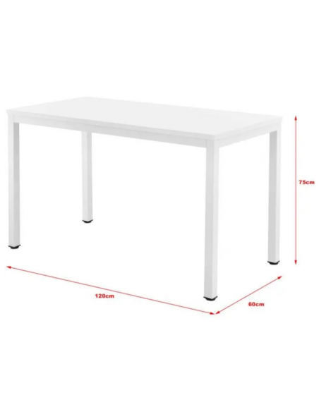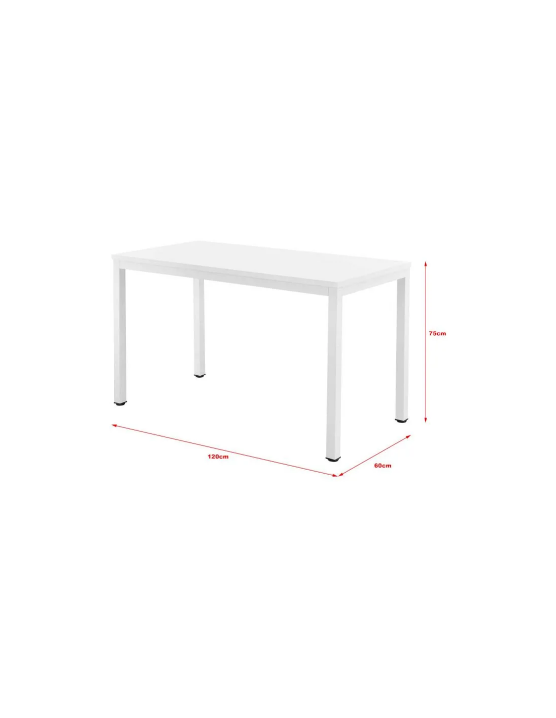 Skrivebord udført i et design af hvidlakeret metal og møbelplade. Skrivebordet måler 75 cm i højden og 120 x 60 cm i bredde og dybde.