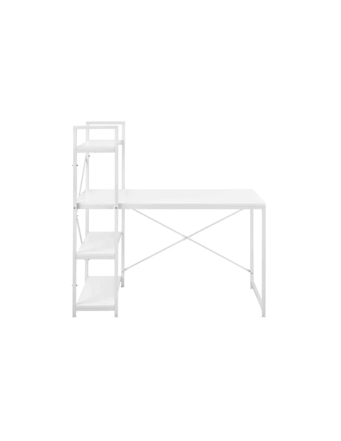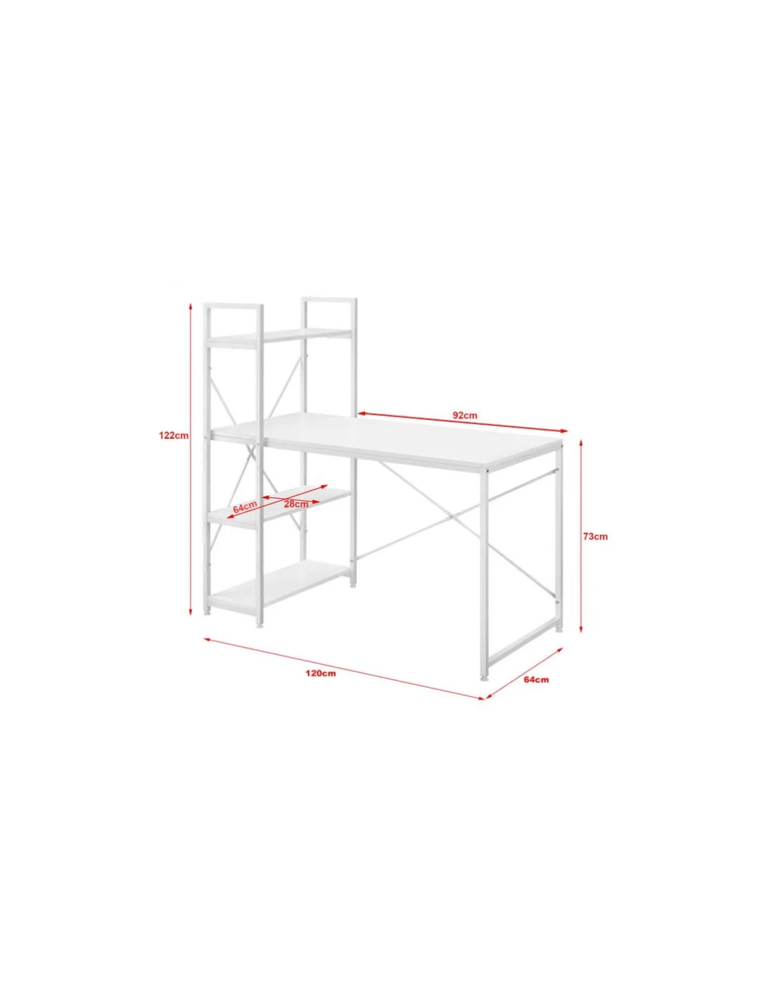 Skrivebord udført i et design af hvidlakeret metal og møbelplade. Skrivebordet måler 73 - 122 cm i højden og 120 x 64 cm i bredde og dybde.