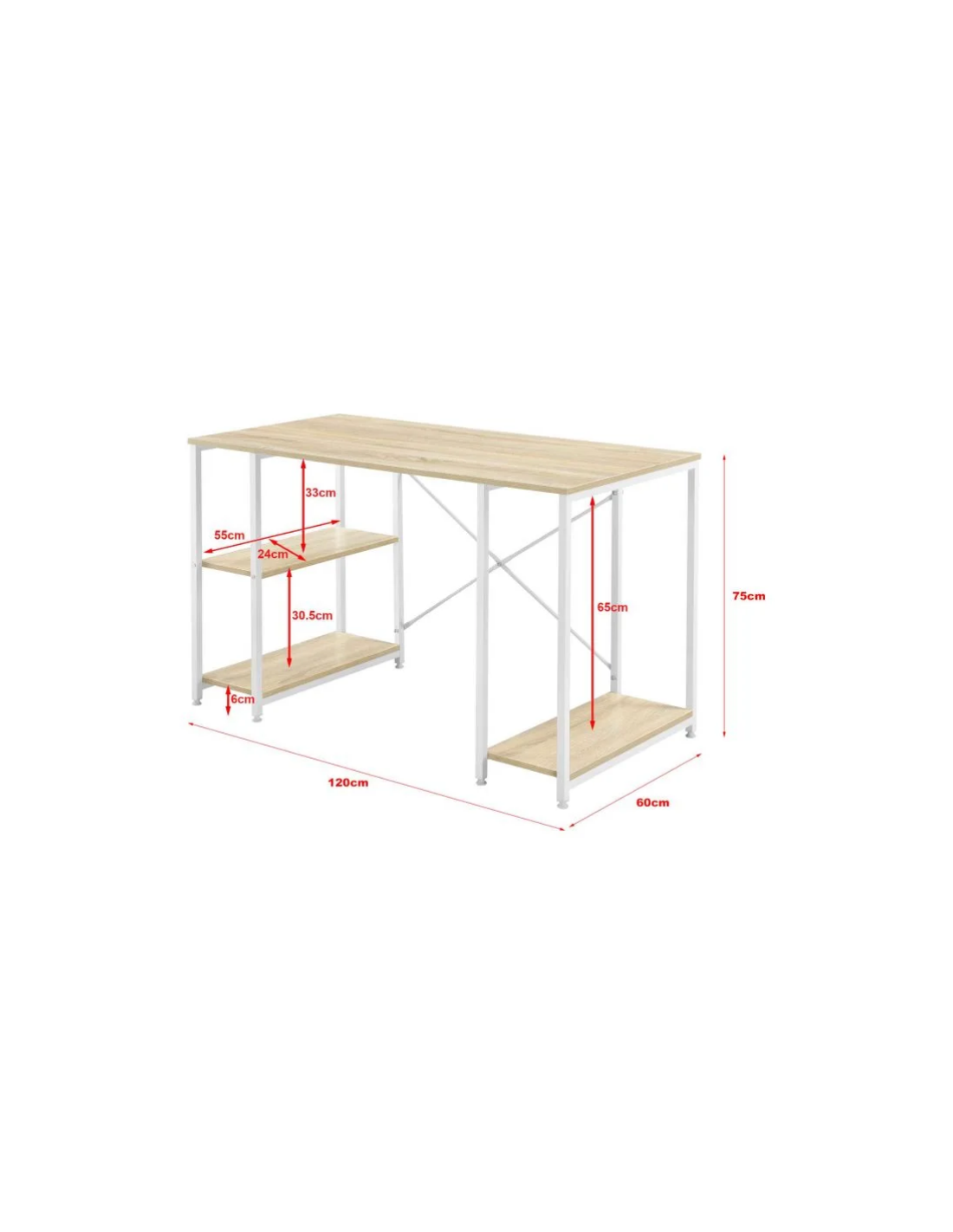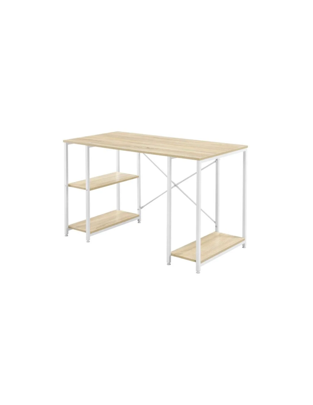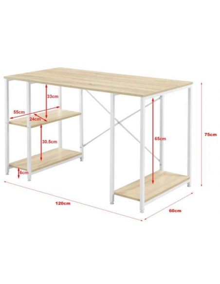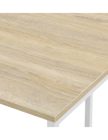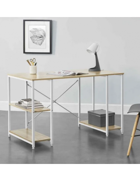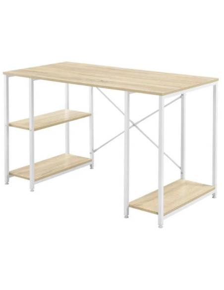 Skrivebord udført i et design af hvidlakeret metal og naturfarvet møbelplade. Skrivebordet måler 75 cm i højden og 120 x 60 cm i bredde og dybde.