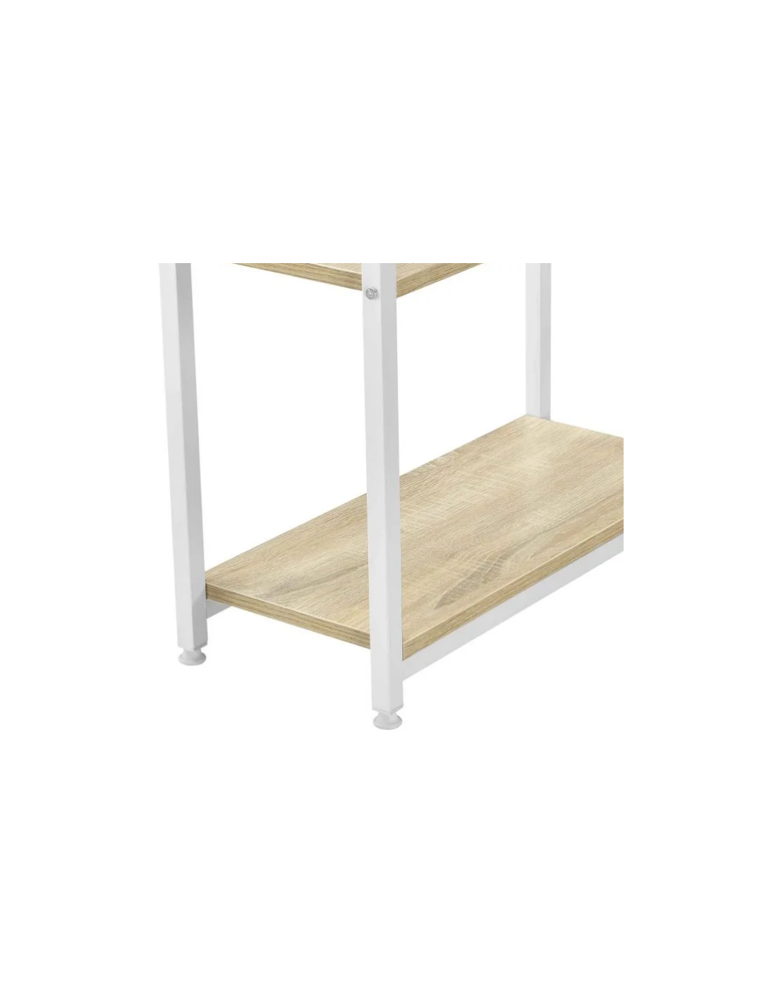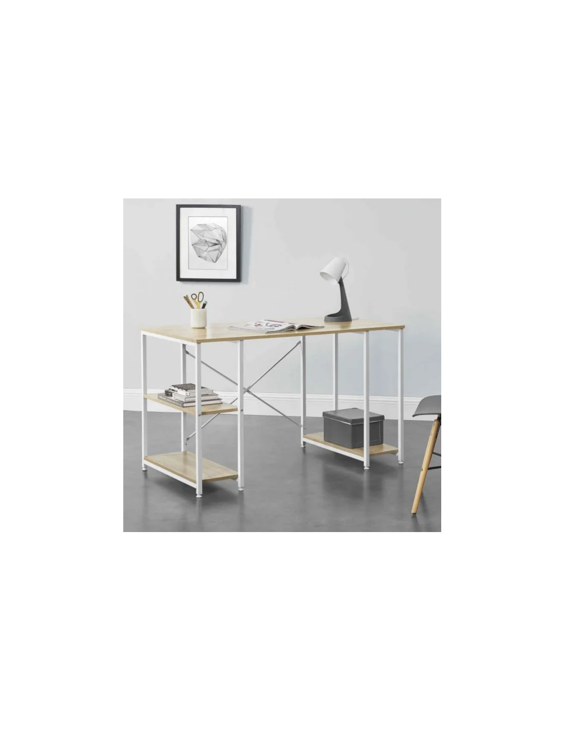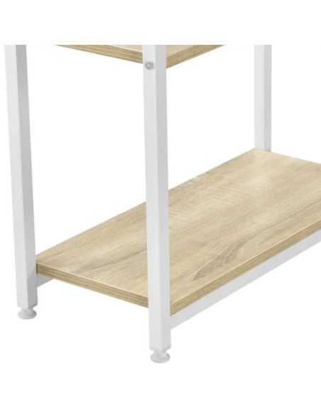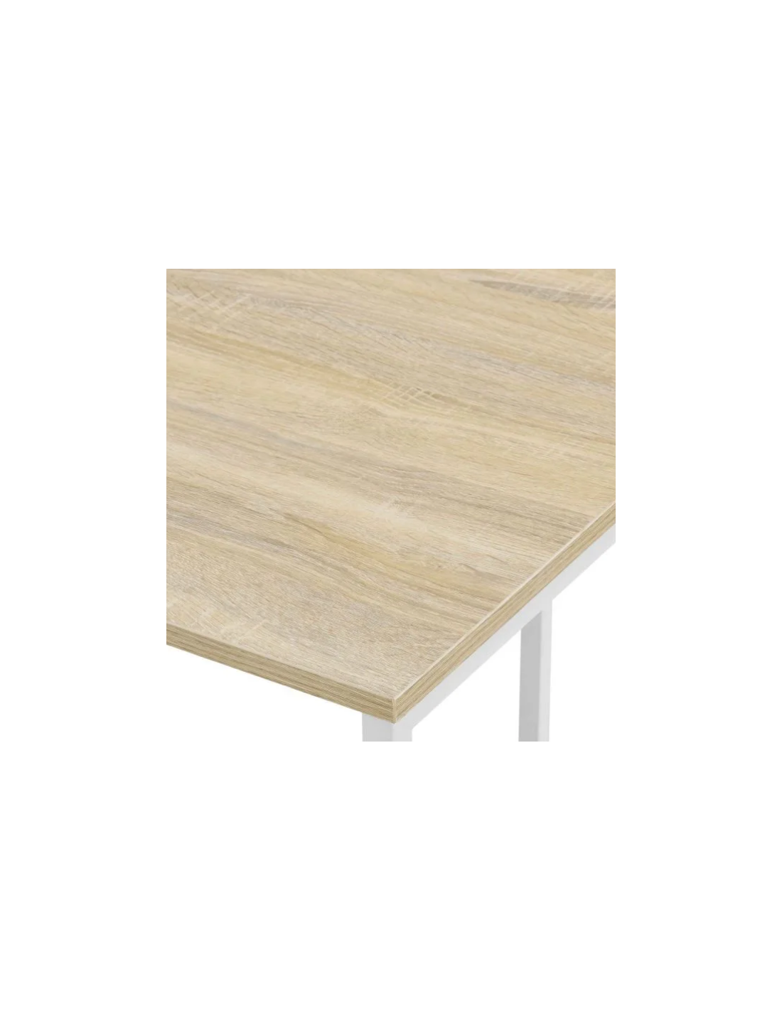 Skrivebord udført i et design af hvidlakeret metal og naturfarvet møbelplade. Skrivebordet måler 75 cm i højden og 120 x 60 cm i bredde og dybde.