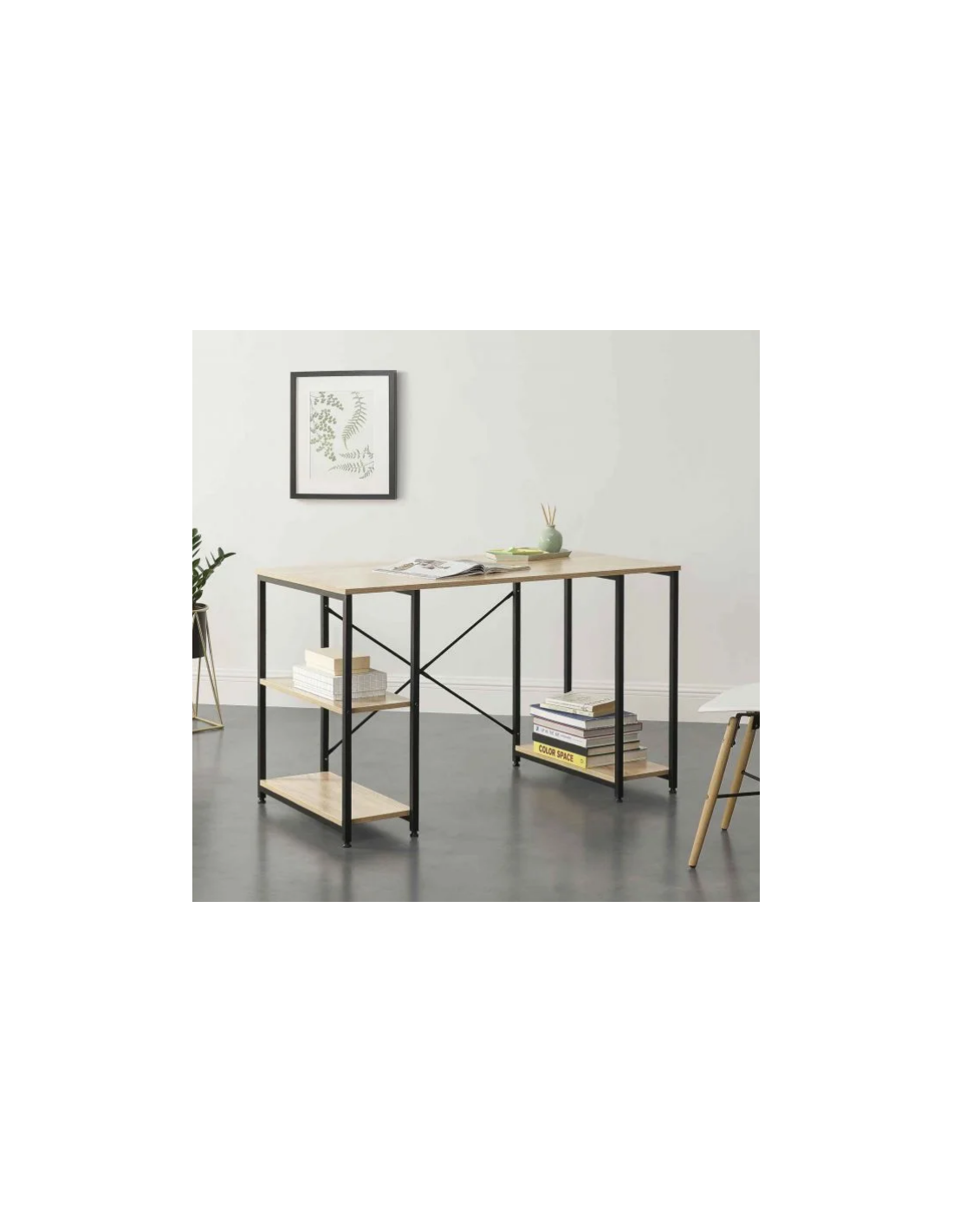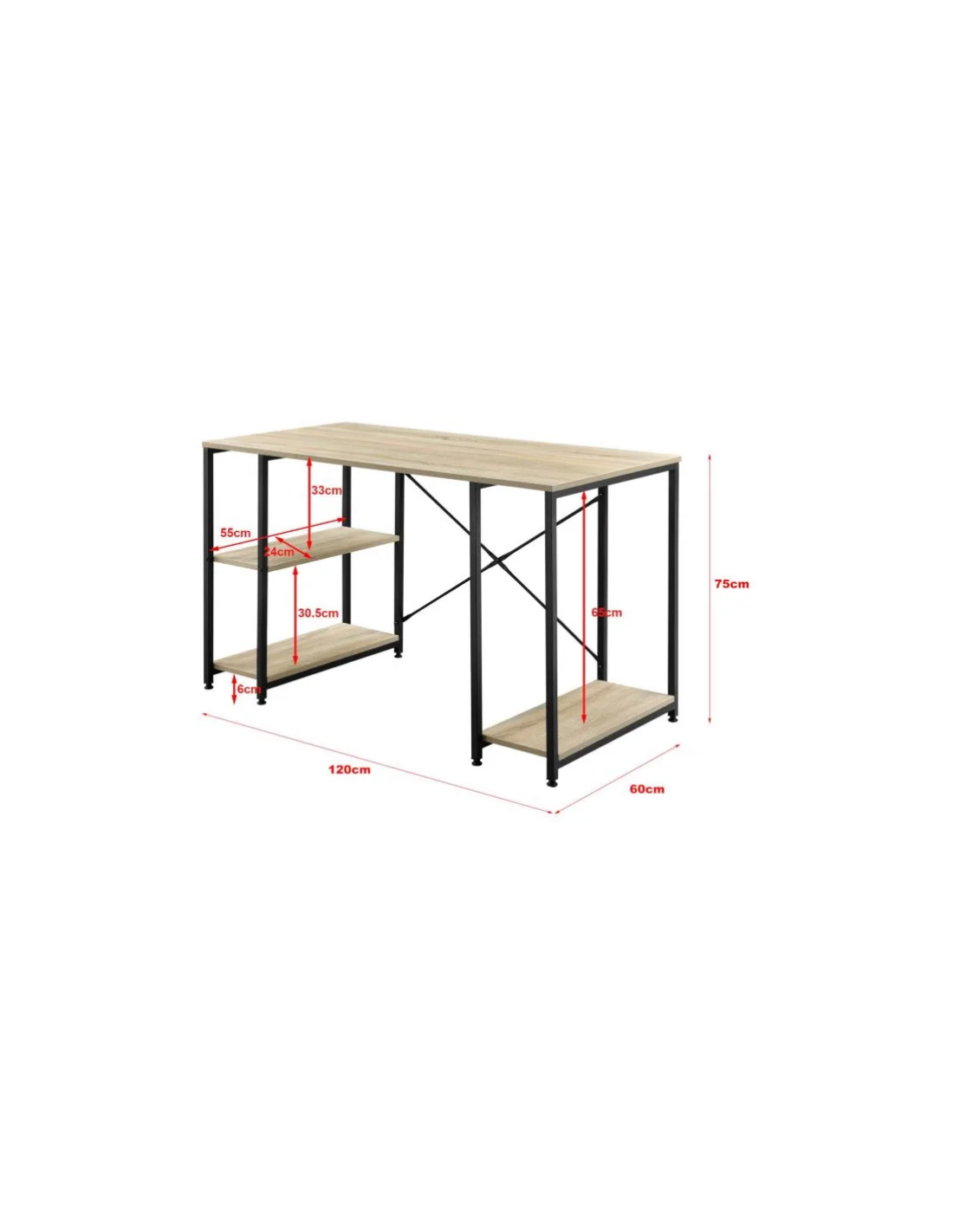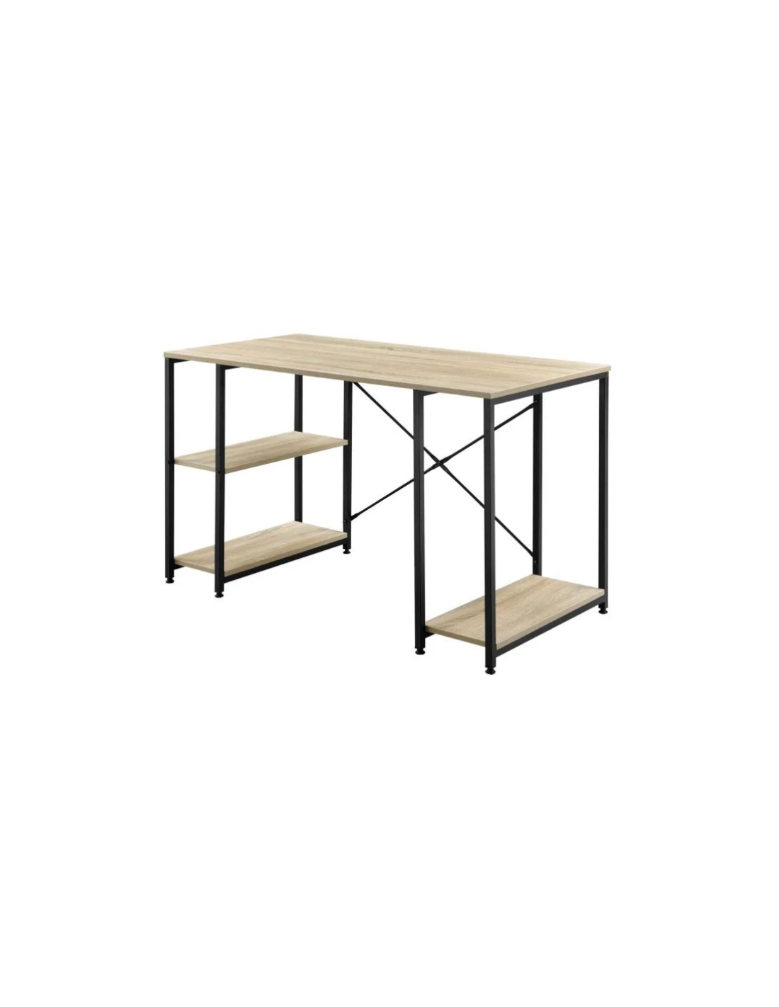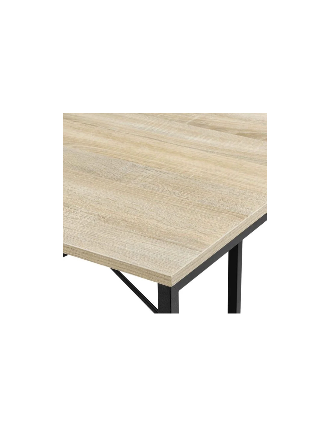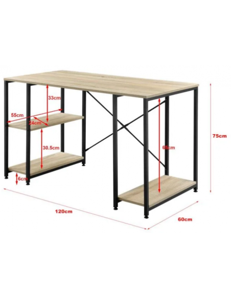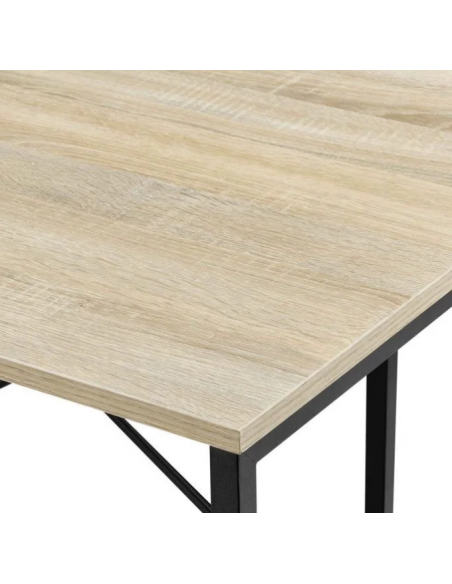 Skrivebord udført i et design af sortlakeret metal og naturfarvet møbelplade. Skrivebordet måler 75 cm i højden og 120 x 60 cm i bredde og dybde.