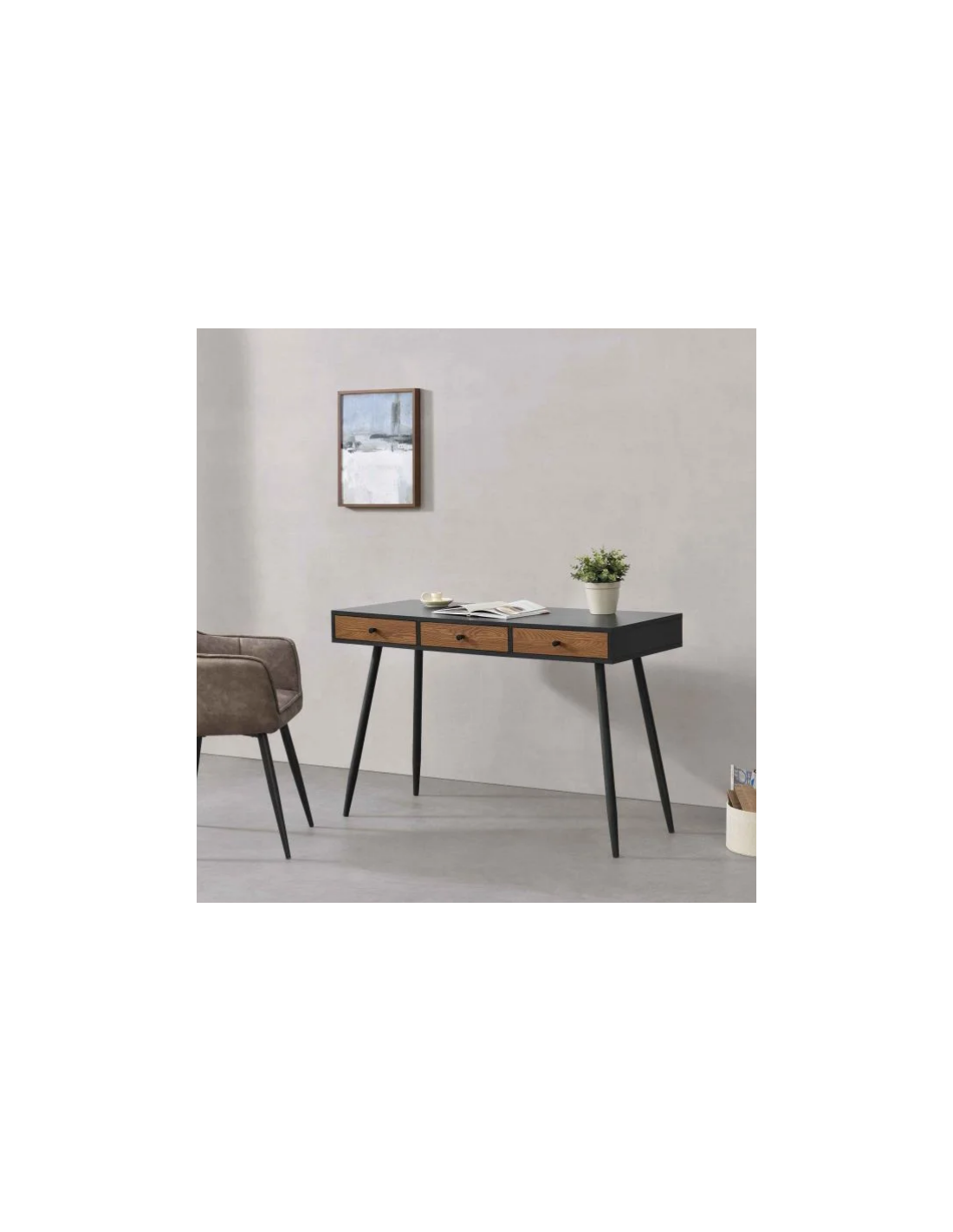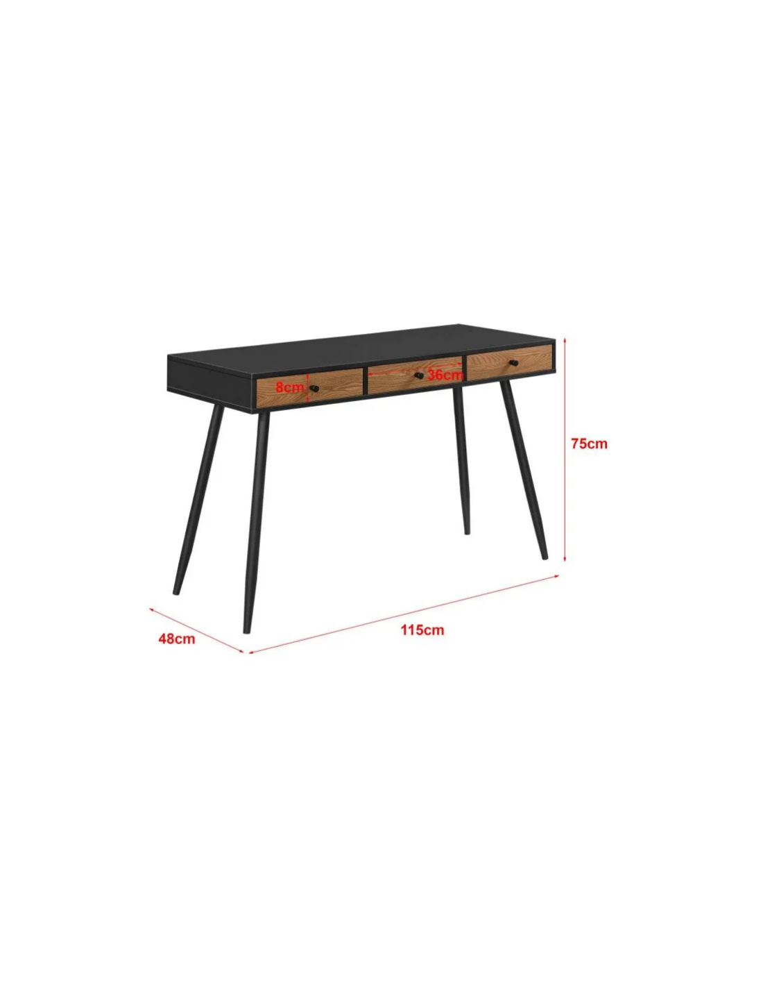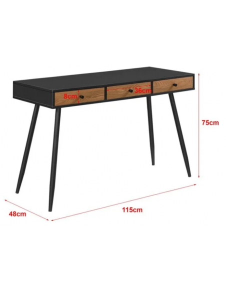 Skrivebord udført i et design af metal og møbelplade. Skrivebordet måler 75 cm i højden og 115 x 48 cm i bredde og dybde.