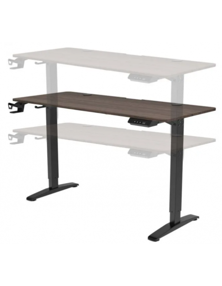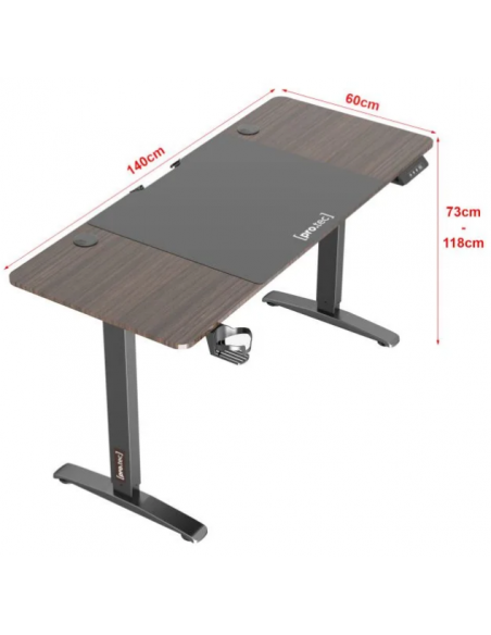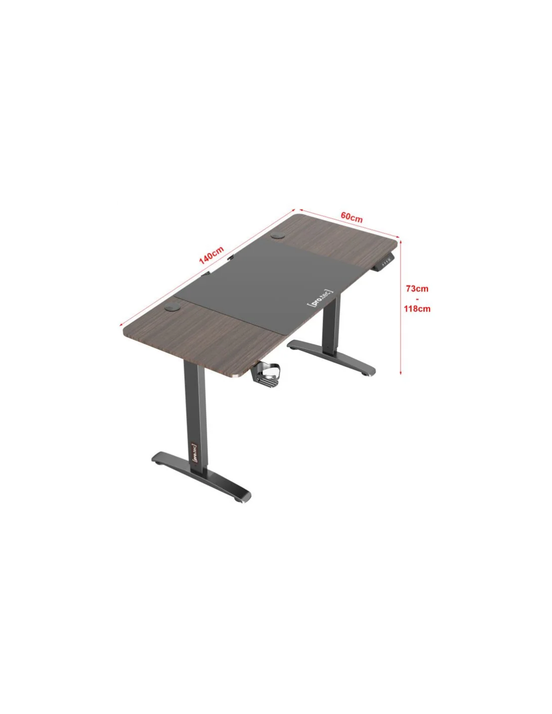 Hæve/sænke skrivebord udført i et design af aluminium og møbelplade. Skrivebordet måler 73 - 118 cm i højden og 140 x 60 cm i bredde og dybde.