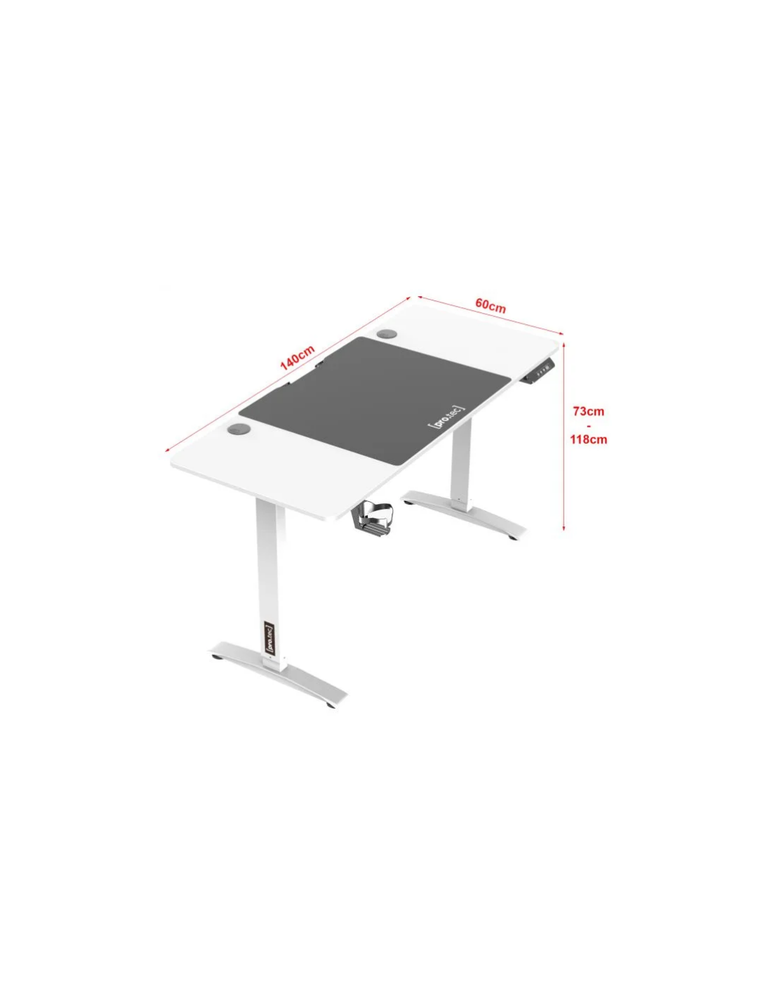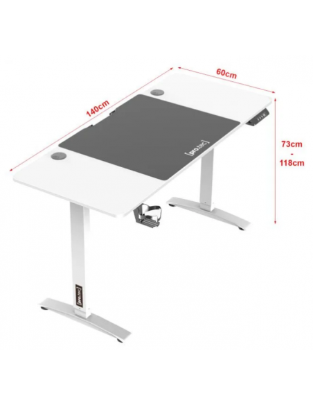 Hæve/sænke skrivebord udført i et design af aluminium og møbelplade. Skrivebordet måler 73 - 118 cm i højden og 140 x 60 cm i bredde og dybde.