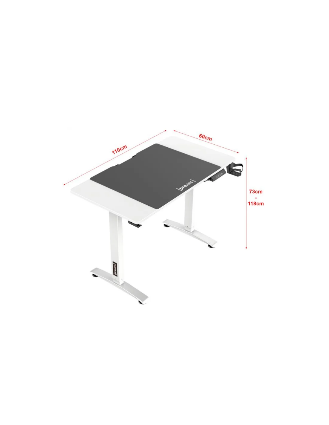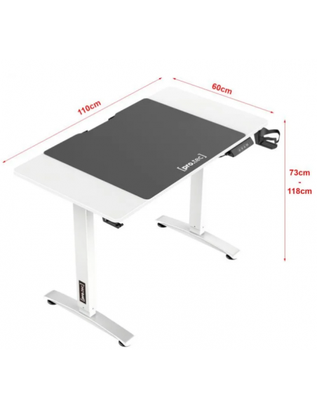 Hæve/sænke skrivebord udført i et design af aluminium og møbelplade. Skrivebordet måler 73 - 118 cm i højden og 110 x 60 cm i bredde og dybde.