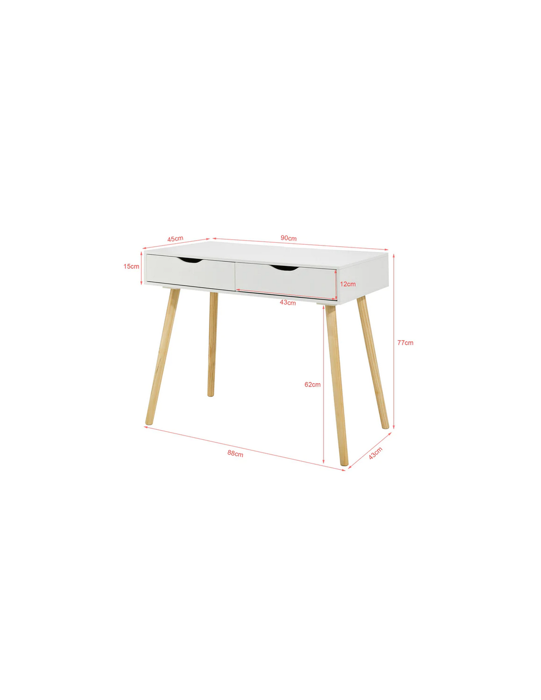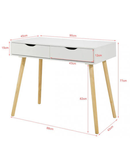 Skrivebord udført i et design af træ og møbelplade. Skrivebordet måler 77 cm i højden og 90 x 45 cm i bredde og dybde.