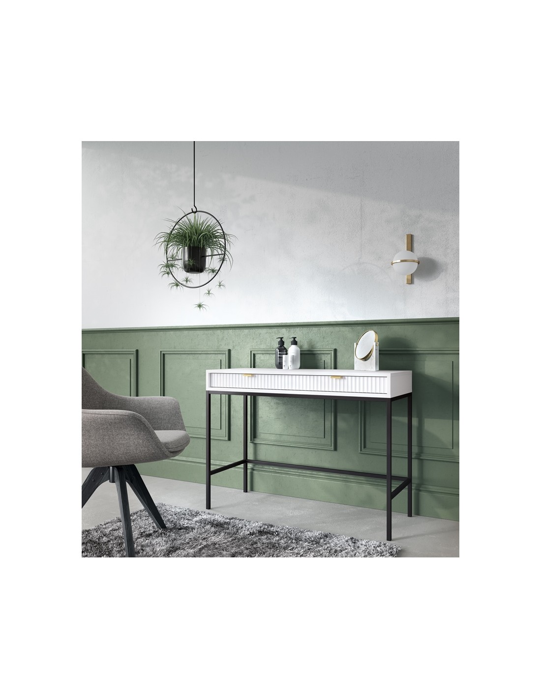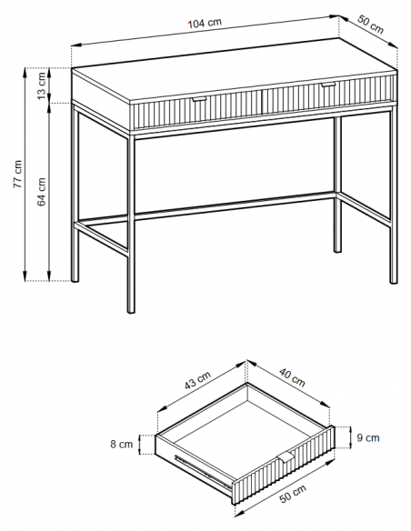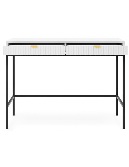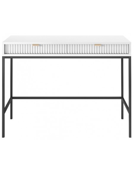 Nova skrivebord udført i et design af sortlakeret metal og hvid møbelplade med detaljer i guldfarvet metal. Skrivebordet måler 77 cm i højden og 104 x 50 cm i bredde og dybde og indeholder 2 skuffer.