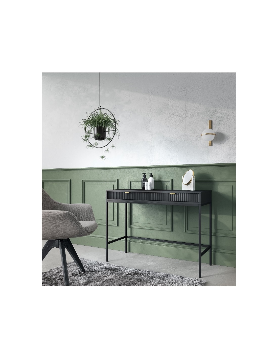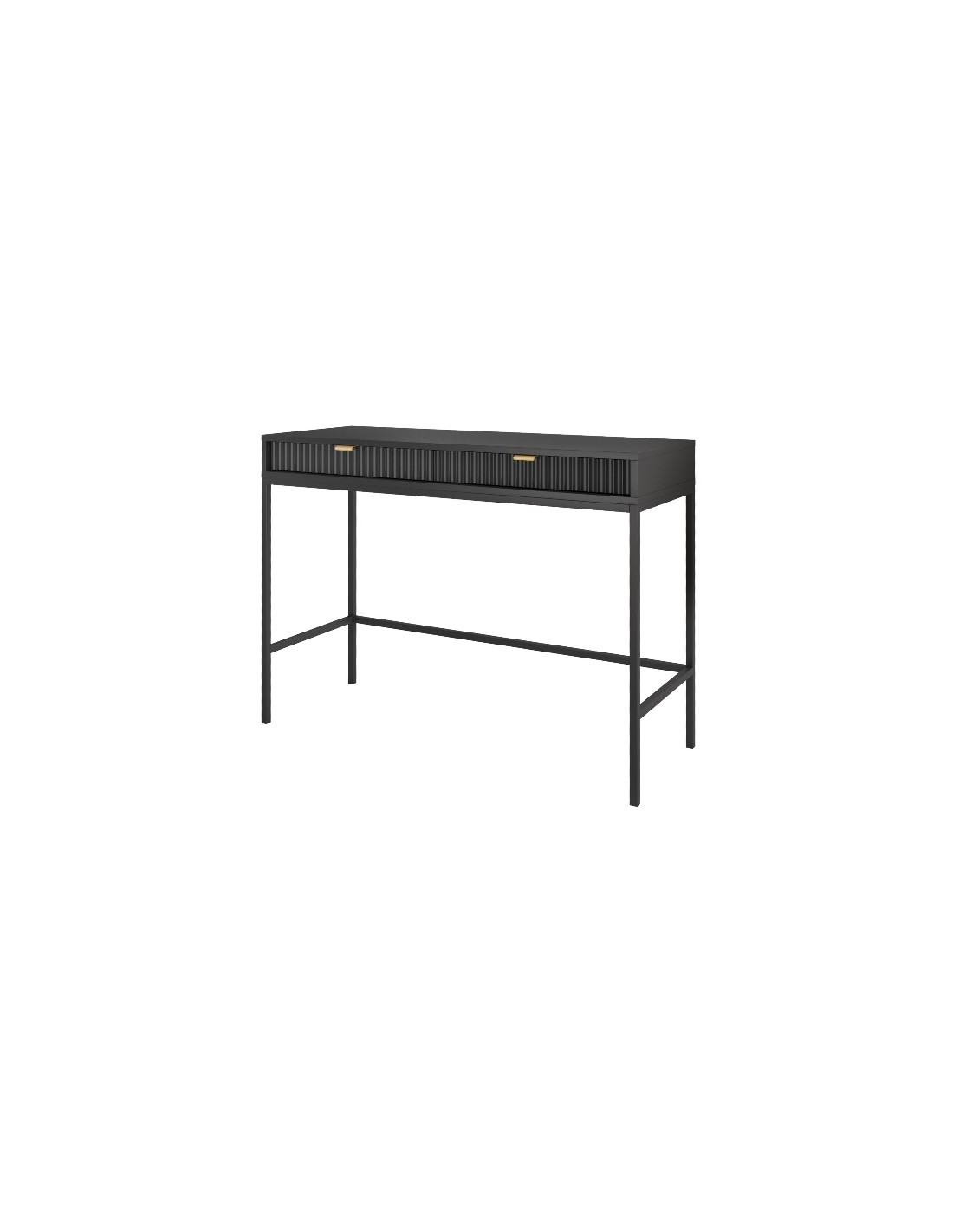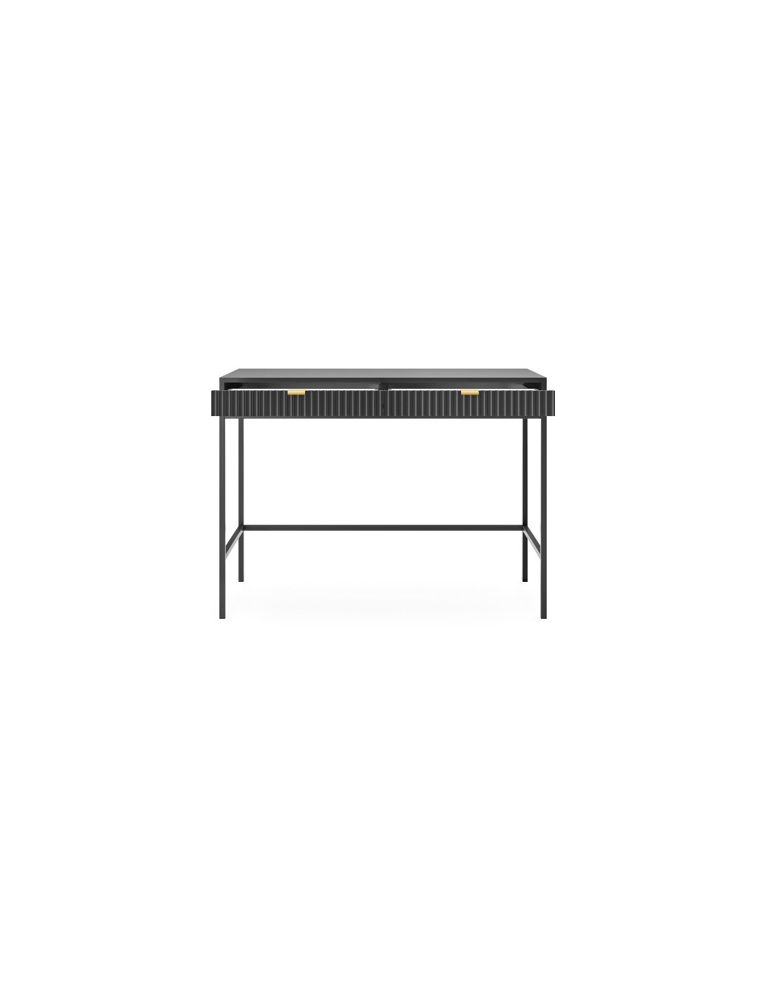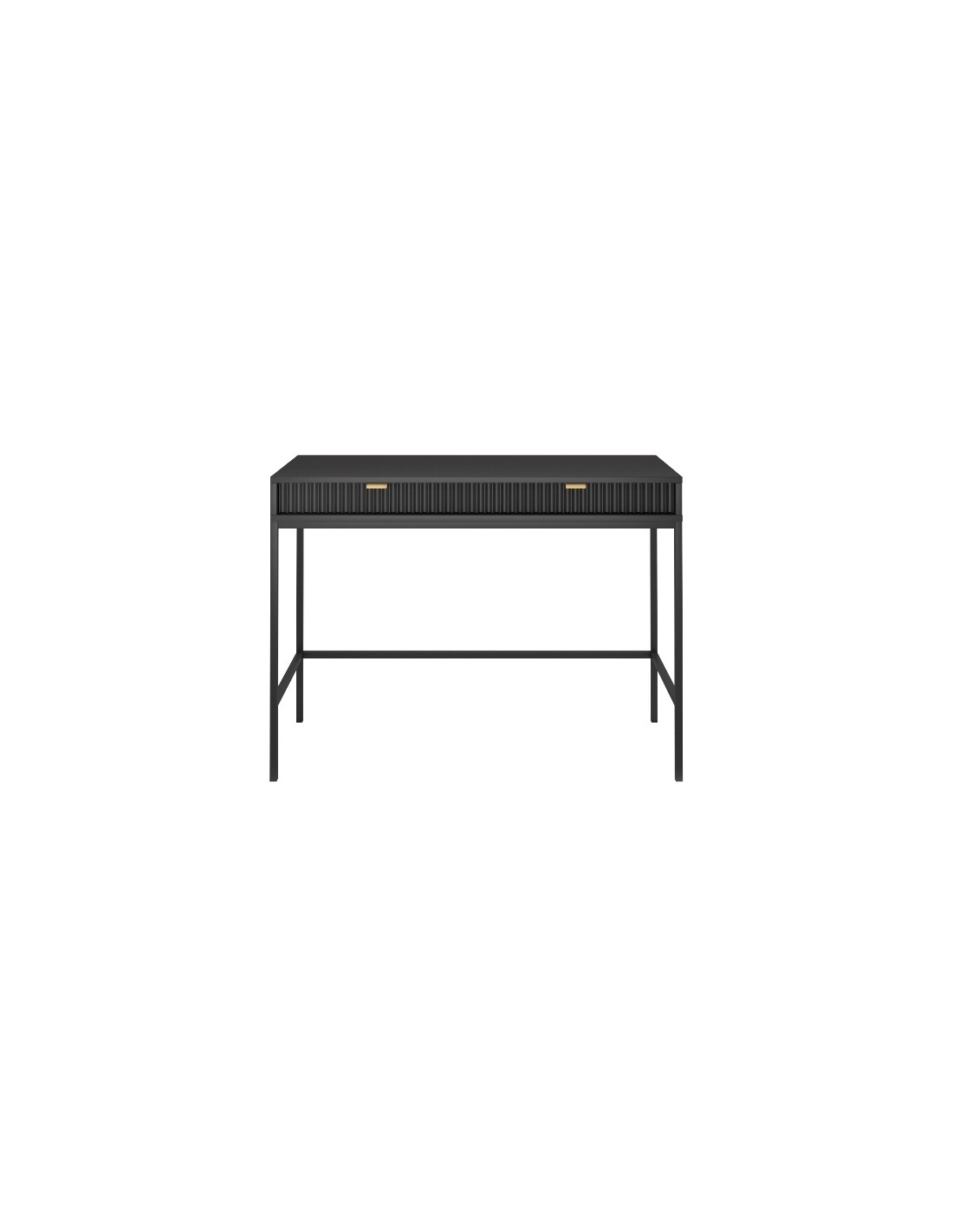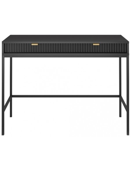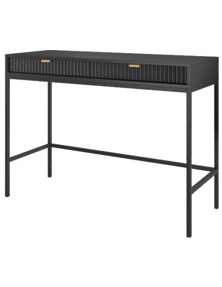 Nova skrivebord udført i et design af sortlakeret metal og møbelplade med detaljer i guldfarvet metal. Skrivebordet måler 77 cm i højden og 104 x 50 cm i bredde og dybde og indeholder 2 skuffer.