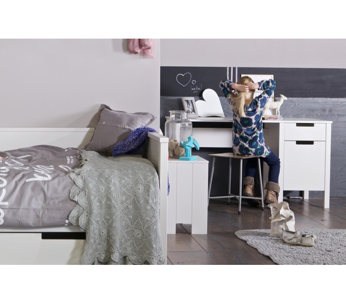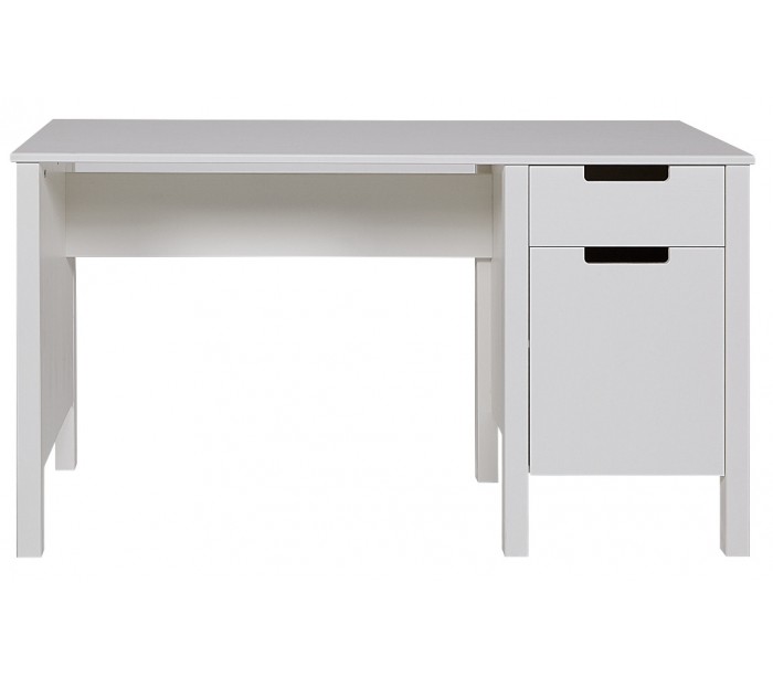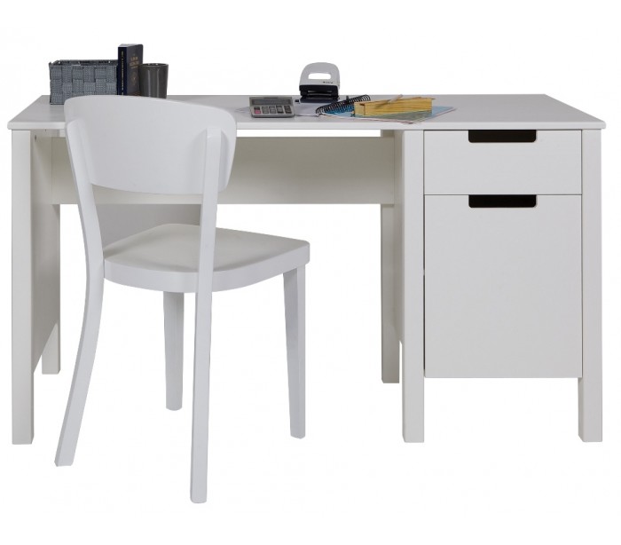 Skrivebord i et moderne design, fremstillet i hvidlakeret fyrretræ. Skrivebordet indeholder 1 skuffe og 1 skab med hylderum. Bordet måler 75 cm i højden og 140 x 60 cm i bredde og dybde.