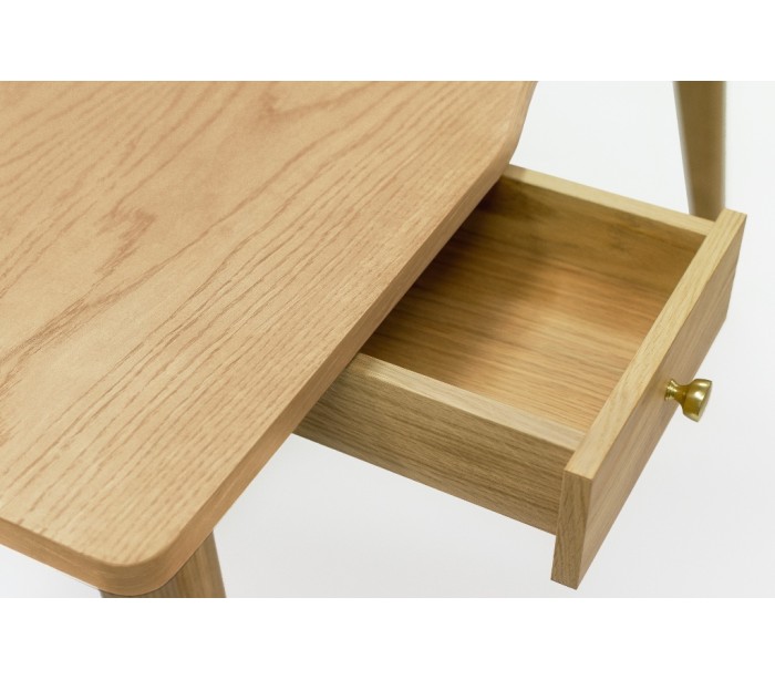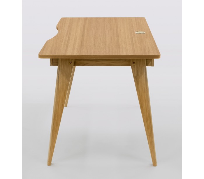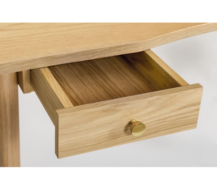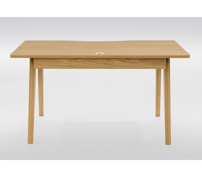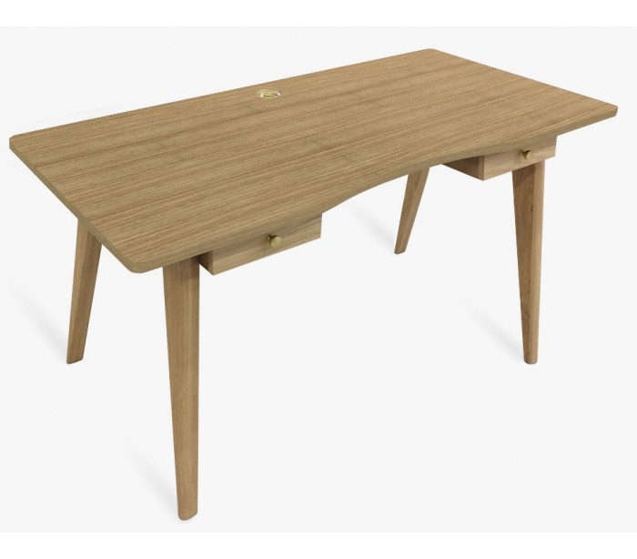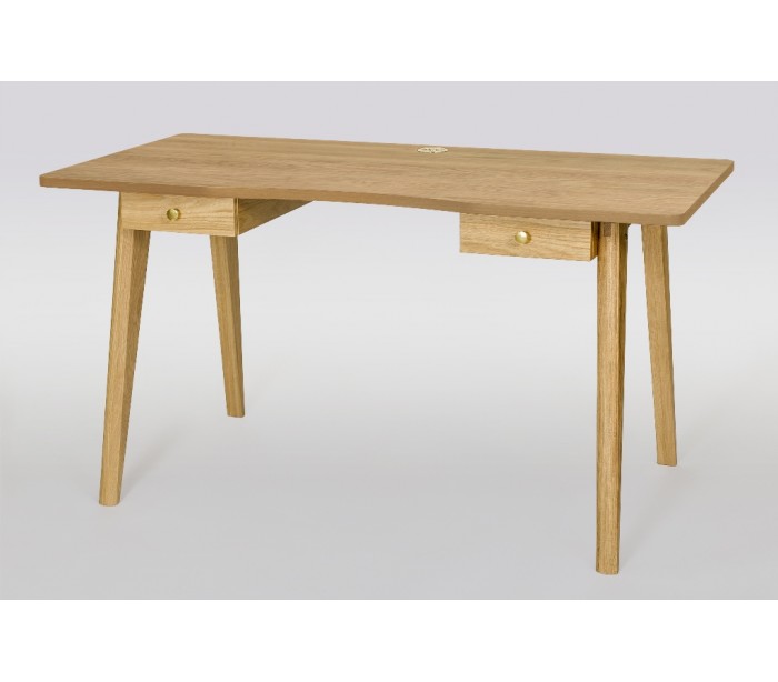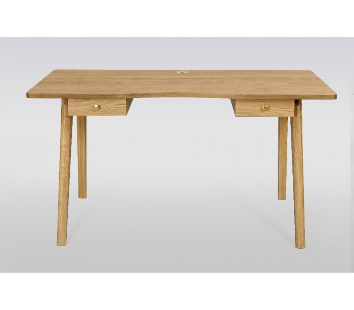 Skrivebord i et retro, men alligevel meget moderne design. Skrivebordet er udført i massiv eg og egefinér. Skrivebordet kommer med 2 skuffer og et kabelhul.