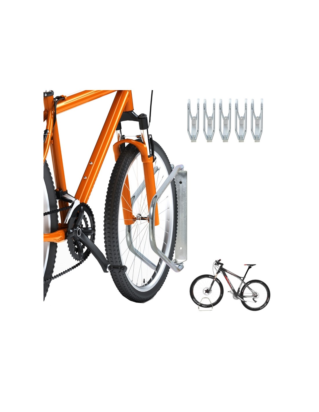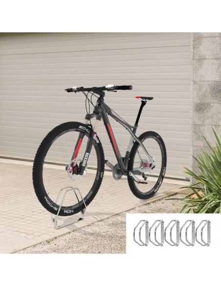 Cykelholdere udført i stål, som kan monteres på enten væg eller jord og holde op til 5 cykler. Holderne måler hver 29 x 32,5 x 8,2 cm.