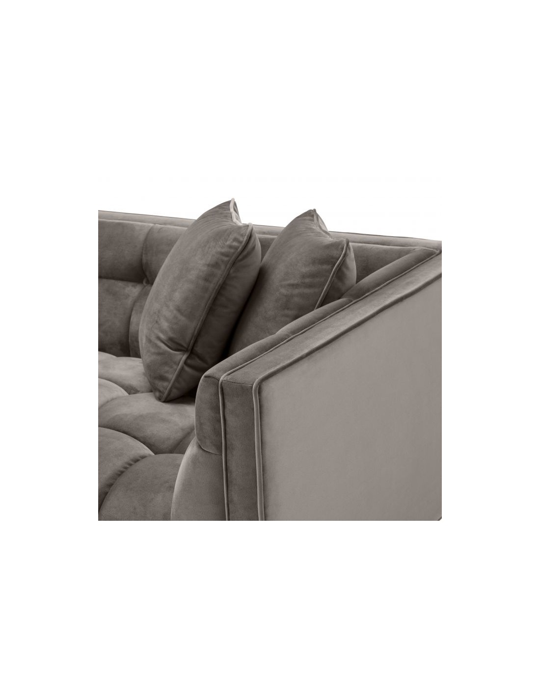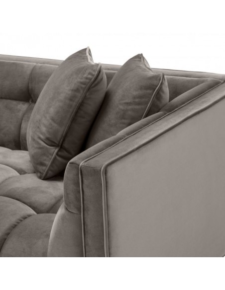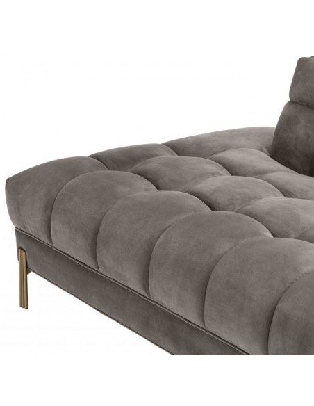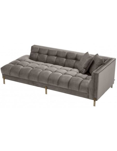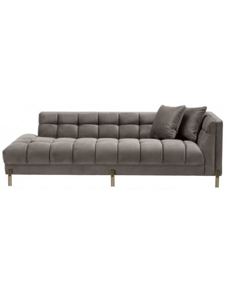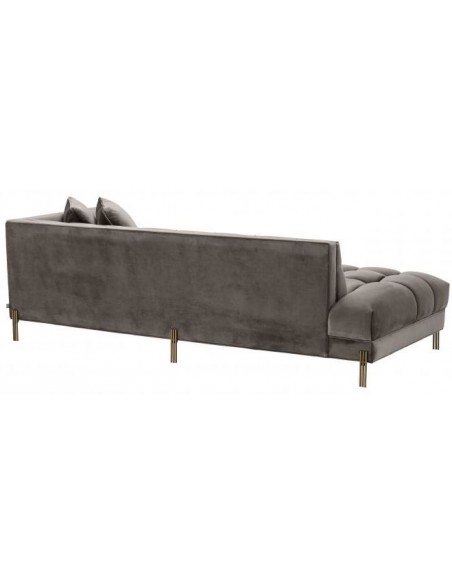 Eichholtz Sienna højrevendt daybed, udført i et design af børstet messinglakeret stål og grå velour. Daybedden måler 68 cm i højden over ryggen og 223 x 95 cm i bredde og dybde. Sidde/liggehøjden er 43 cm.