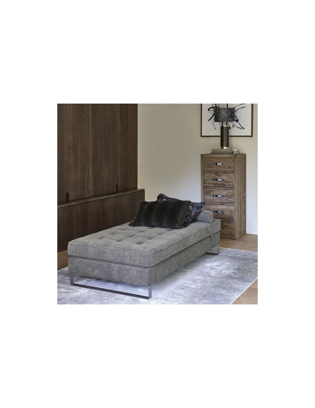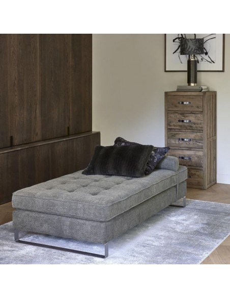Riviera Maison daybed udført i et design af grågrøn polyester. Møblet måler 44 cm i højden og 185 x 93 cm i bredde og dybde.
