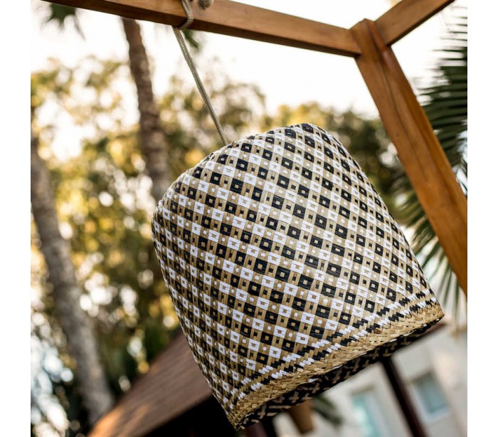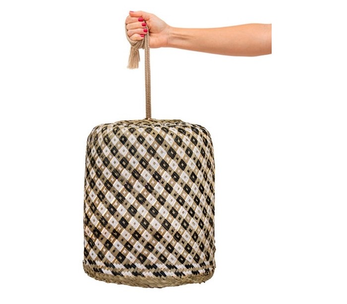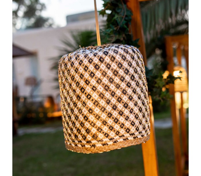 Dekorativ udendørs loftlampe fremstillet i mix farvet fiberflet. Lampen kommer med trådløs opladelig lyskilde, der oplades via USB stik. Lampen måler 35 cm i højden og 35 cm i skærmdiameter. Lampen har 3 meter reb.