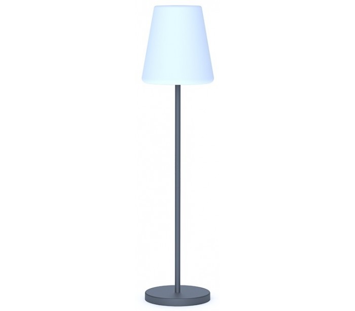 Dekorativ udendørs gulvlampe fremstillet i antracitlakeret metal og hvid polyethylene. Lampen kommer 4 meter ledning, der går direkte i almindelig stikkontakt. Lampen måler 119 cm i højden og 28 cm i skærmdiameter.