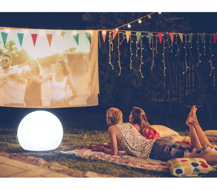 Dekorativ trådløs udendørs lampe fremstillet i hvid polyethylene, med fjernbetjening og RGB belysning med 256 farver. Lampen har 150 cm ledning til almindelig stikkontakt (AD/DC adapter). Lampen måler 55 cm i højden og 60 cm i skærmdiameter og er med indbygget LED lyskilde. Lampen kan også oplades via solceller.