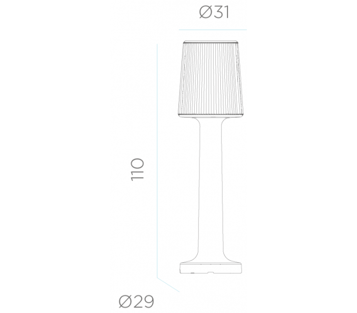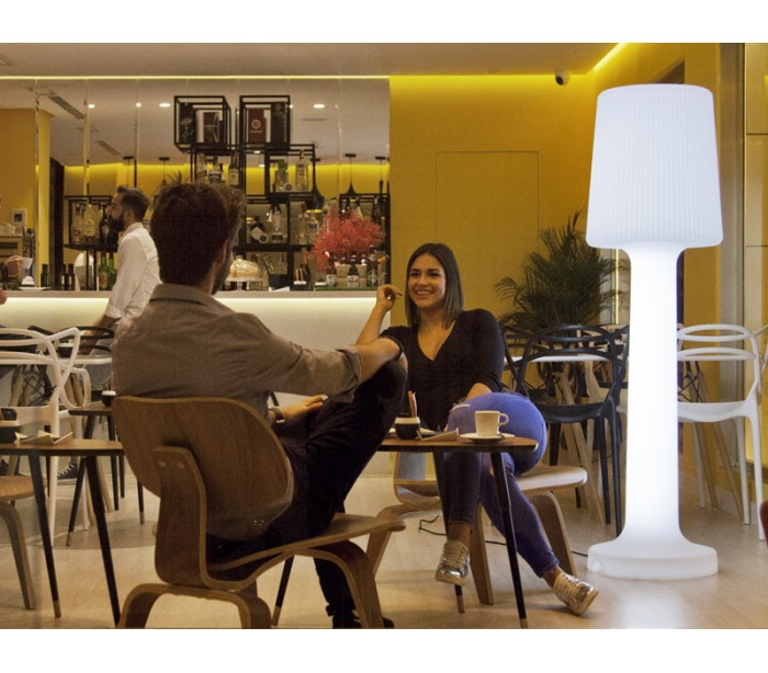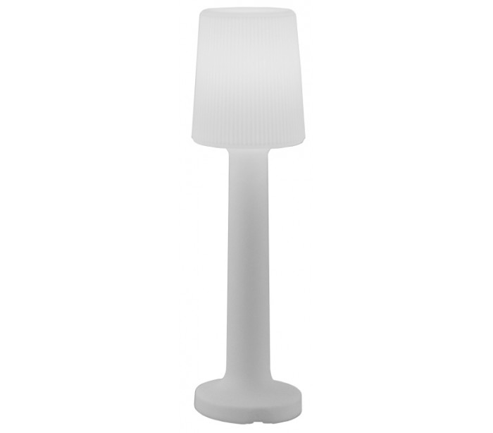 Dekorativ trådløs udendørs gulvlampe fremstillet i hvid polyethylene. Lampen oplades via AC/DC adapter, der går direkte i stikkontakten og er med 1,5 meter ledning. Lampen måler 110 cm i højden og 31 cm i skærmdiameter.