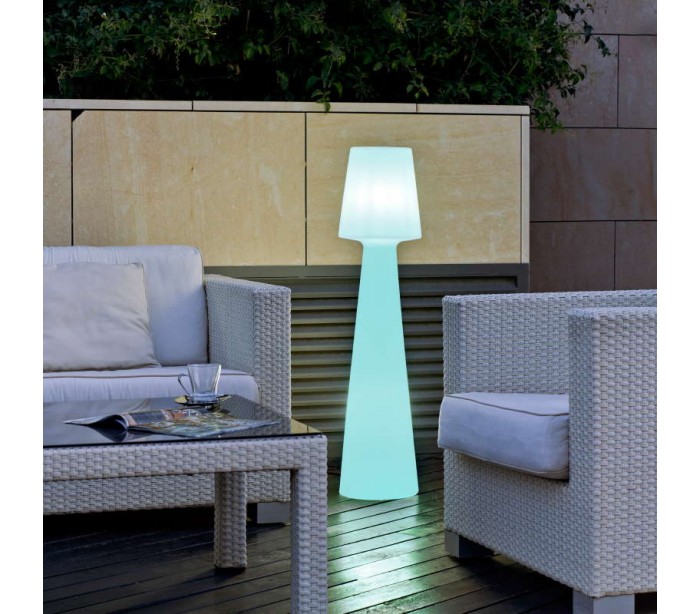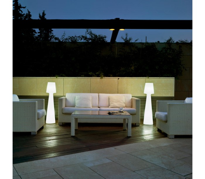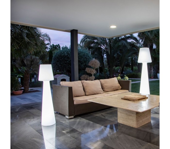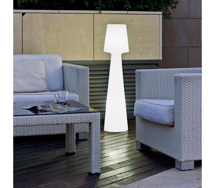 Dekorativ trådløs udendørs gulvlampe fremstillet i hvid polyethylene. Lampen oplades via AC/DC adapter, der går direkte i stikkontakten og er med 1,5 meter ledning. Lampen måler 110 cm i højden og 26,5 cm i skærmdiameter.